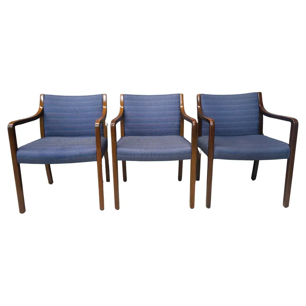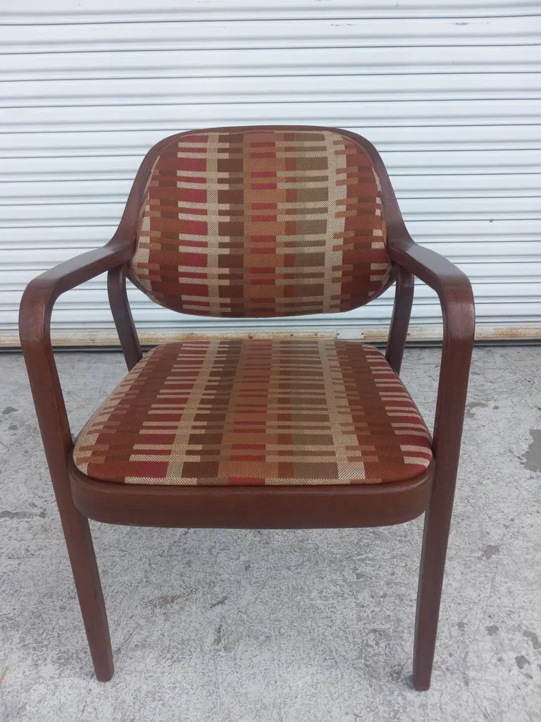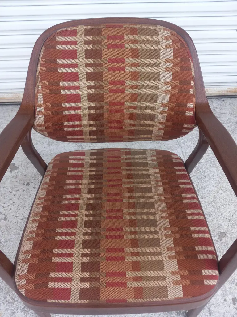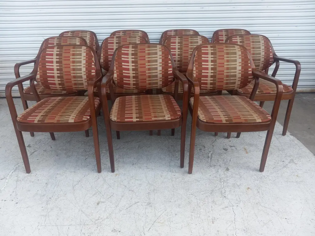 This is a nice set of chairs by Don Petit for Knoll International. They have bentwood arms and a nice Knoll fabric. There are (11) chairs available.