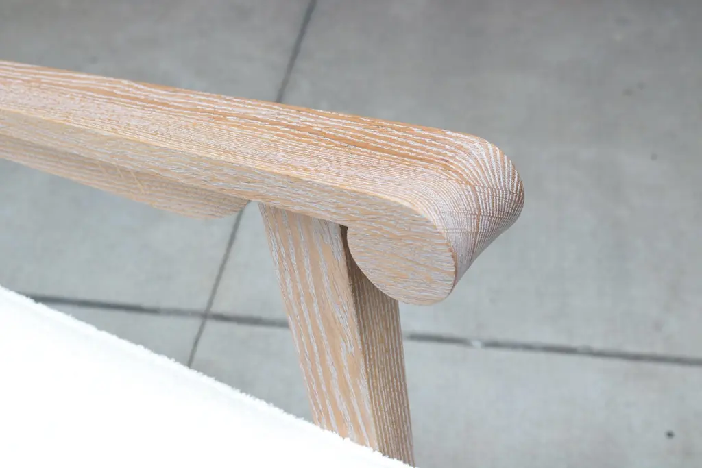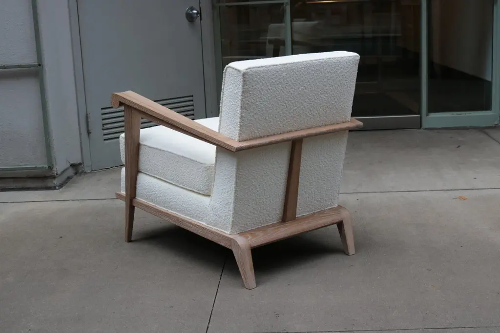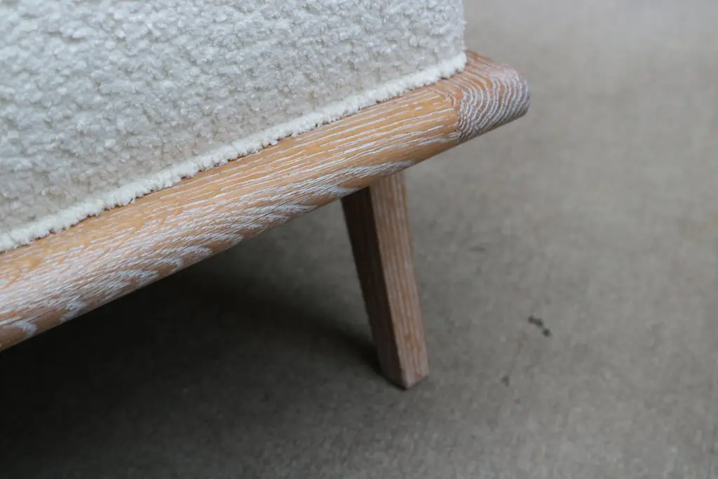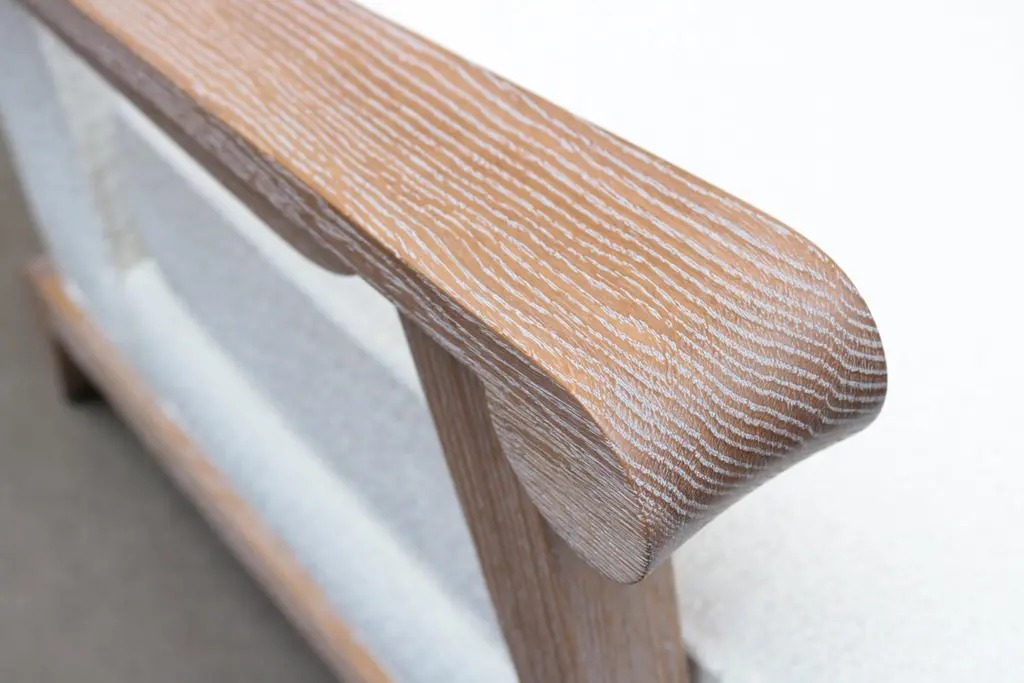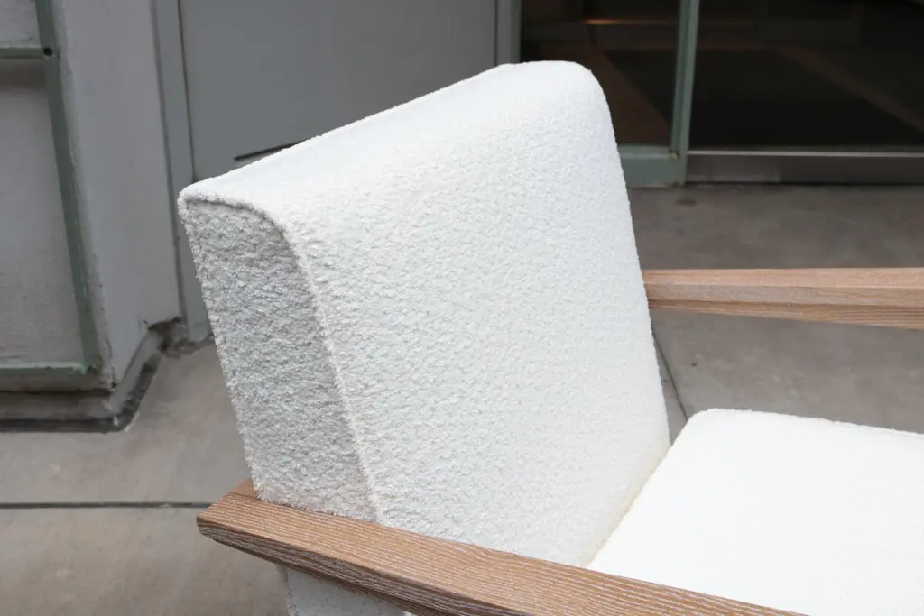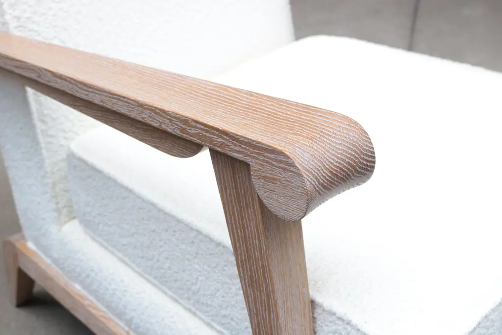 A pair of contemporary French modernist style armchairs. Cerused oak frame with boucle style fabric.