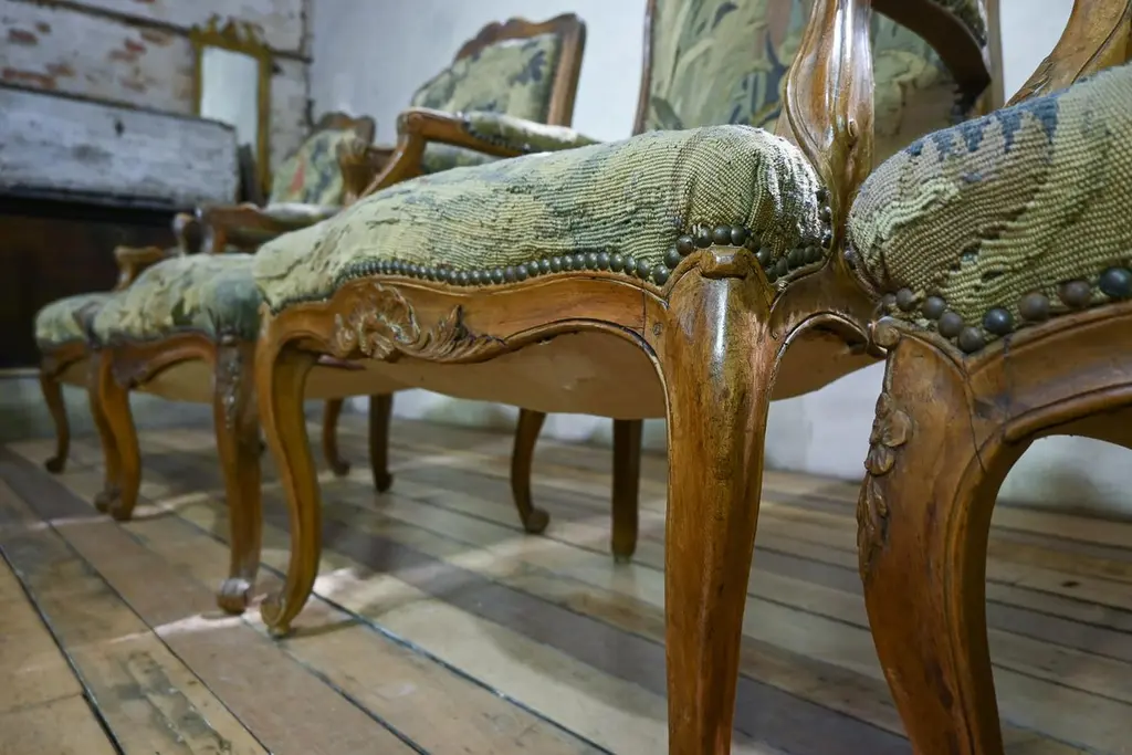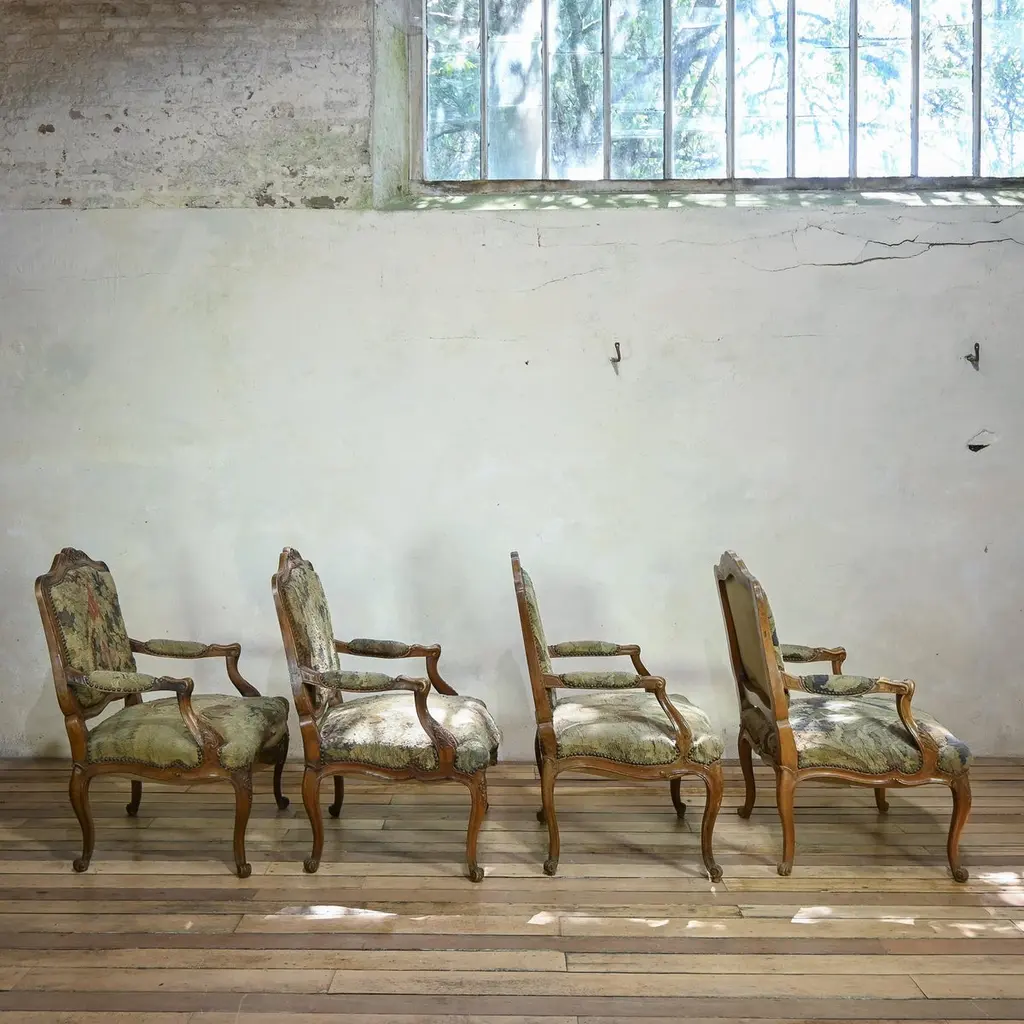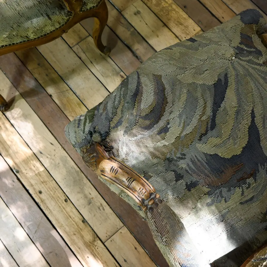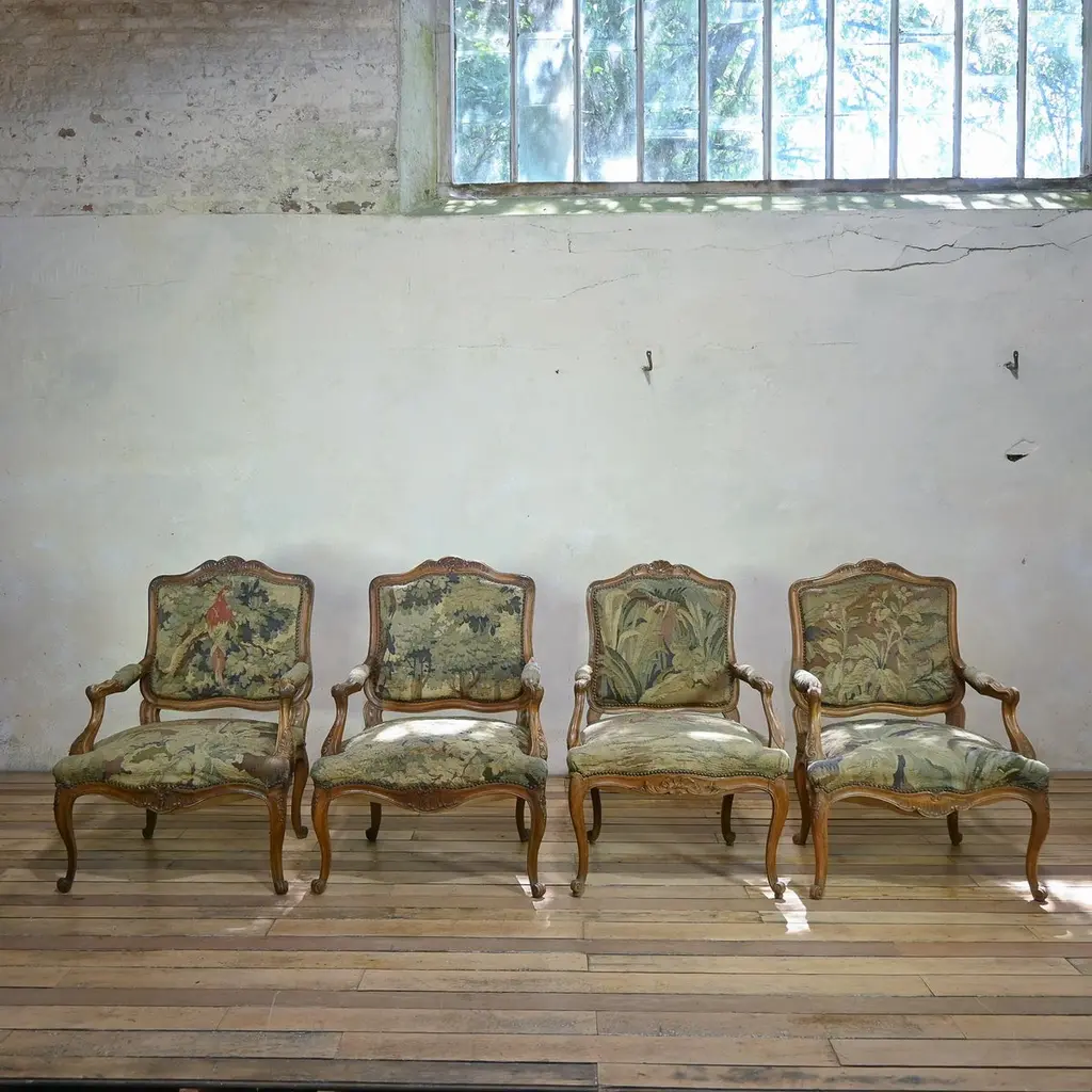 Price per chair - Four 19th-century French Louis XV style Fauteuils are graced with open armchairs, showcasing exquisite Aubusson Tapestry upholstery. Their cartouche-shaped backs boast ornate foliate scroll cresting, harmonizing with the equally elegant foliate scroll arm supports and serpentine padded seats. Upholstered in 18th-century Aubusson tapestry, these chairs depict picturesque landscapes adorned with lush foliage and bordered by graceful reeds and trees. While each chair's size varies slightly, all feature leaf-carved arms and front rails, elegantly elevated on cabriole legs. Pair -Height - 96.5 cmWidth - 70 cmDepth - 70 cmSeat Height - 46 cm Smaller chair - Height - 96cm Width - 67cm Depth - 64cm Larger chair - Height - 96cm Width - 71cm Depth 70cm