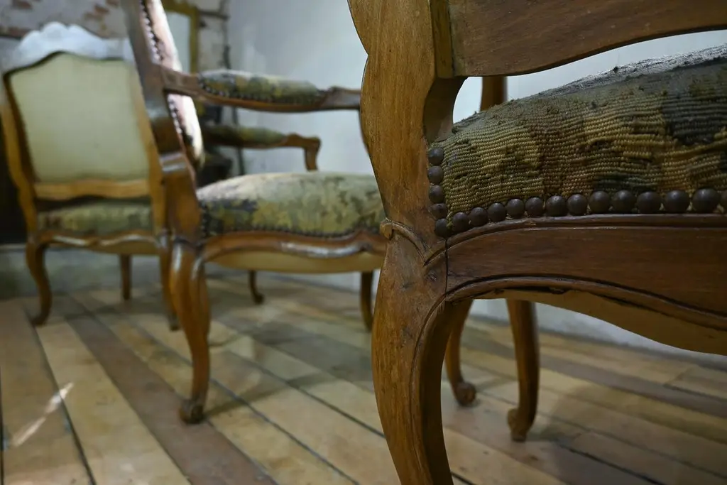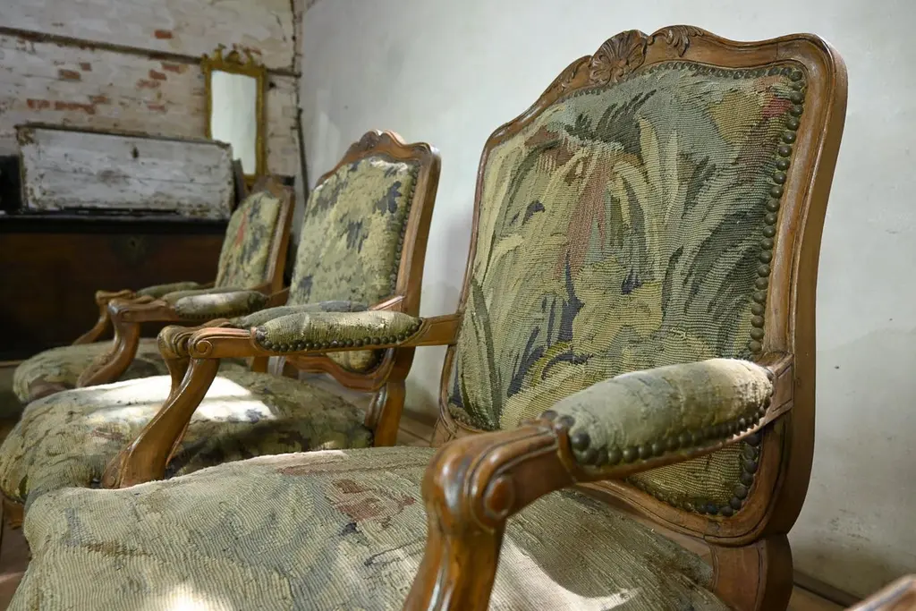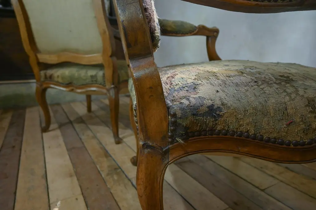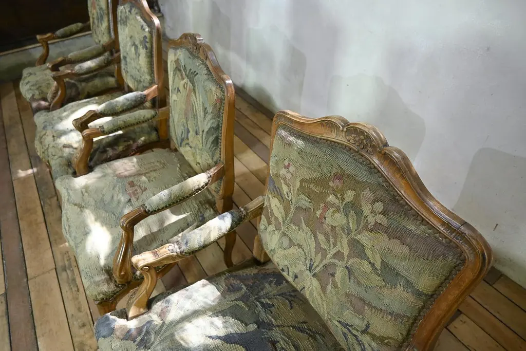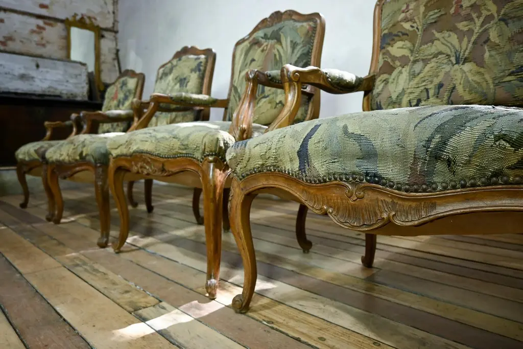 Price per chair - Four 19th-century French Louis XV style Fauteuils are graced with open armchairs, showcasing exquisite Aubusson Tapestry upholstery. Their cartouche-shaped backs boast ornate foliate scroll cresting, harmonizing with the equally elegant foliate scroll arm supports and serpentine padded seats. Upholstered in 18th-century Aubusson tapestry, these chairs depict picturesque landscapes adorned with lush foliage and bordered by graceful reeds and trees. While each chair's size varies slightly, all feature leaf-carved arms and front rails, elegantly elevated on cabriole legs. Pair -Height - 96.5 cmWidth - 70 cmDepth - 70 cmSeat Height - 46 cm Smaller chair - Height - 96cm Width - 67cm Depth - 64cm Larger chair - Height - 96cm Width - 71cm Depth 70cm
