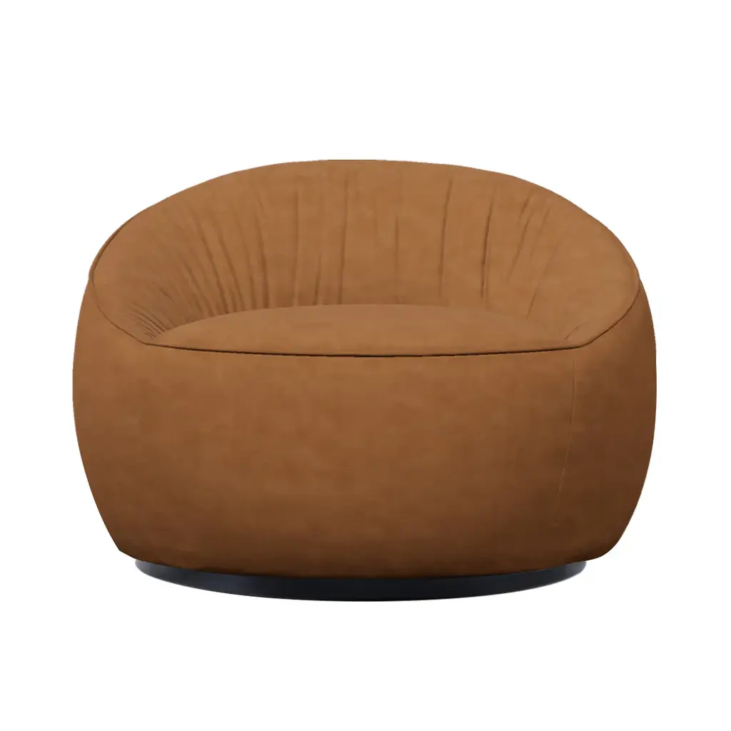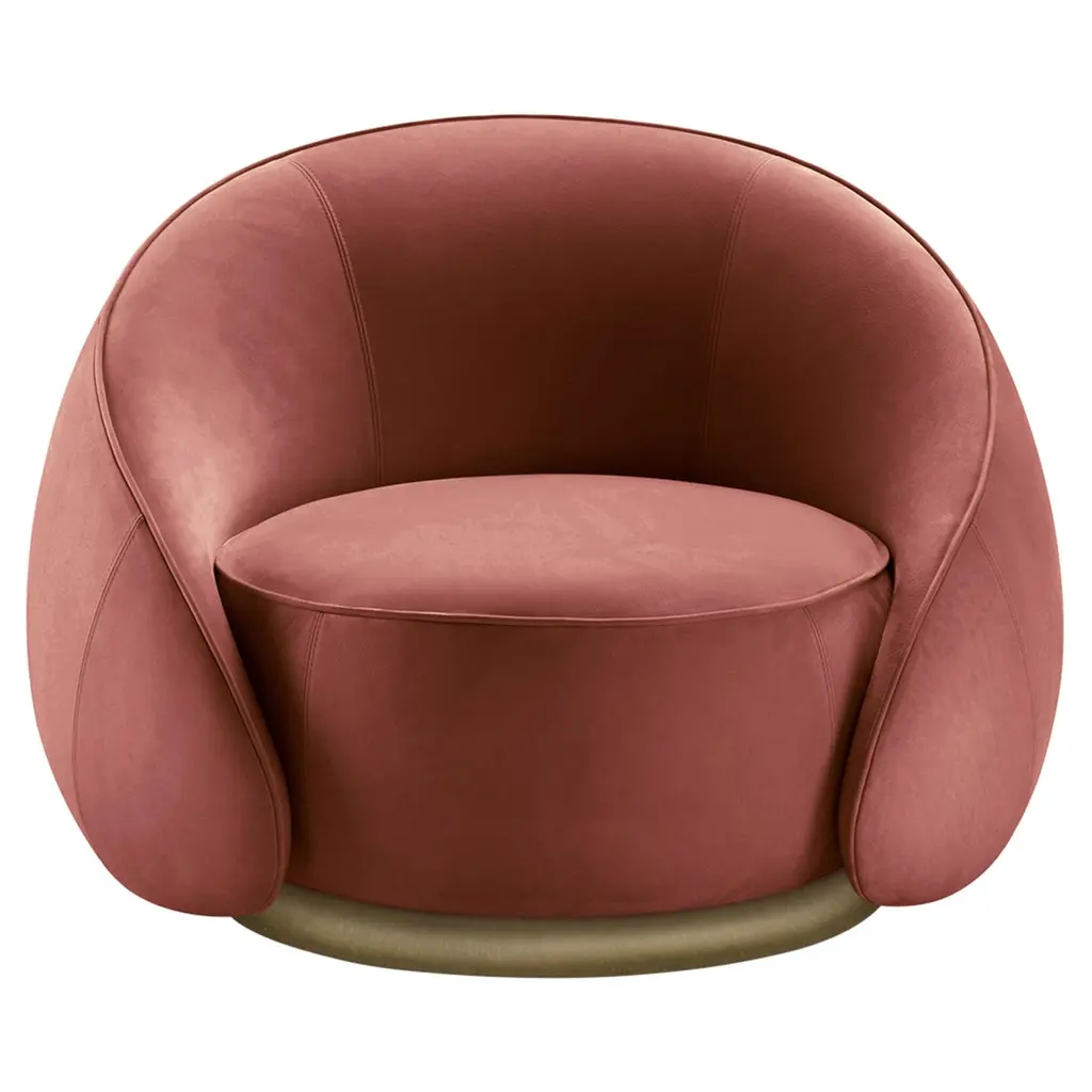 Marked by a charming and noble combination of materials and hues, this splendid armchair will make an opulent statement in an elegant interior, whether it be modern or traditional. Aptly named after the Italian word for "hug", it features an extremely soft and welcoming silhouette entirely upholstered in brown Nabuk leather, resting on a round brass base structure.