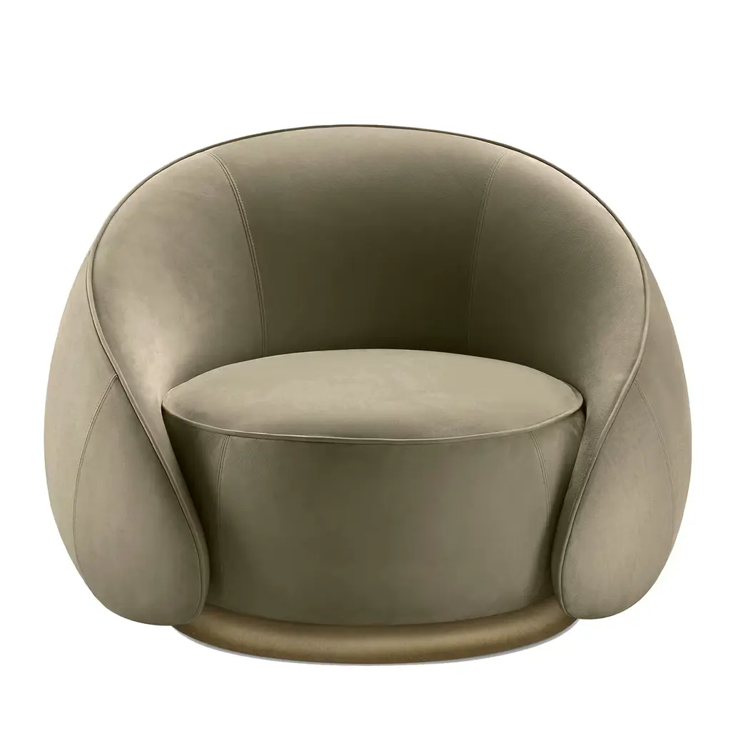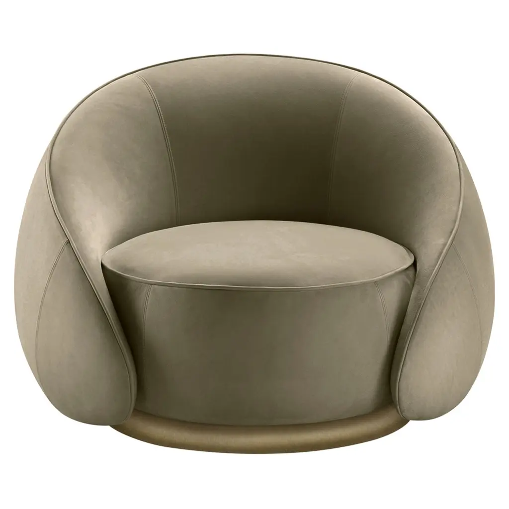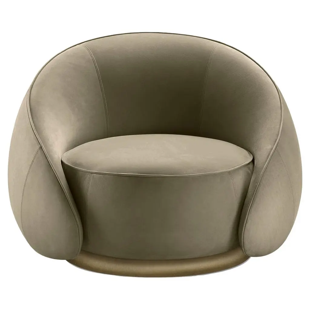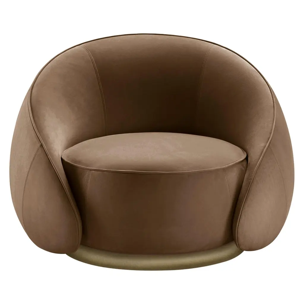 Marked by a charming and noble combination of materials and hues, this splendid armchair will make an opulent statement in an elegant interior, whether it be modern or traditional. Aptly named after the Italian word for "hug", it features an extremely soft and welcoming silhouette entirely upholstered in brown Nabuk leather, resting on a round brass base structure. For the US market, please contact the Concierge for CAL TB 117 certified fabrics.