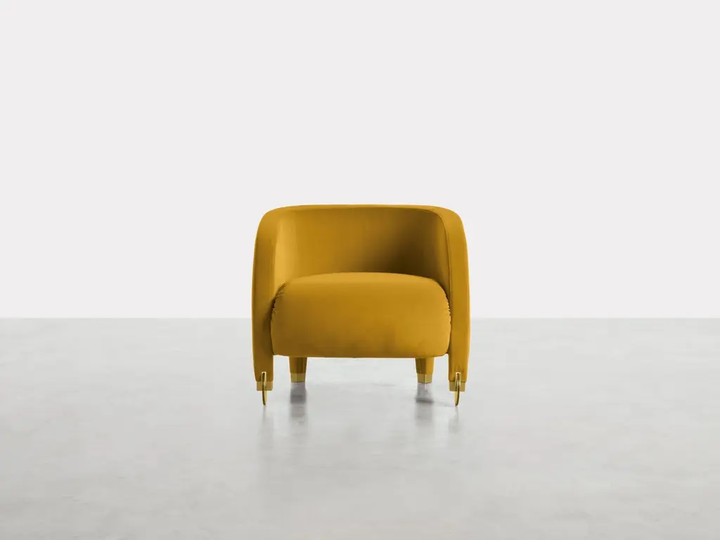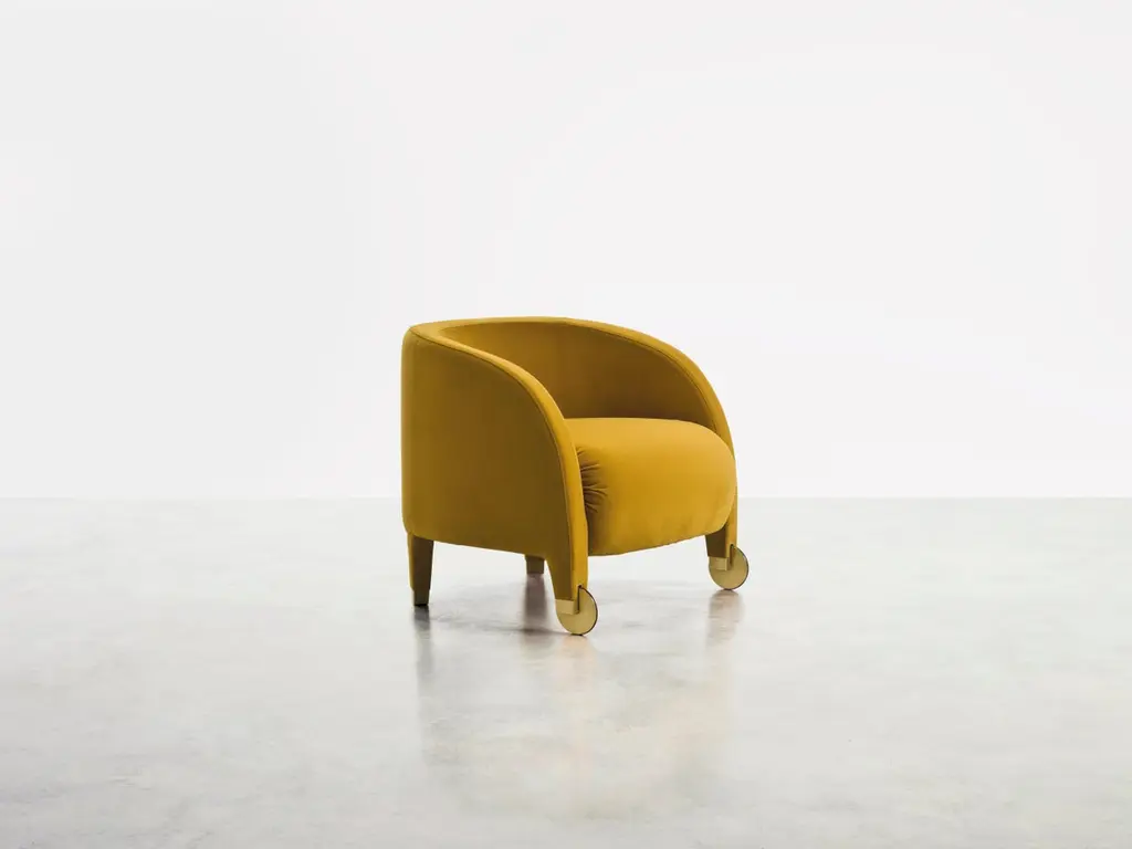 Adele Armchair by SomaschiniDimensions: W 68 x D 70 x H 62 cmMaterials: Solid wood and curved plywood structure padded with polyurethane foam in different densities. Pre-upholstery in polyester wadding, upholstery in fabric or leather covering. Wheels and tips in natural brass. Wheel with rubber gasket.Armchair in fabric Sunday Col.14, Natural brass wheelsAbout: Somaschini is a new-born brand, with a strong, innovative attitude, and rich artisan heritage in 1940s Brianza — a hard-working region of Lombardy, internationally renowned for the production of high quality design. It thrives, however, on new ideas and contemporaneity and never lapses into nostalgia but rather masters its own high craft. It shows a certain obstinacy in pursuing techniques honed over decades, preferring to make them speak through new languages. Hence it challenges tradition with a bold, intelligent, and confident approach.
