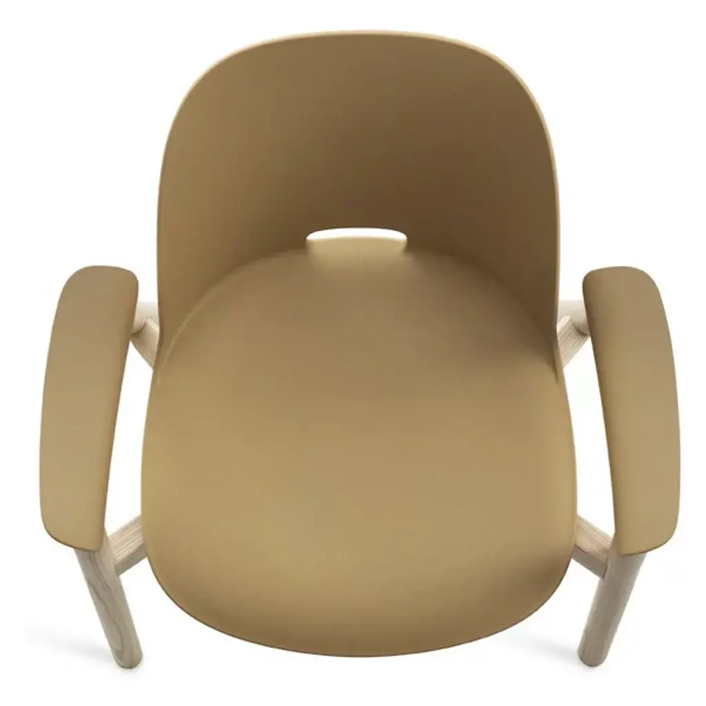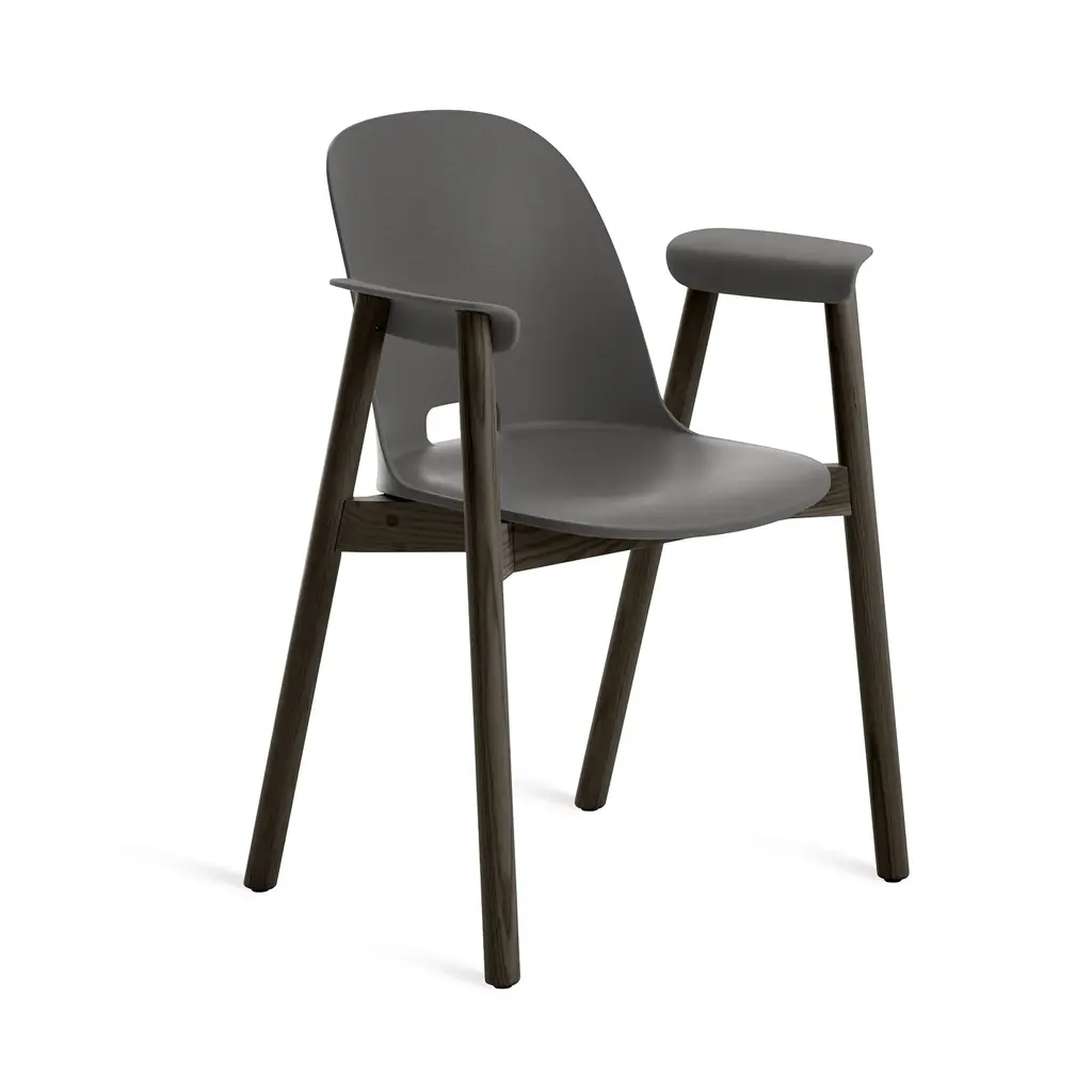 Bring an industrial look to your home décor with the Alfi Armchair by Emeco. This chair is eco-friendly and includes soft plastic (TPU) glides. A reclaimed wood polypropylene seat and back work in tandem with a durable frame of ash wood. The eye is drawn to your seatback’s rounded curves that complement the armchair’s elongated legs. The chair’s armrests inwardly turn, enhancing this furnishment’s artistic quality. The Alfi armchair is the creation of designer Jasper Morrison, whose works are engineered for comfort. Morrison’s fascination with detail gives his artworks an enduring sense of timelessness.