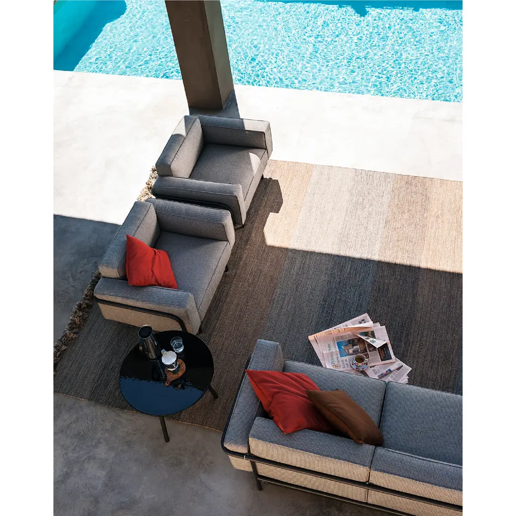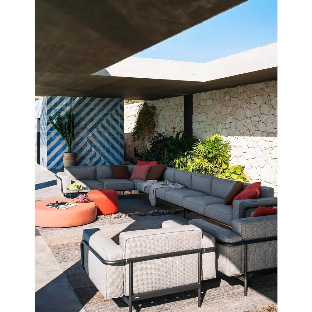 Introducing the Estendo Aluminum Framed Outdoor Armchair by Roda. Its sleek design, made with disappearing joints in the aluminum frame, offers flexibility and elegance. The welcoming and spacious seats, along with various configuration options, make it the perfect addition to any outdoor space. Complete the set with the matching coffee tables for a harmonious touch.