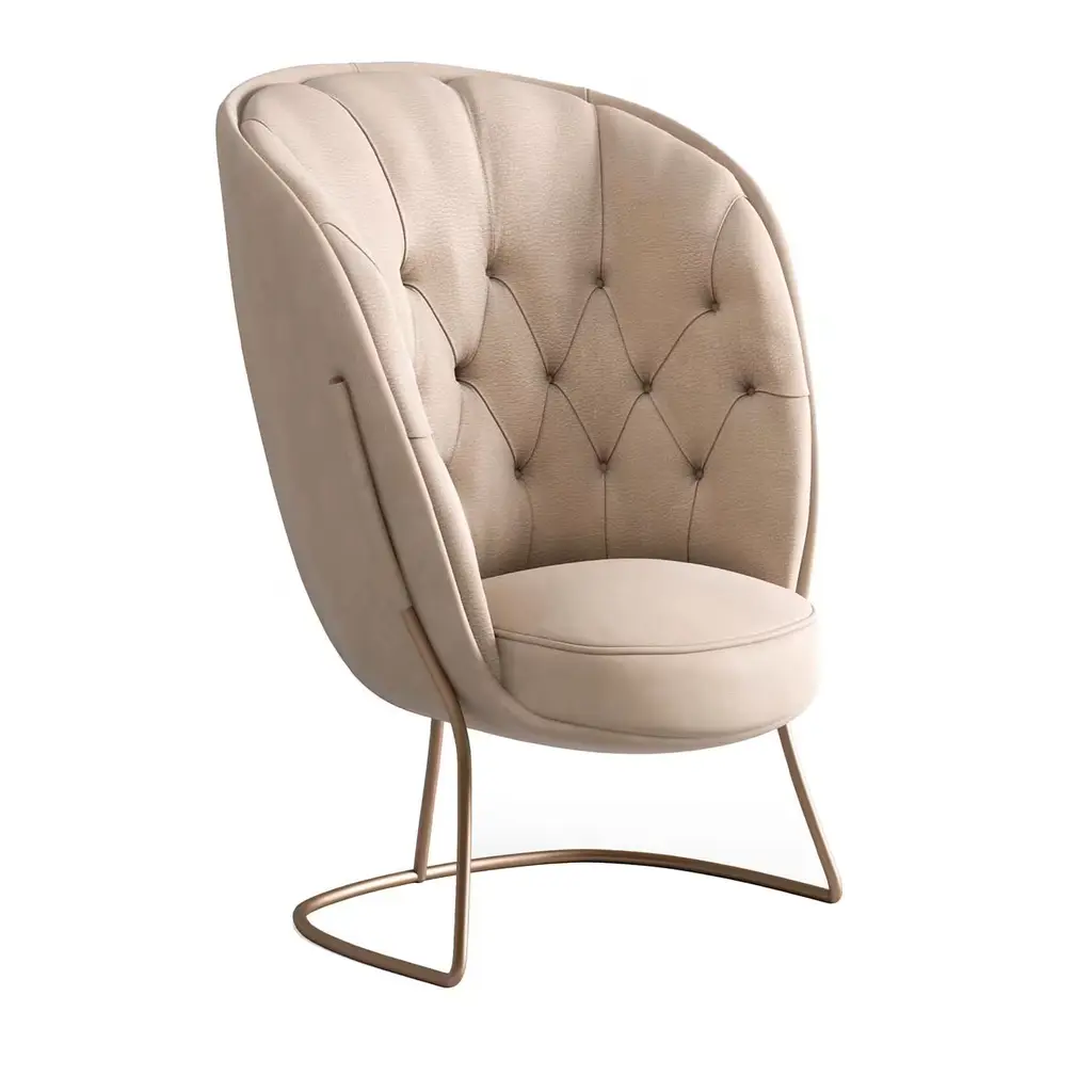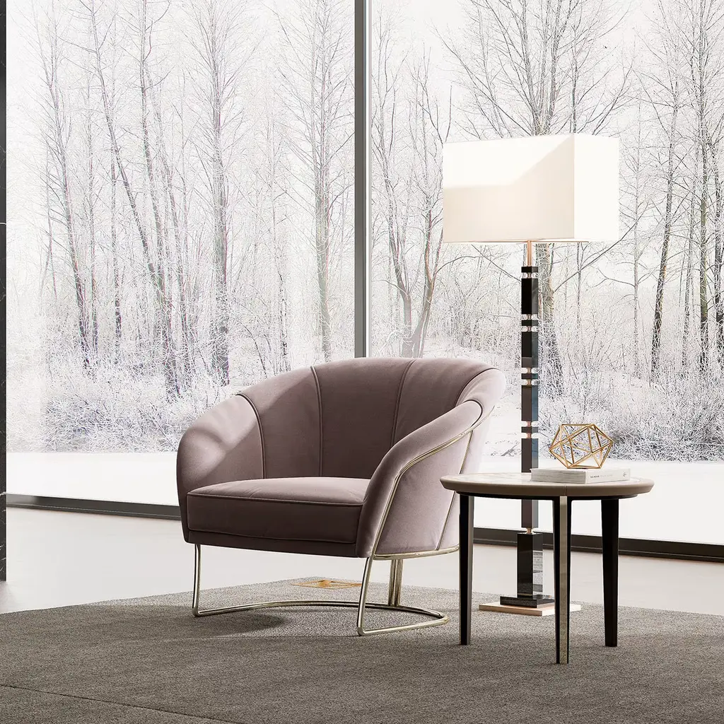 A nod to the ever-stylish Art Deco style, this sophisticated armchair boasts a semicircular polished metal base and a curved, enveloping silhouette upholstered in silky-soft powder pink velvet with channel seams. Offering a luxurious lounging solution, the multi-density polyurethane padding reinforced with memory foam elevates the level of comfort of this graceful, glamourous design that can be customized in other fabric and leather options upon request to the Concierge.