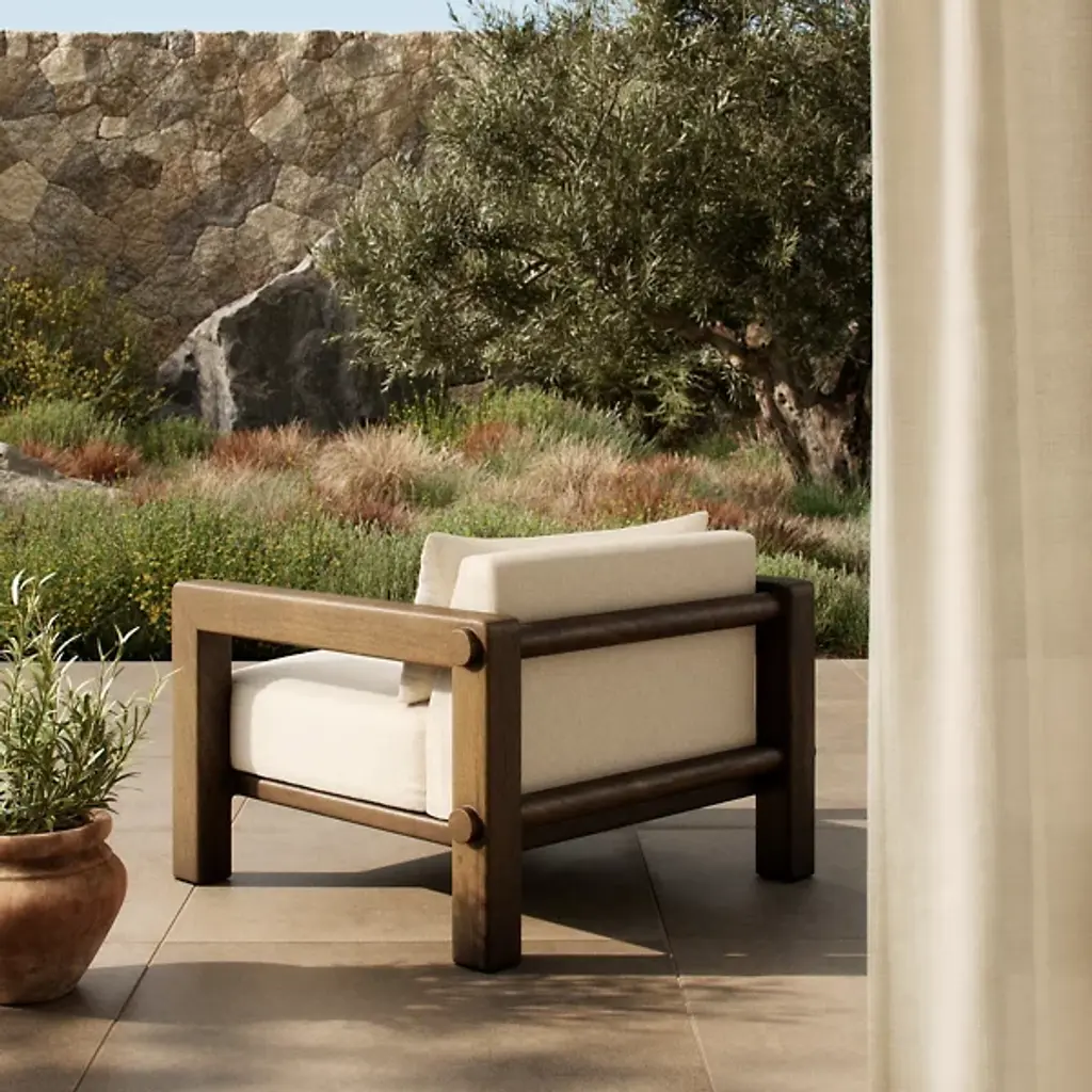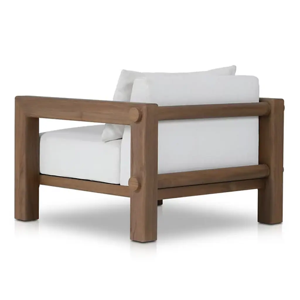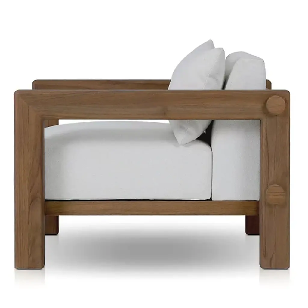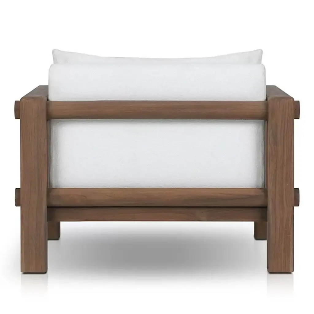The Amber Lewis x Four Hands Lumi Outdoor Armchair from Four Hands merges bold, blocky aesthetics with soft, sustainable materials. Crafted from solid FSC-Certified teak, its thick legs ensure durability and environmental friendliness. Upholstered in 100% hemp fabric and padded with a blend of polyurethane foam and polyester fiber batting, this chair offers both comfort and eco-consciousness. Designed to withstand outdoor conditions effortlessly, it exudes contemporary style while embodying elegance and sustainability. With its innovative design and environmentally friendly construction, the Lumi Armchair is the perfect choice for modern outdoor spaces, silvering with time and use.