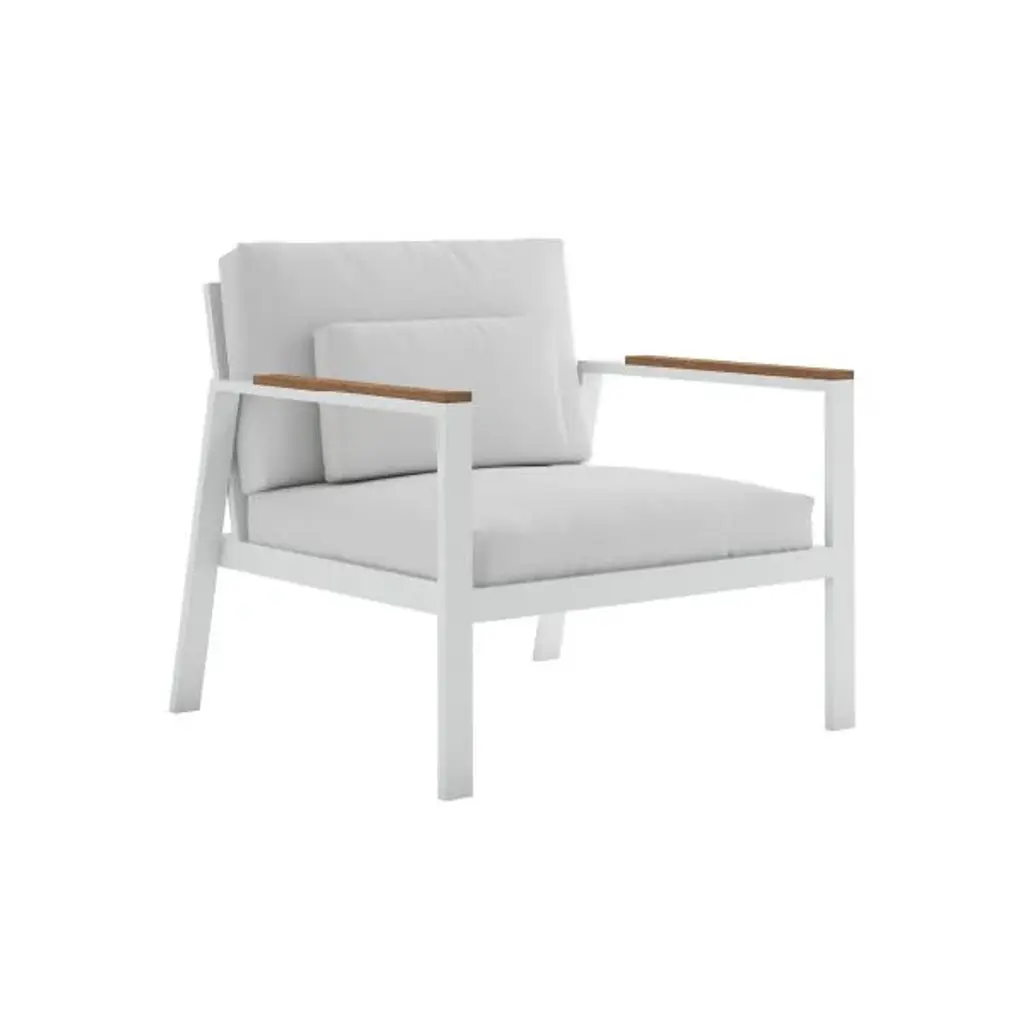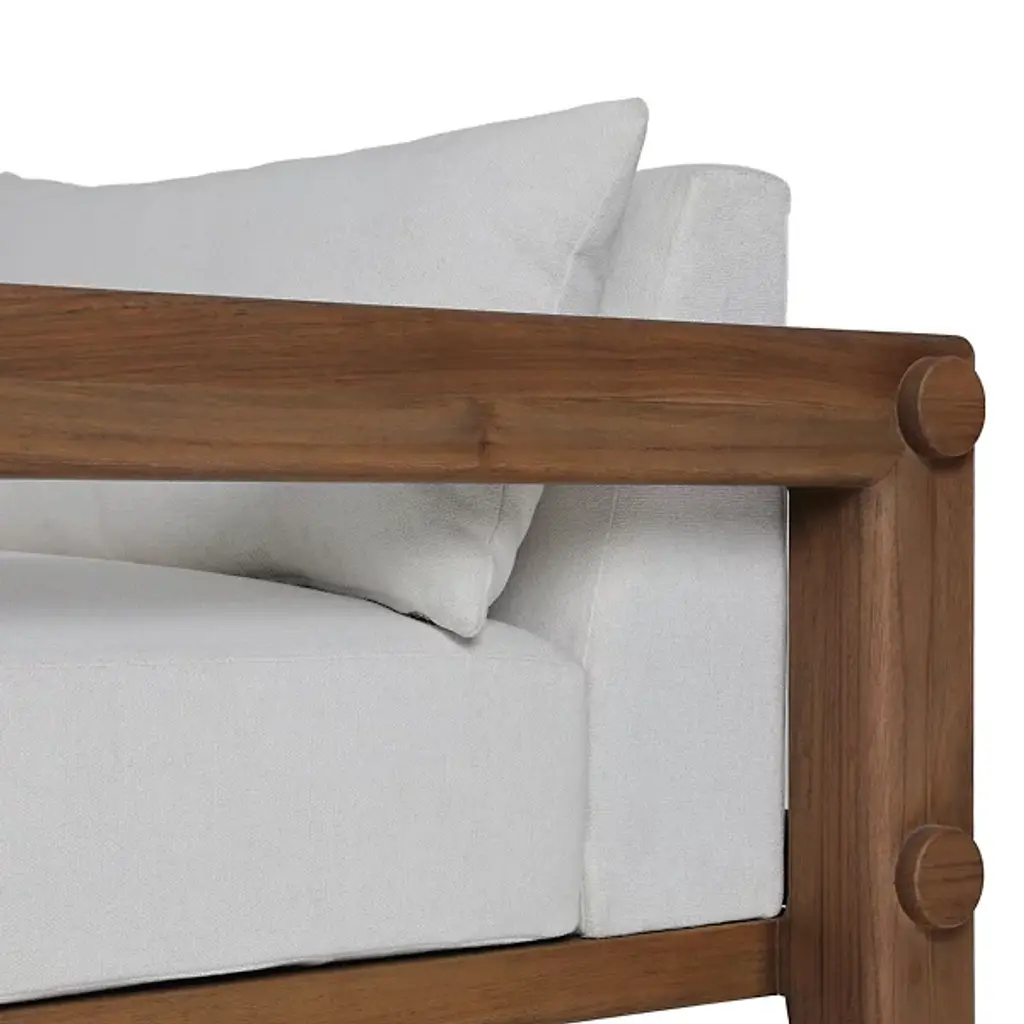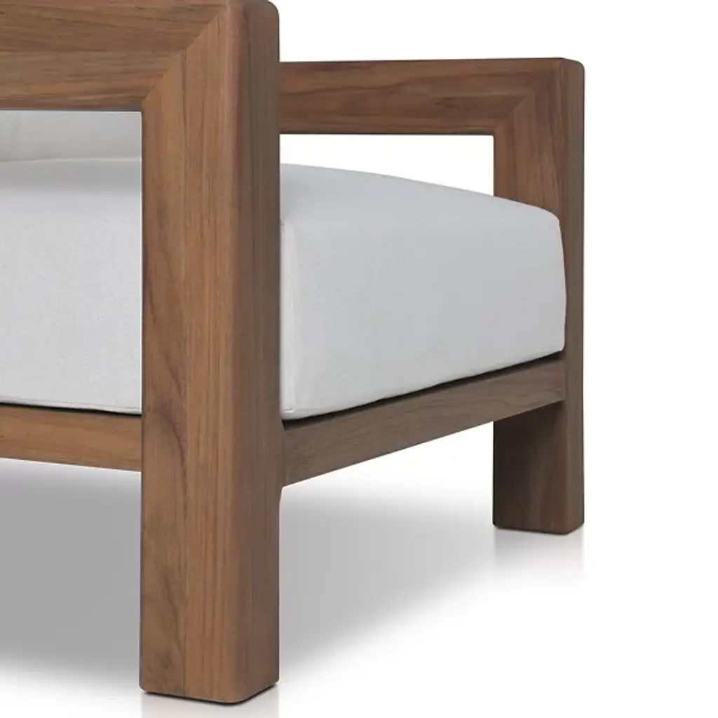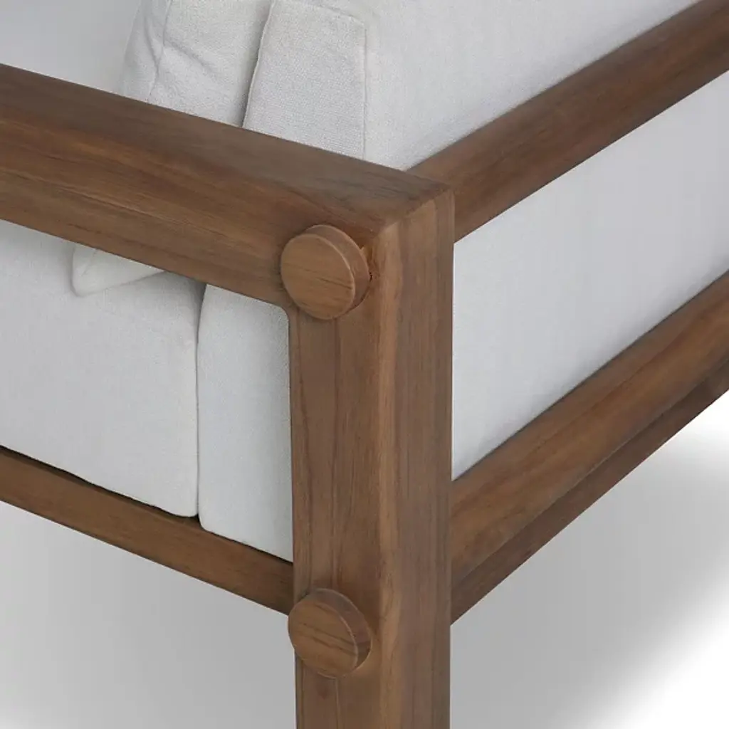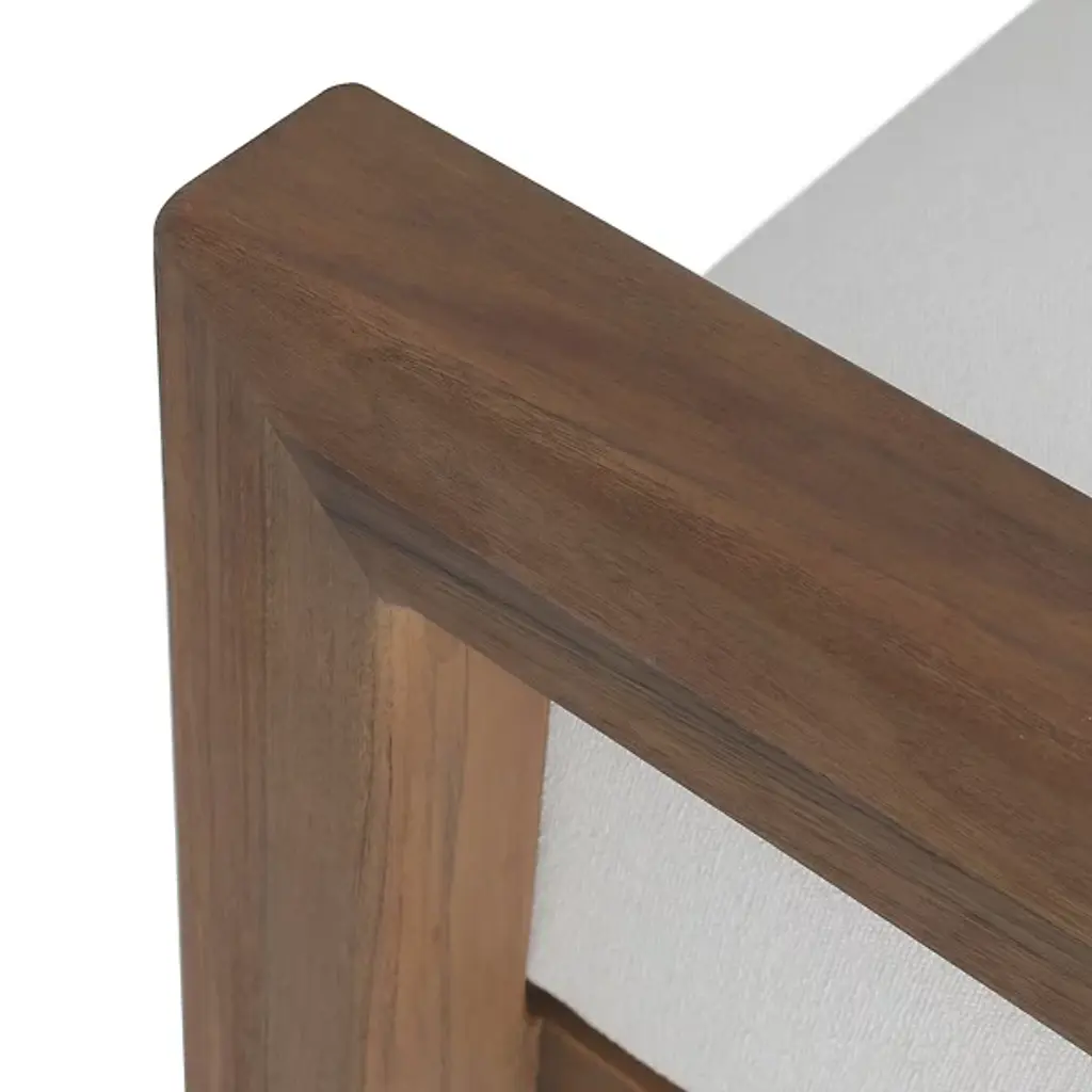The Amber Lewis x Four Hands Lumi Outdoor Armchair from Four Hands merges bold, blocky aesthetics with soft, sustainable materials. Crafted from solid FSC-Certified teak, its thick legs ensure durability and environmental friendliness. Upholstered in 100% hemp fabric and padded with a blend of polyurethane foam and polyester fiber batting, this chair offers both comfort and eco-consciousness. Designed to withstand outdoor conditions effortlessly, it exudes contemporary style while embodying elegance and sustainability. With its innovative design and environmentally friendly construction, the Lumi Armchair is the perfect choice for modern outdoor spaces, silvering with time and use.