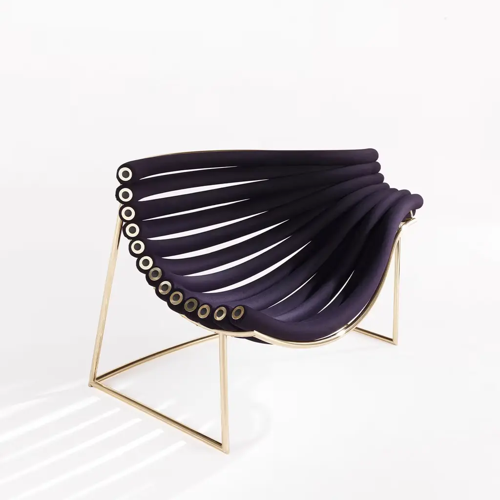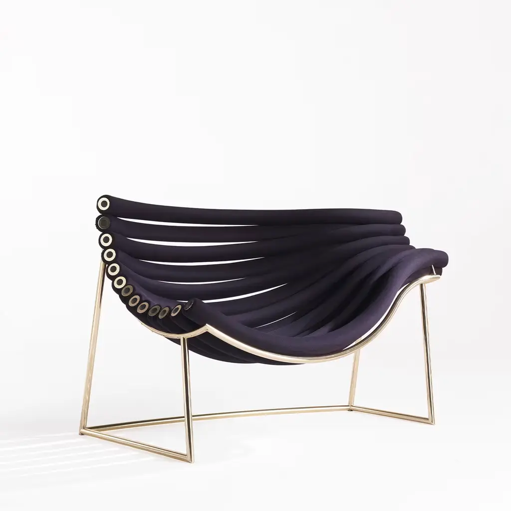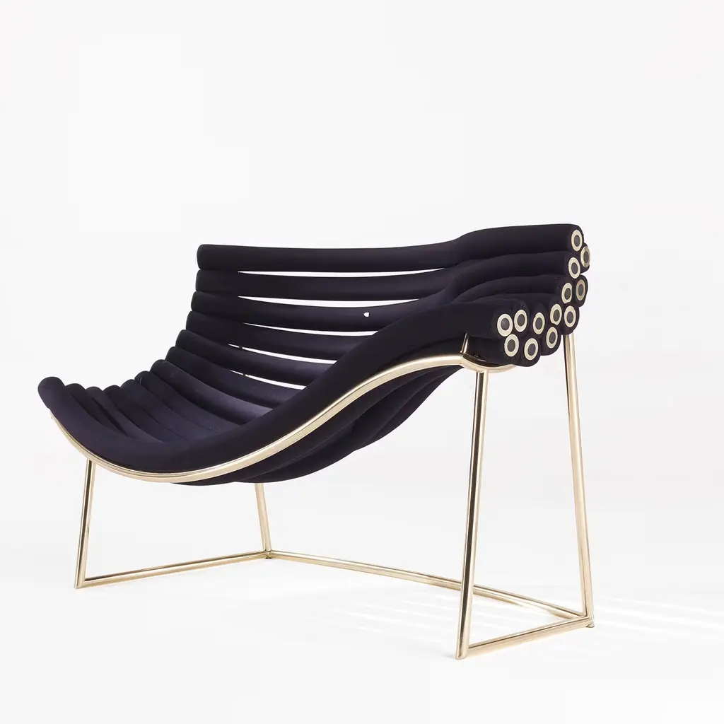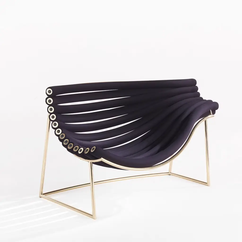 "Amedea is the materialization of the invisible, floating paths that connect our existences to an infinite system of emotions, places, and memories. Like in a revealing frame, these connections become visible, crystallizing in the sinuous curves that constitute the sitting and the back of this armchair and transforming the piece of furniture in an iconic, dynamic creation." Armchair with metal structure in glossy gold finishing. Seat with calendered metal tubes structure, each one covered with high-density polyurethane foam and upholstered in black soft elastic fabric. No variations Available.