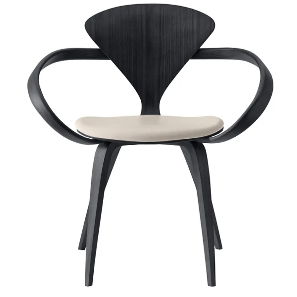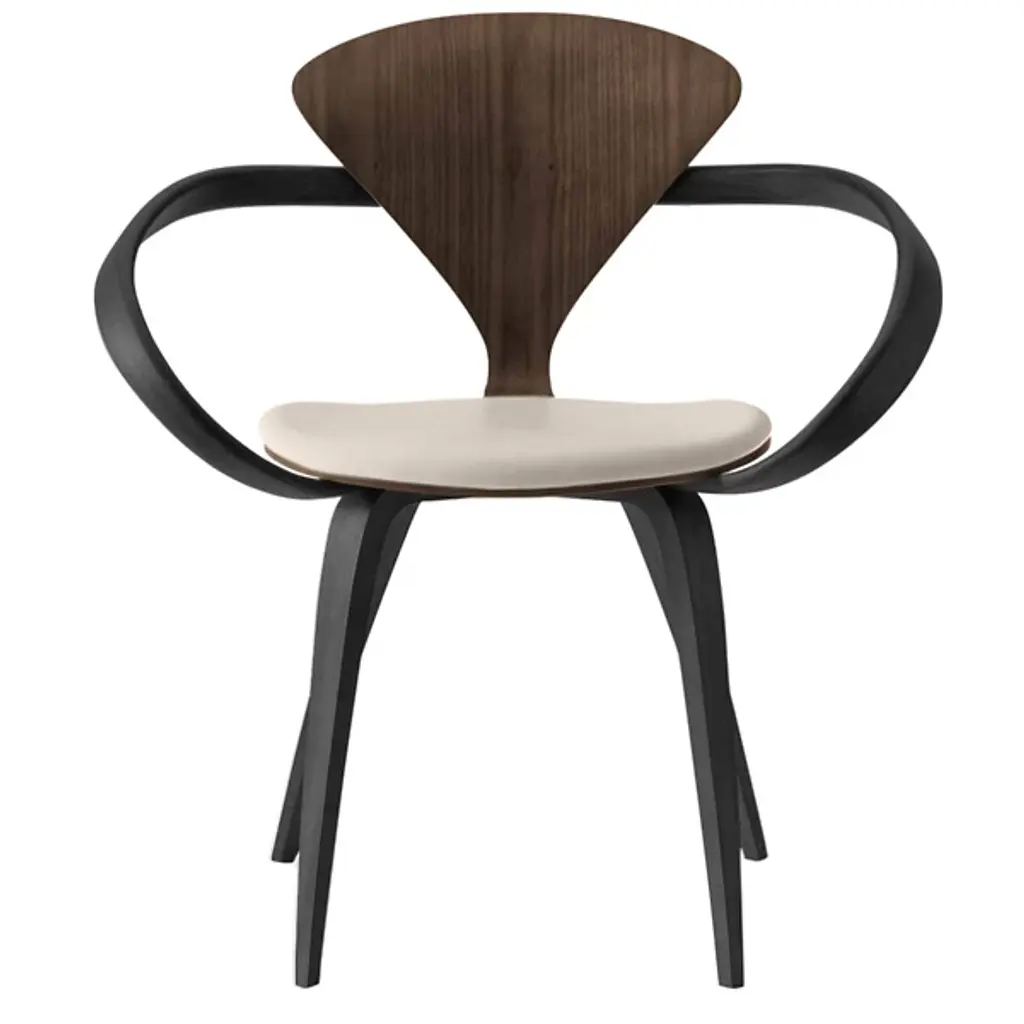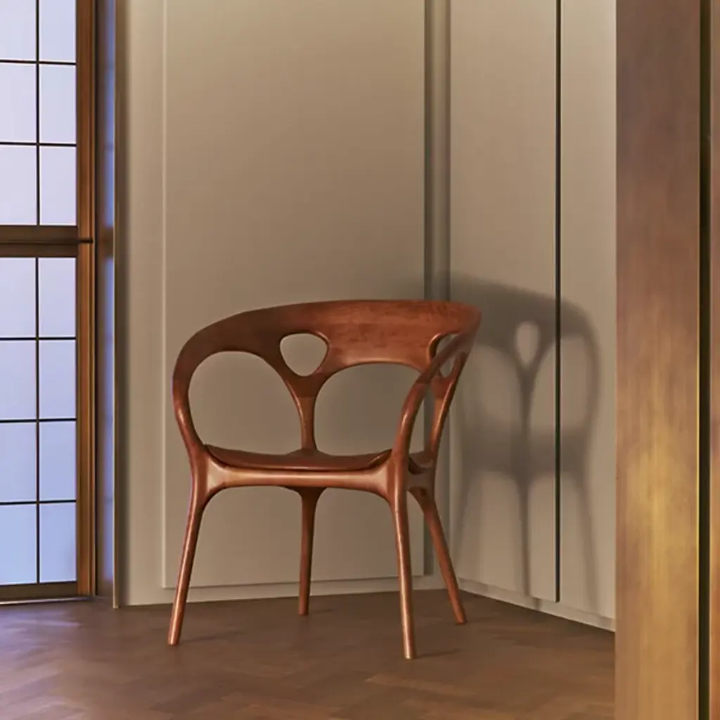 The Anne Armchair from Bernhardt Design reveals sculptural openings that punctuate its continuous wooden frame, creating negative space as a defining design element. Named for the company's founder, this piece demonstrates Ross Lovegrove's approach to shaping solid American walnut into flowing organic geometry. The wood's natural grain patterns become part of the visual narrative, while hand-rubbed oil applications preserve the material's inherent character. An upholstered seat with flange stitch detailing provides textural contrast against the carved wooden structure, completing the chair's considered balance of craft and comfort.