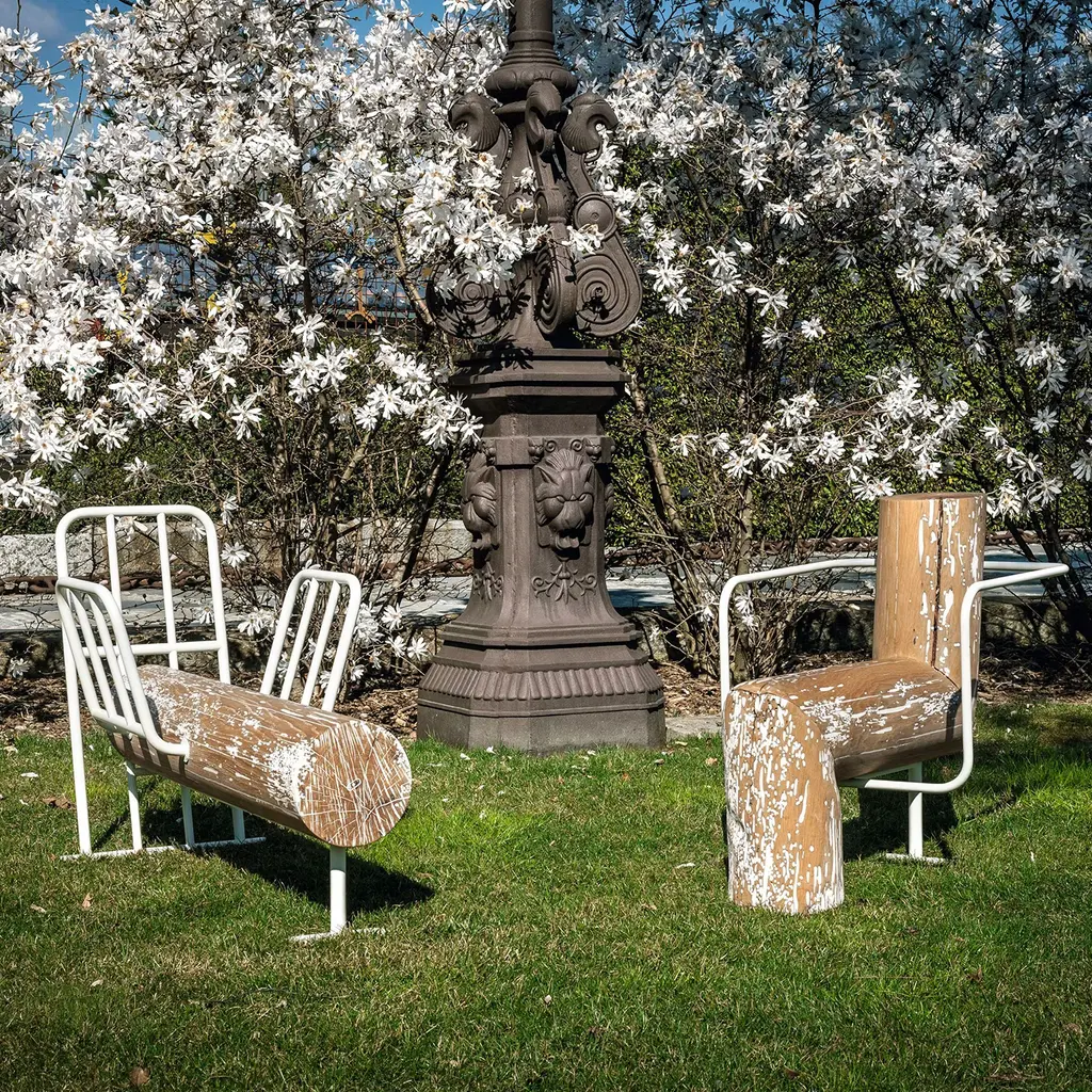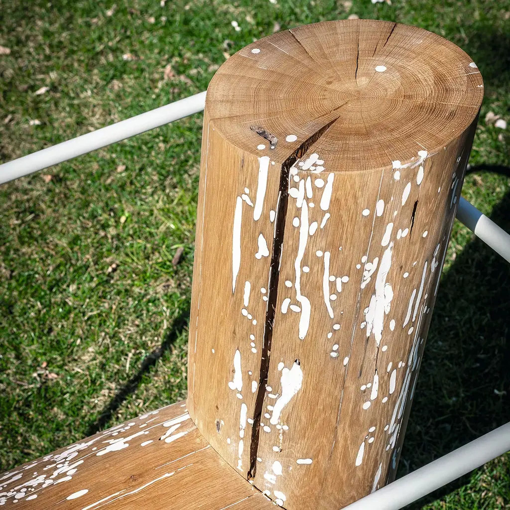Also available in the Lui (him) version, this armchair was conceived with anti-comfort and eccentricity in mind. Its sculptural look is owed to the rigorously sculpted profile of its briccola body - wood from the poles dotting the Venetian lagoon - its holes are leveled off with metallic white plaster. White-lacquered tubular elements - rear leg and armrests - complete the design.