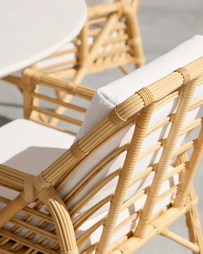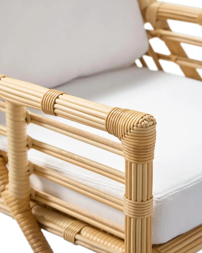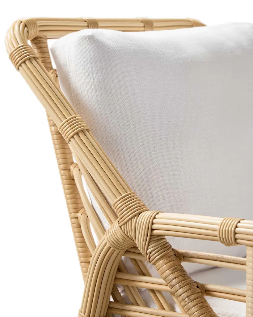 Grand scale. Sun basking comfort. An artful, open weave with a rattan sensibility. The striking frame adorned with white cushions.