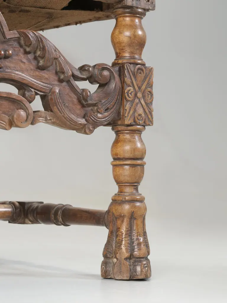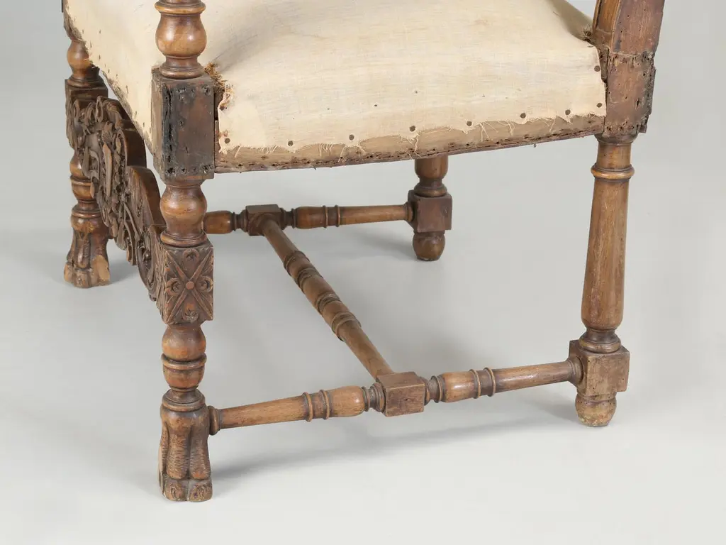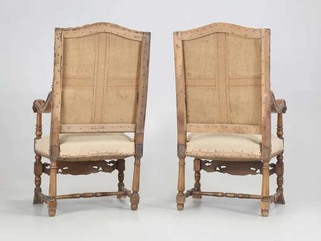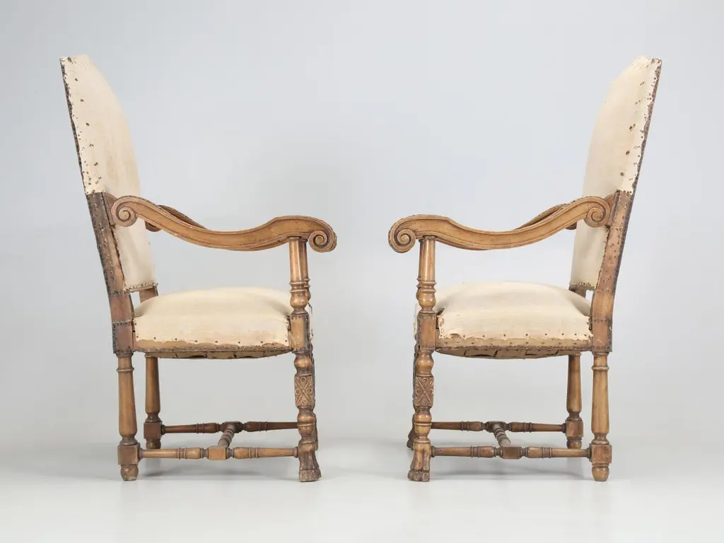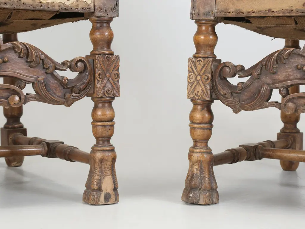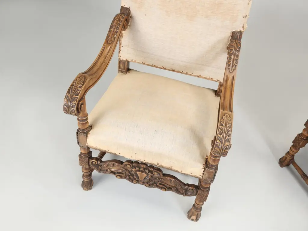 Antique Italian pair of Armchairs Hand-Carved from Walnut is desperate need of a full restoration. Currently, we have (2) pairs of Matching Italian Armchairs that all must have come out of the same Italian home and all (4) armchairs are in need of a full restoration, much like any all old chair. Priced accordingly.Please note missing pieces on feet, images 9, 10, 11, 12 and 14. Chairs need to be tightened.