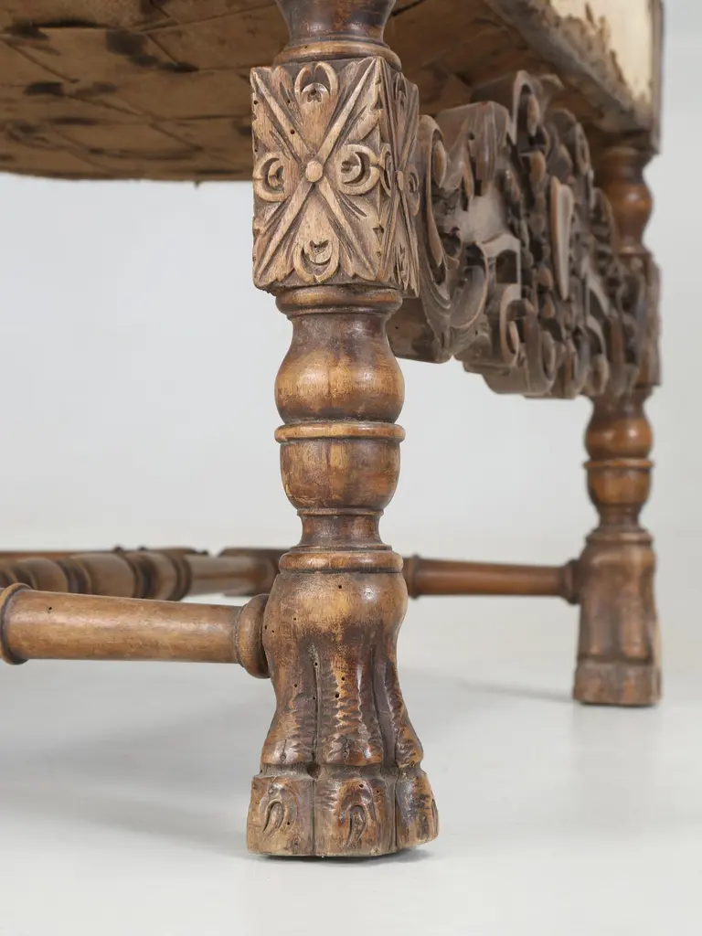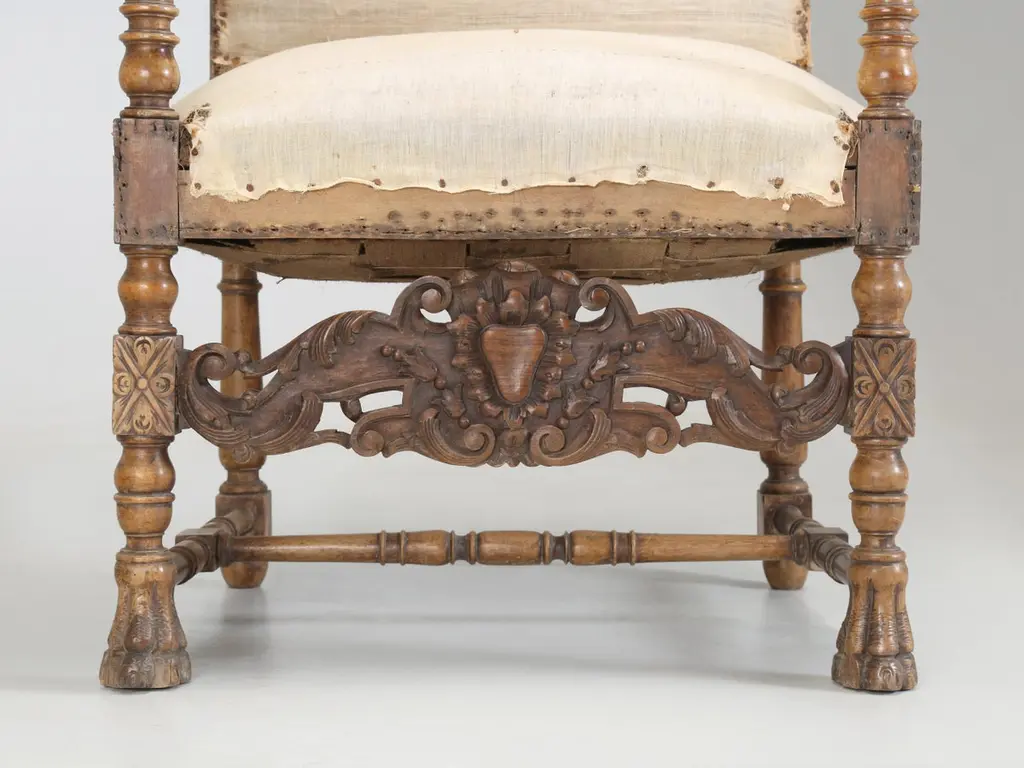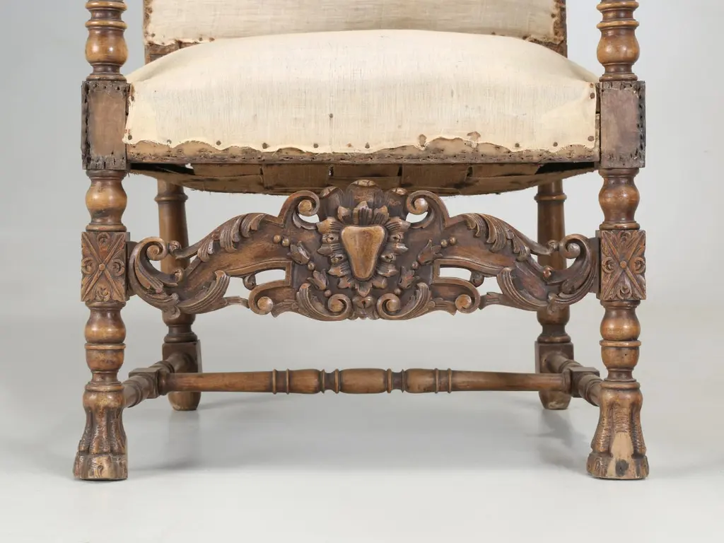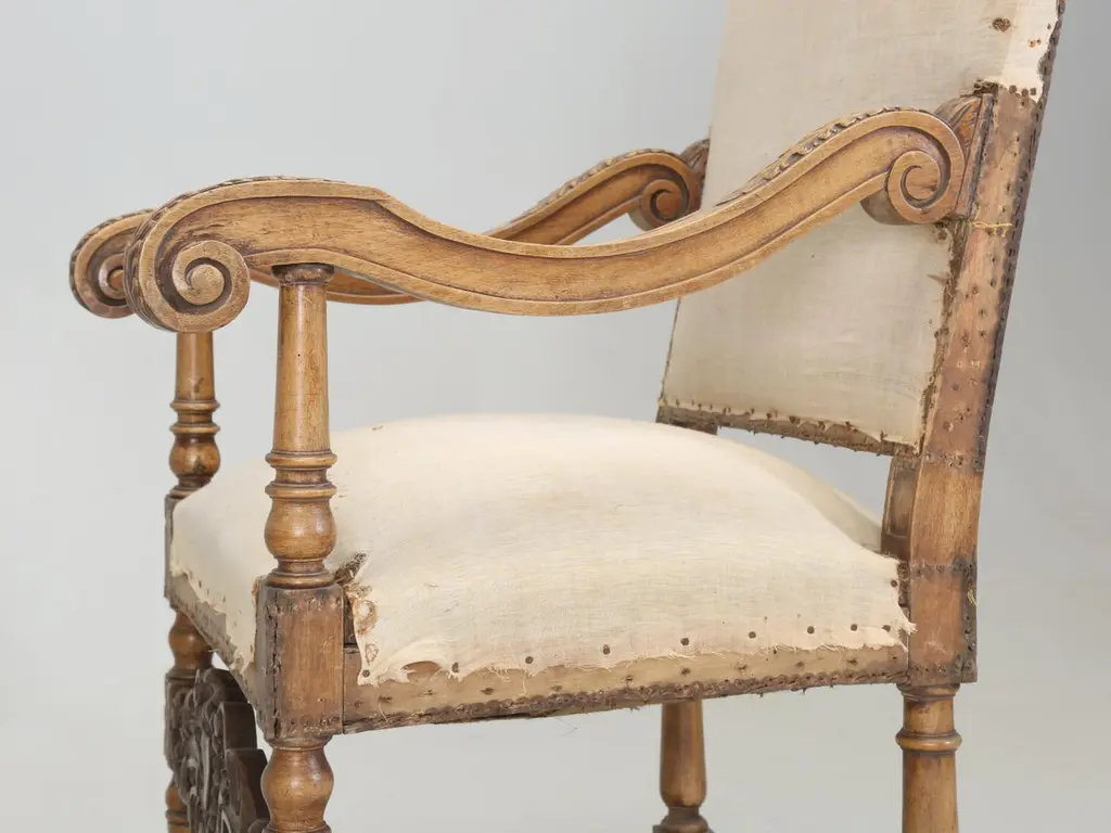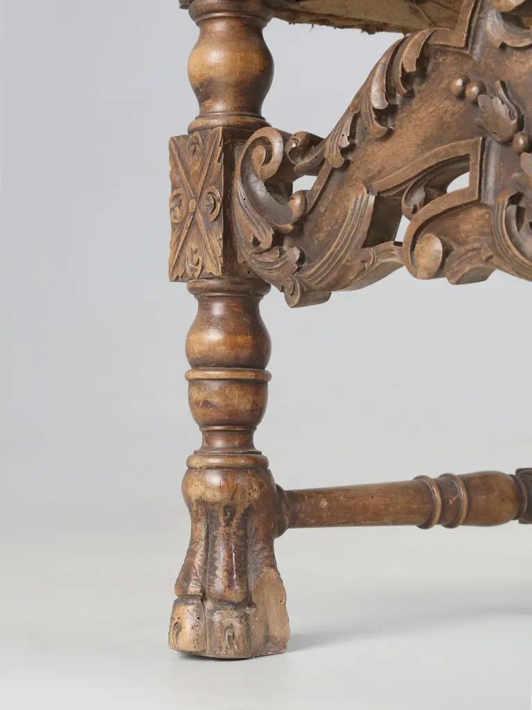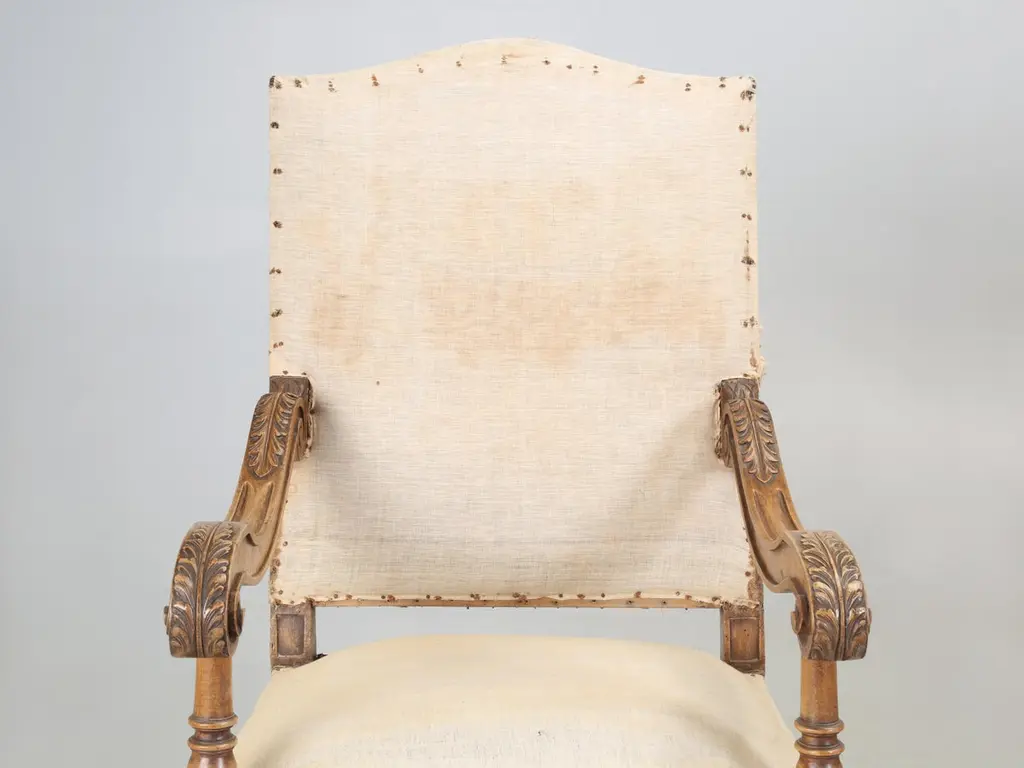 Antique Italian pair of Armchairs Hand-Carved from Walnut is desperate need of a full restoration. Currently, we have (2) pairs of Matching Italian Armchairs that all must have come out of the same Italian home and all (4) armchairs are in need of a full restoration, much like any all old chair. Priced accordingly.Please note missing pieces on feet, images 9, 10, 11, 12 and 14. Chairs need to be tightened.