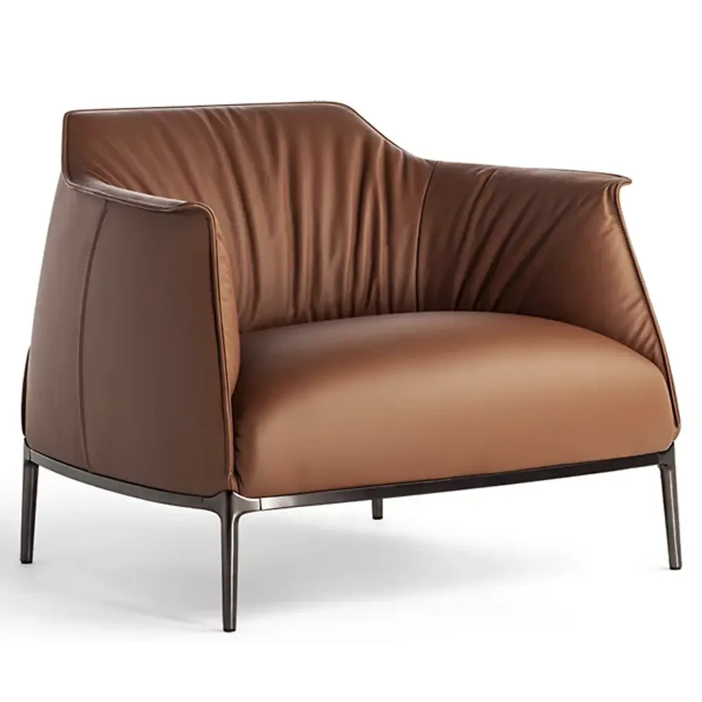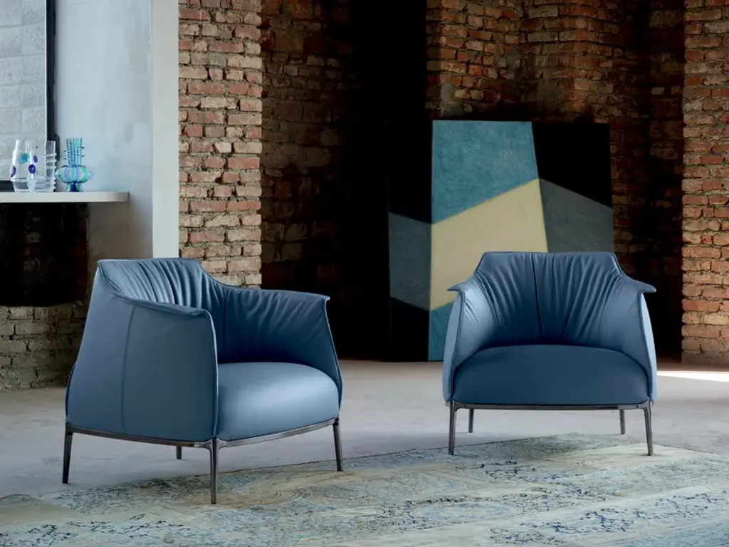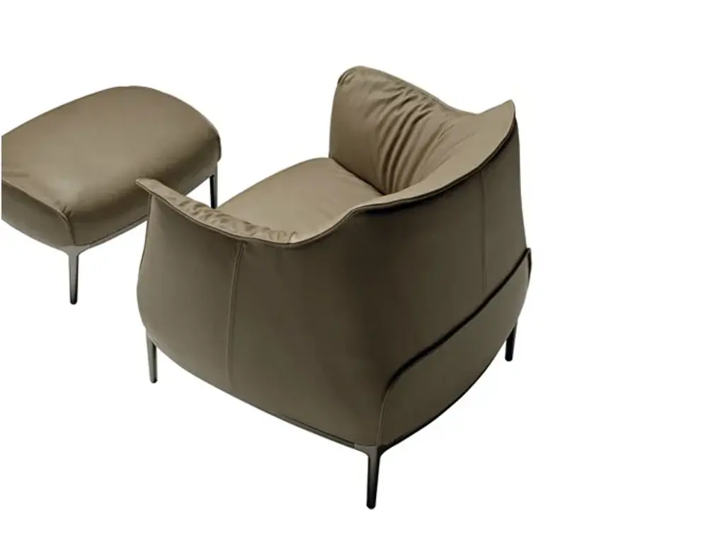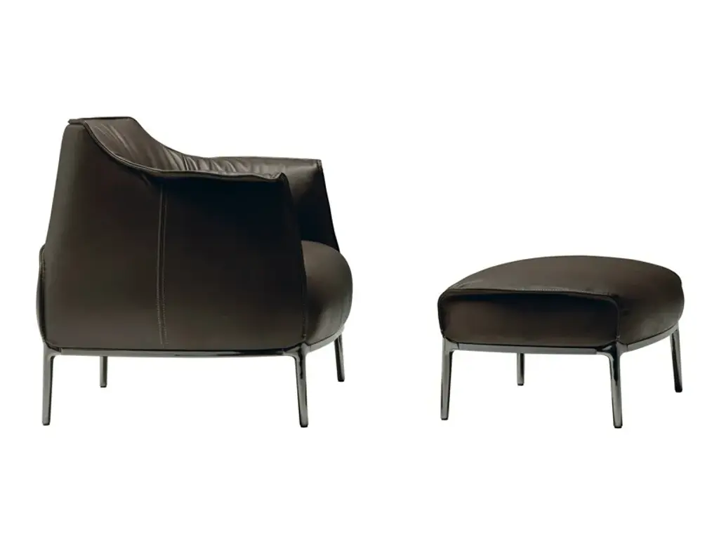 Archibald invites you in to mediate and relax. The icon chair created by Jean-Marie Massaud today goes royal: Archibald King is here. Important, majestic, fit for royalty. A distinguishing large headrest takes up on the elegant folds of the backrest featured throughout the collection. Thus the pleasantly undulating leather is embellished along the edges and external surfaces of the upholstery with contrast stitching, giving it a refined, elegant appeal.The frame of the backrest and seat is in steel with moulded polyurethane foam padding, and shaped foam with polyester wadding in the zones where more comfort is needed. Springing is obtained from elastic belts and the base is made up of four feet in cast aluminium with a tubular steel frame in a gunmetal grey finish. The upholstery is in Pelle Frau® leather.