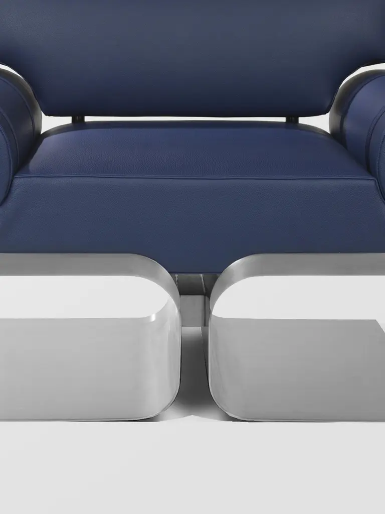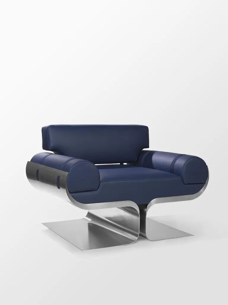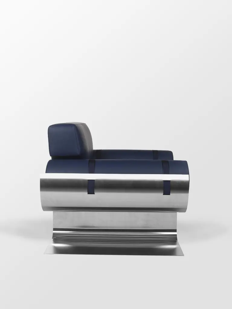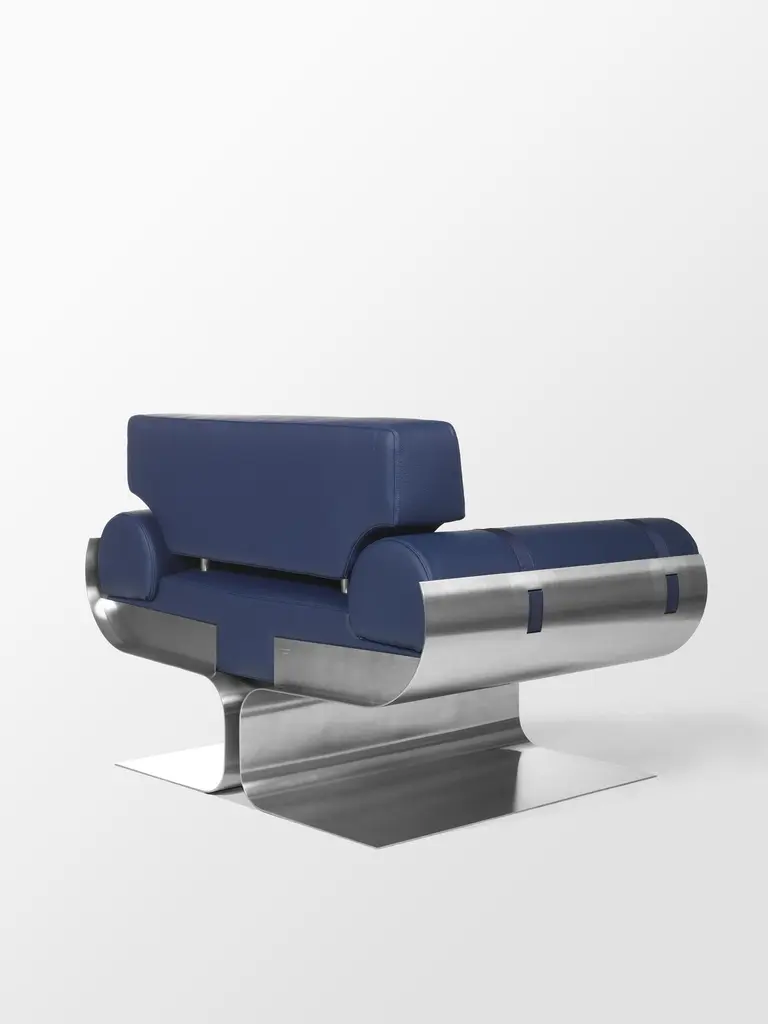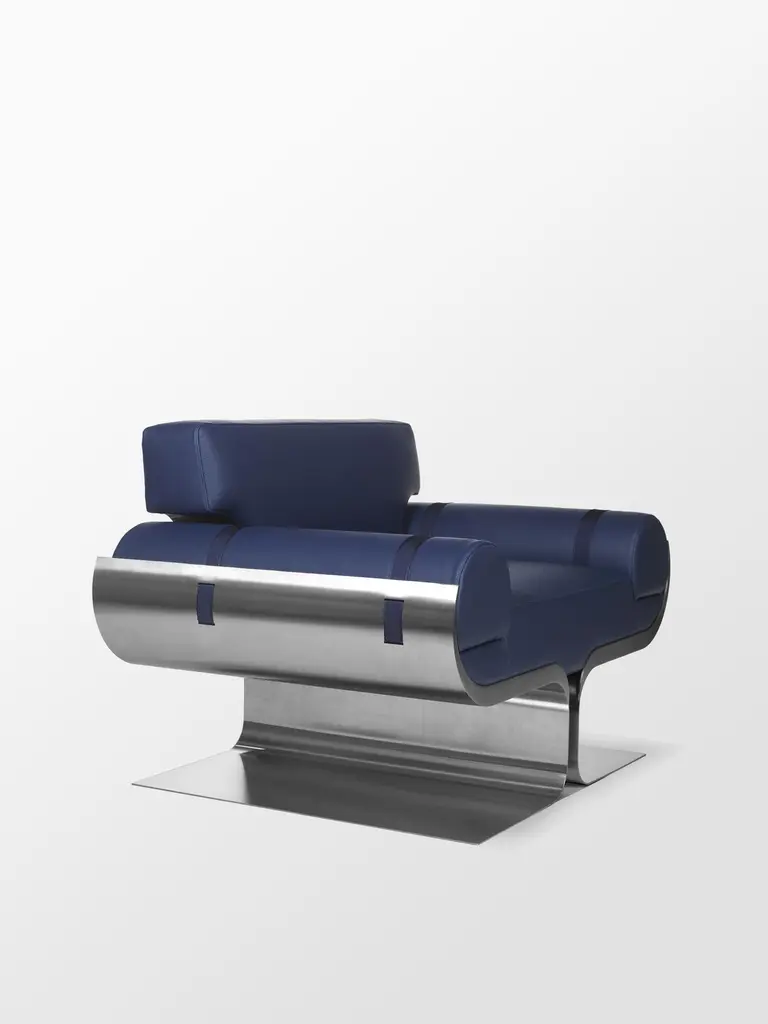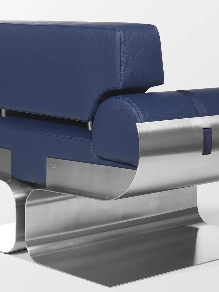 Arès Armchair by ROCHE & FRÈRESNumbered With Certificate Of Authenticity. Dimensions: D 83 x W 110 x H 76 cm.Materials: Brushed stainless steel and full-grain bull leather.Weight: 75 kg. Ice Memory CollectionInspired by the metal parts of armor, the armchair takes on a warrior side,masculine, hence its name «Arès», evoking the myth of the god of war inGreek mythology. Raw in appearance, the curves bring a balance between strength and softness.Born in FRANCE, 1996Originally from Le Puy en Velay, Alexandre and Maxence ROCHE are twin brothers, interior designers and designers. They draw their inspiration from the nature where they grew up on the borders of the wild Haute-Loire. After completing their master's degree in interior architecture and theater scenography, they founded their studio ROCHE & FRÈRES in Paris. Combining the wonders of the natural world with a deep understanding of art and design, they create objects and furniture pieces that singularly combine raw material with aesthetic sophistication. Totally contemporary but rooted in the primordial earth, their work achieves an exquisite balance between the severe beauty of nature and the complexity of cosmopolitan life. Guided by the maxim that the piece of furniture is a jewel, they consider each piece's relationship with the body, space and time. Every design tells a story, infused with both their personal experiences and a sweeping historical perspective, inviting us to ponder wilderness, the planet, and our place in the universe. Each piece is handcrafted by master artisans in France.
