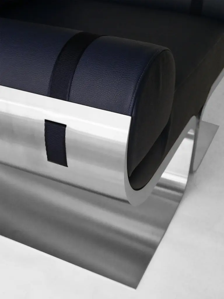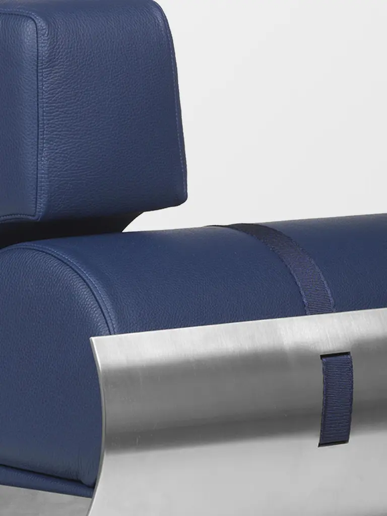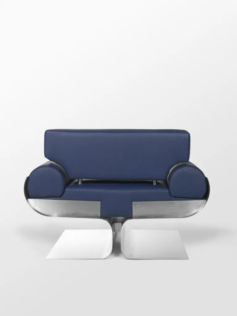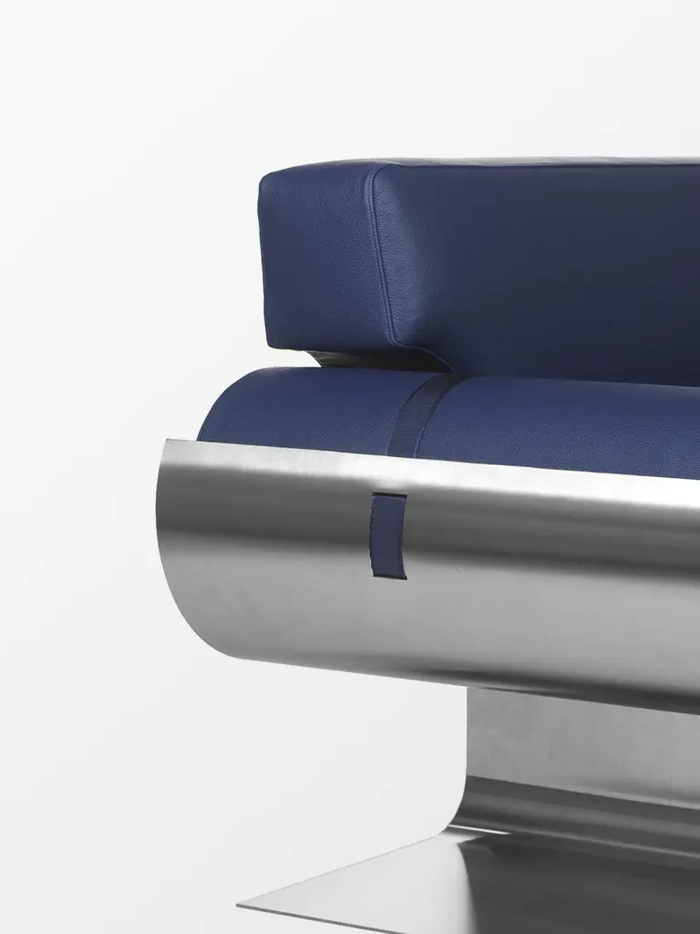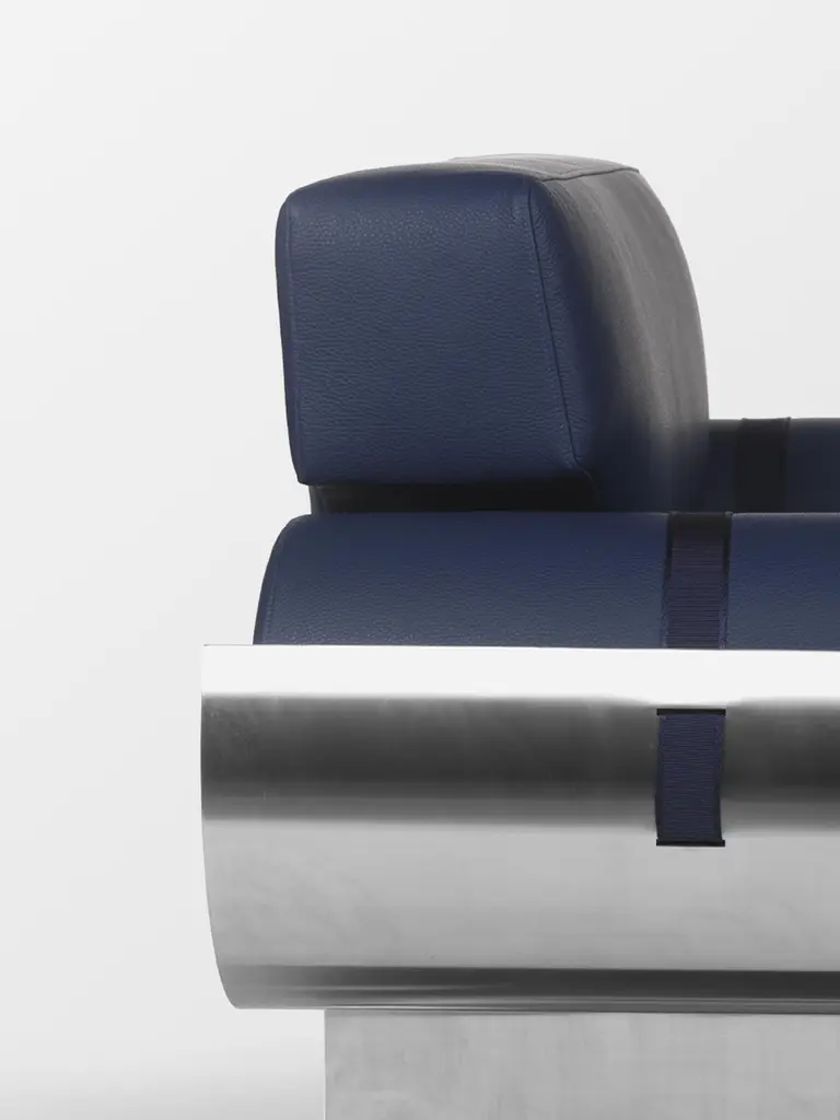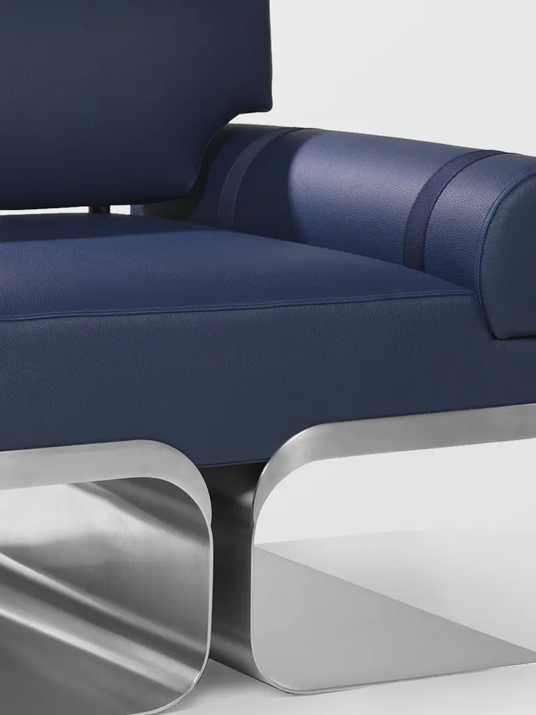 Arès Armchair by ROCHE & FRÈRESNumbered With Certificate Of Authenticity. Dimensions: D 83 x W 110 x H 76 cm.Materials: Brushed stainless steel and full-grain bull leather.Weight: 75 kg. Ice Memory CollectionInspired by the metal parts of armor, the armchair takes on a warrior side,masculine, hence its name «Arès», evoking the myth of the god of war inGreek mythology. Raw in appearance, the curves bring a balance between strength and softness.Born in FRANCE, 1996Originally from Le Puy en Velay, Alexandre and Maxence ROCHE are twin brothers, interior designers and designers. They draw their inspiration from the nature where they grew up on the borders of the wild Haute-Loire. After completing their master's degree in interior architecture and theater scenography, they founded their studio ROCHE & FRÈRES in Paris. Combining the wonders of the natural world with a deep understanding of art and design, they create objects and furniture pieces that singularly combine raw material with aesthetic sophistication. Totally contemporary but rooted in the primordial earth, their work achieves an exquisite balance between the severe beauty of nature and the complexity of cosmopolitan life. Guided by the maxim that the piece of furniture is a jewel, they consider each piece's relationship with the body, space and time. Every design tells a story, infused with both their personal experiences and a sweeping historical perspective, inviting us to ponder wilderness, the planet, and our place in the universe. Each piece is handcrafted by master artisans in France.