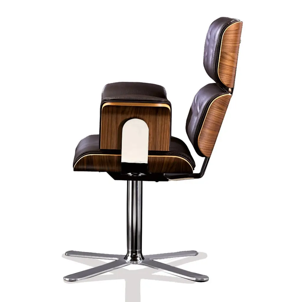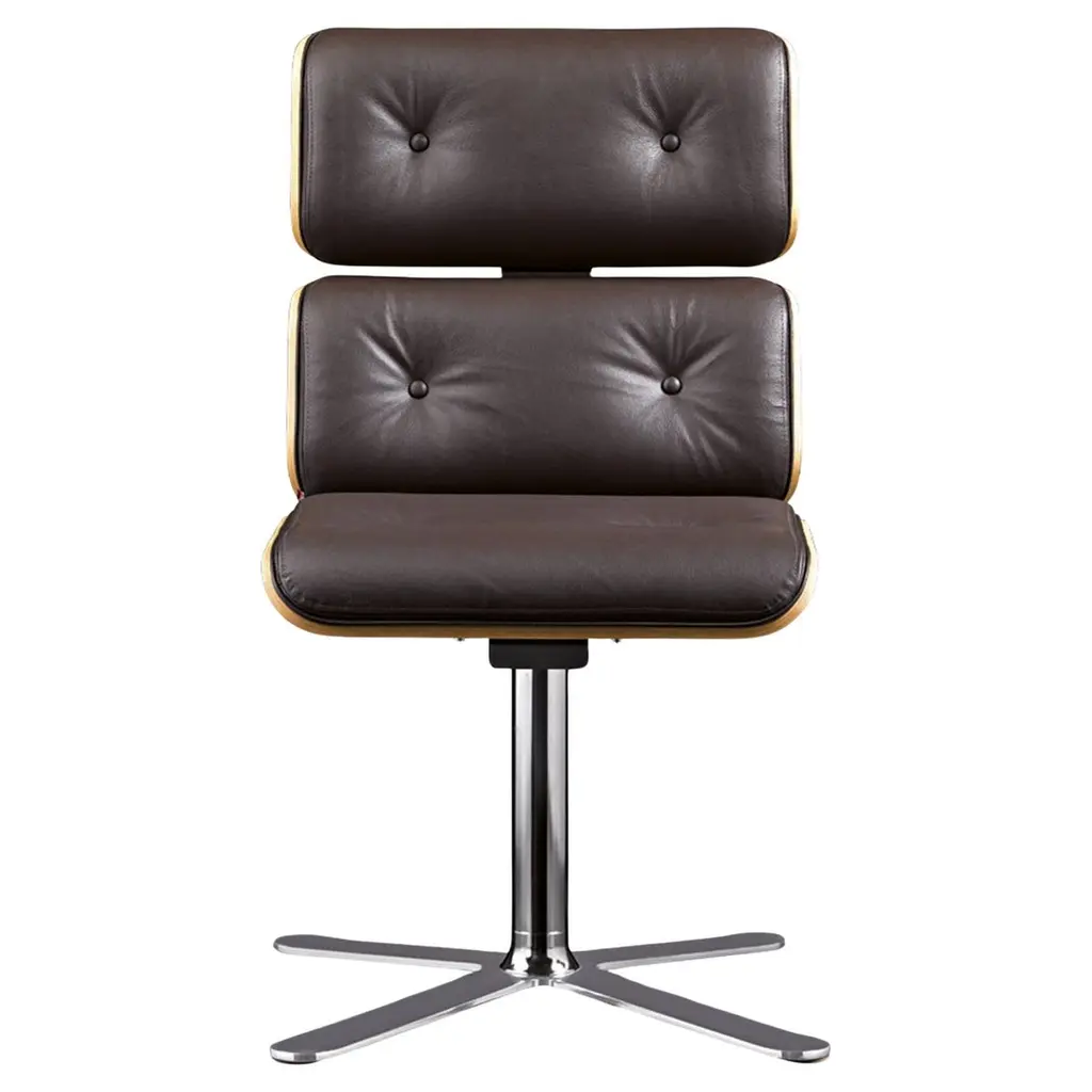 Well-balanced and superbly built, this office armchair of the Armadillo line is an exclusive design by Rainer Bachshmid available also without armrests and in the high back lounge version. Featuring a 4-star steel chrome base with a seat-return mechanism, the shell is composed of Canaletto walnut-finished beech plywood veneered elements with curved-up edges forming the back, seat, and armrests. Lightly padded for incomparable comfort, all the wooden parts are upholstered with fine Italian leather in a dark brown hue. The executive office armchair par excellence, the height of the armrests is 70cm.