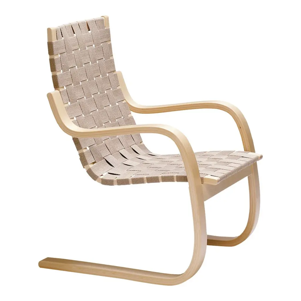 Armchair 406 combines simple elegance with comfort. Since wood changes over time, the armrests are formed from a single piece that is then split in half, ensuring that as the chair ages, it remains perfectly balanced. The cantilevered birch frame and linen webbed seat offer a high degree of comfort and relaxation; the natural materials yield in response to the body while simultaneously providing strength and stability.