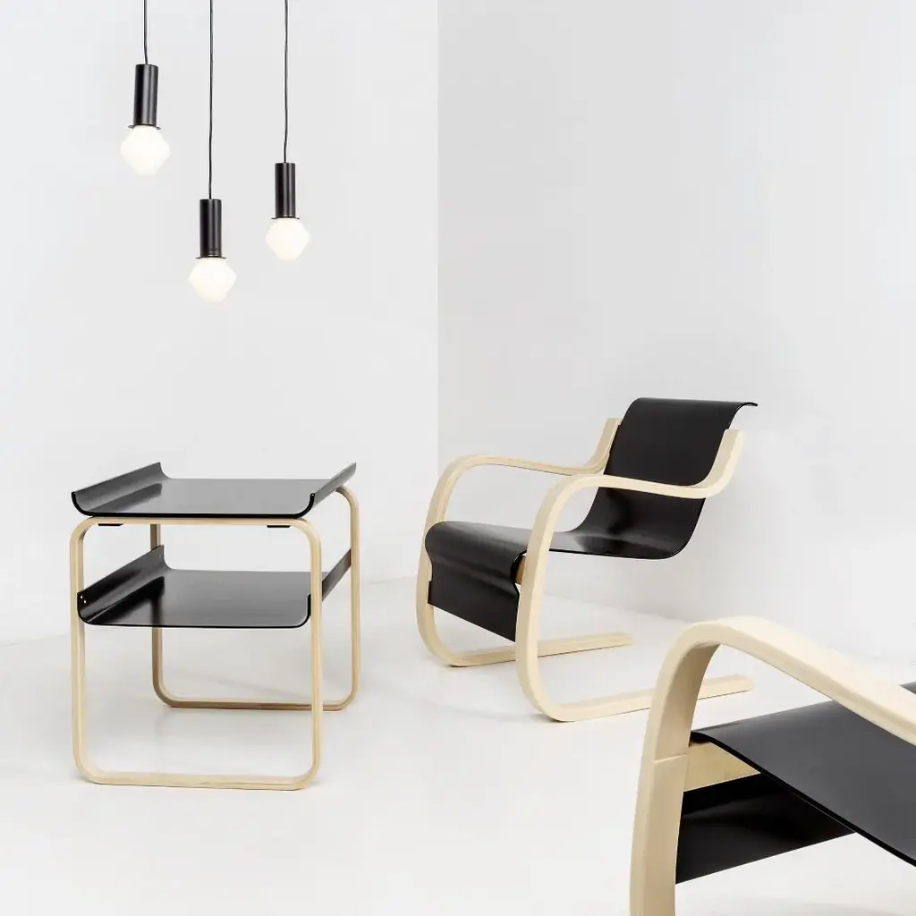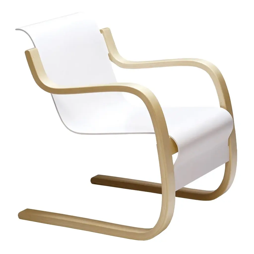 Armchair 42 – or "Small Paimio" – was designed by Alvar Aalto for the Paimio Sanatorium in 1932. The frame is made from laminated birch shaped to produce a cantilevered chair; the seat and back are created from one piece of form-pressed plywood. The fluidity of the design creates a soft, comfortable place to sit. The result is an armchair without straight lines, an armchair of exceptional aesthetic appeal. Since wood changes over time, the armrests are formed from a single piece that is then split in half, ensuring that as the chair ages, it remains perfectly balanced.