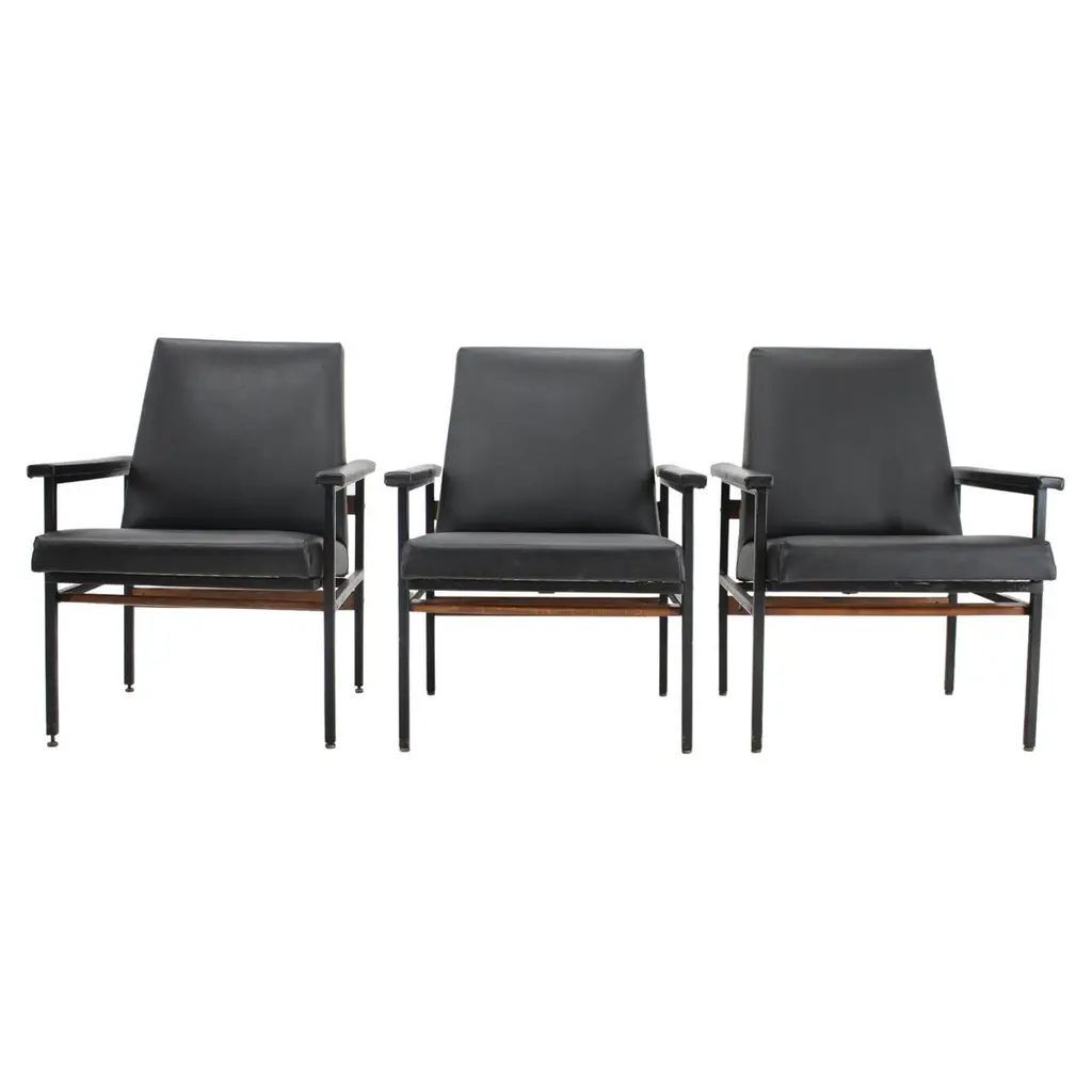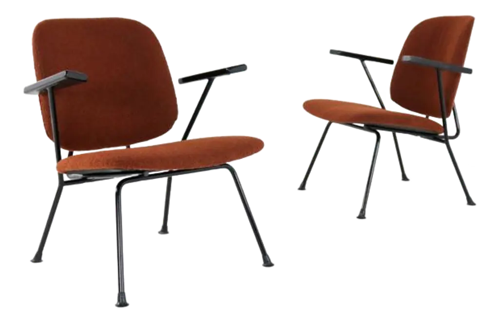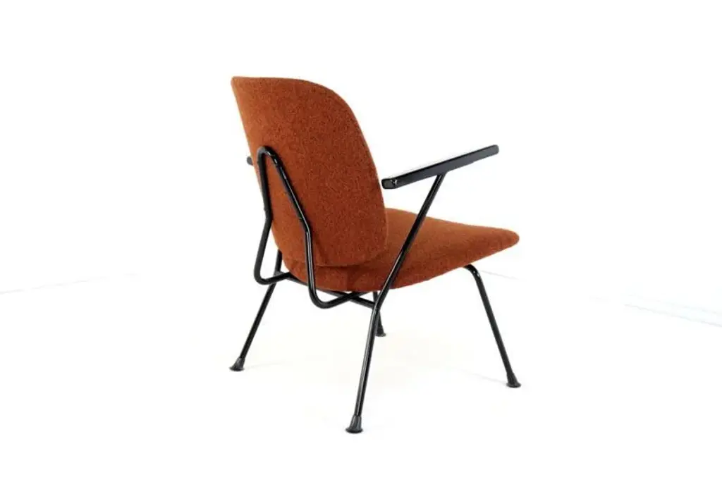 Strongly designed Dutch Design Armchair The designer. Gijs van der Sluis, a mechanically trained self-taught furniture designer, started making machine parts for the cigar industry in Culemborg after the Second World War. Due to market demand, he also started designing and producing steel chairs. His passion for technology and high quality standards resulted in successful designs and the van der Sluis steel furniture company. Some designs are still produced by his grandchildren. These copies. This model number No. 12, was intended as a low "lounge" chair, a low-sitting, well-made and comfortable piece of seating furniture. Its heavy solid steel frame and fine armrests make it a piece of furniture that really radiates quality. The original caps on the legs are still present, these ensure a flat and stable placement on the surface. The frames of these examples have been completely repainted in black, the armrests are also in this color, which we also found before the start of the restoration. A completely new filling has been chosen for the seat and backrest as well as a beautiful first-class timeless furniture fabric. This fabric has a beautiful Bouclé effect and is available in red and brown tones. These armchairs are exceptionally beautiful in design and execution, strong Dutch Design that can be used daily and is also very solid in quality. Timelessly beautiful design! Country of origin: Netherlands Manufacturer: Van der Sluis Steel Meubelen Culemborg Designer: Gijs van de Sluis Model: no 12 Height: 71 cm Seat height: 38 cm Width: 61 cm Seat width: 52 cm Depth: 61 cm Seat depth: 46 cm This piece has an attribution mark, I am sure that it is completely authentic and take full responsibility for any authenticity issues arising from misattribution