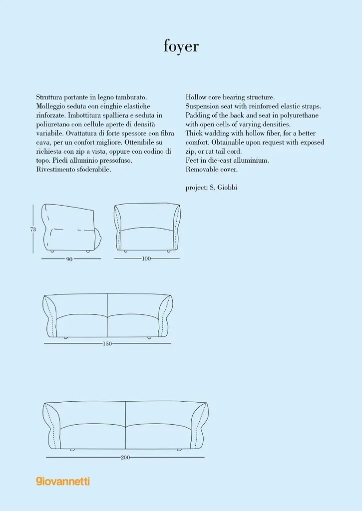 Foyer seating system, composed of three different sized elements. Born under the sign of a balanced modernity that can interface with all different styles and worlds. Foyer originated from a lamellar bearing structure. The tailoring and modern materials make it extremely elegant. On request, it can be produced with a zip, to facilitate the removal of its “suit”.Hollow core wood bearing structure.Suspension seat with reinforced elastic straps.Padding of the back and seat in polyurethane with open cells of varying densities.Thick wadding with hollow fiber, for a better comfort.Obtainable upon request with exposed zip, or rat tail cord.Feet in die-cast alluminium Removable cover.