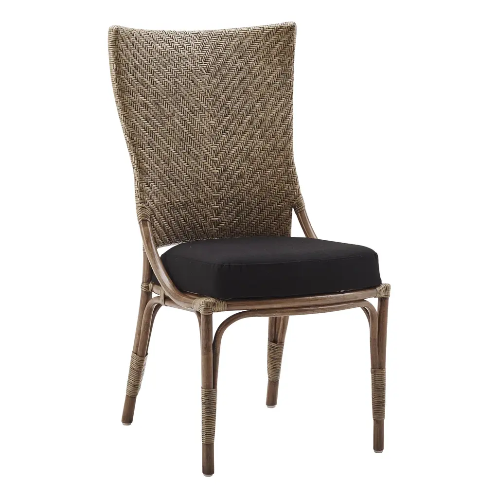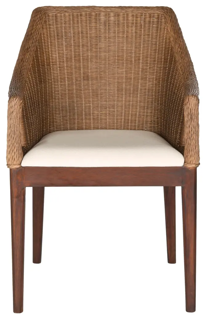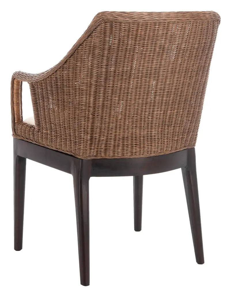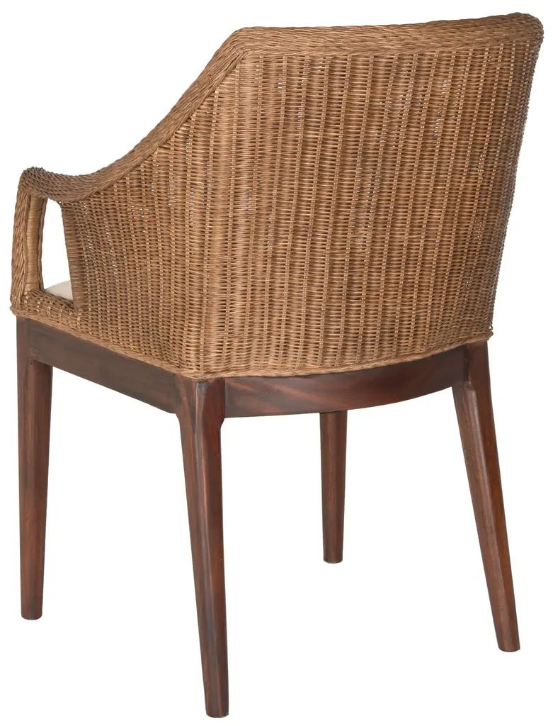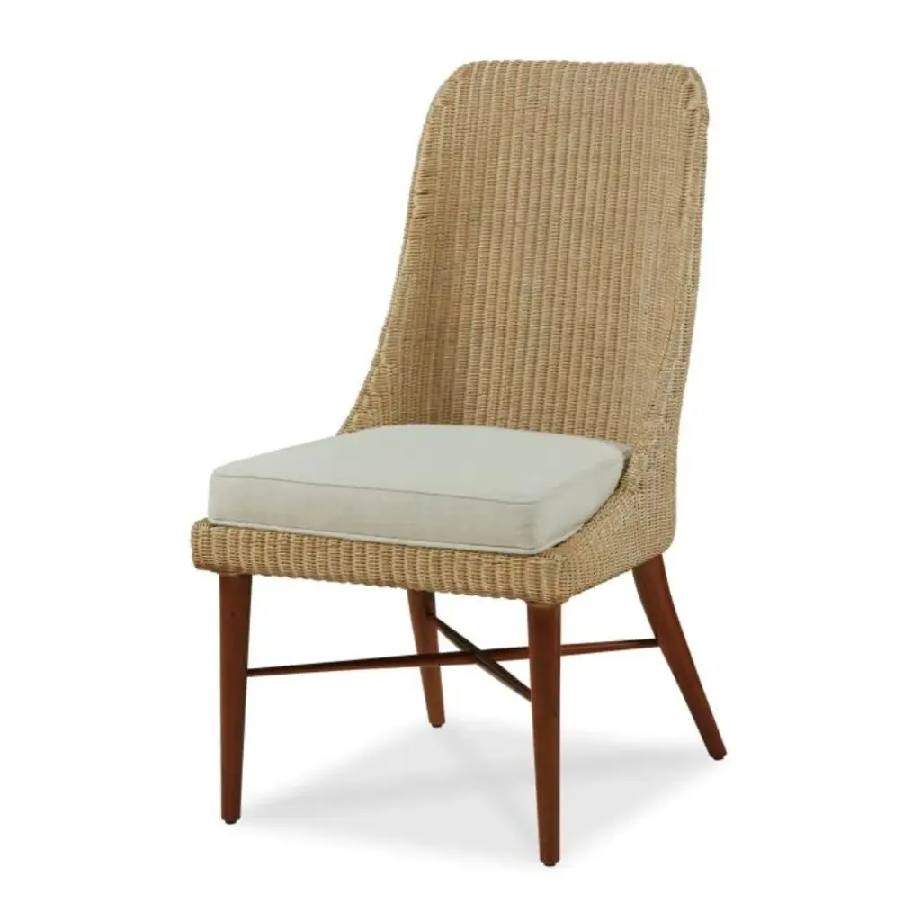 Castle in Spain. The relaxed luxury found in the heart of Spanish coastal cities inspired thearmchair. Finely woven rattan caresses every curve of this sophisticated piece white classic mahogany legs support it's ample white cotton cushion. To prevent overall soiling, frequent vacuum light brushing is recommended. Cushions and pillows should be turned on a weekly basis. Down-filled cushions should be brushed rather than vacuumed. Spot clean, using a mild water-free solvent or dry cleaning product. Only a professional cleaner should undertake a complete overall cleaning. The use of steam or water-based cleaners may cause excessive shrinking or staining.