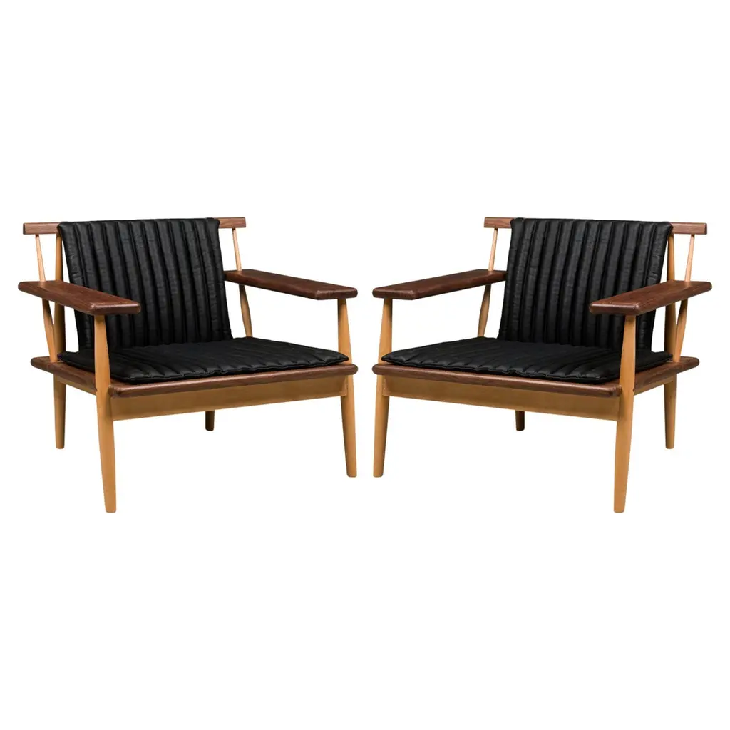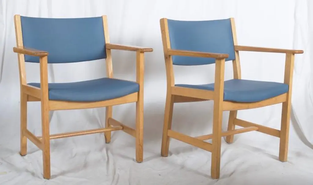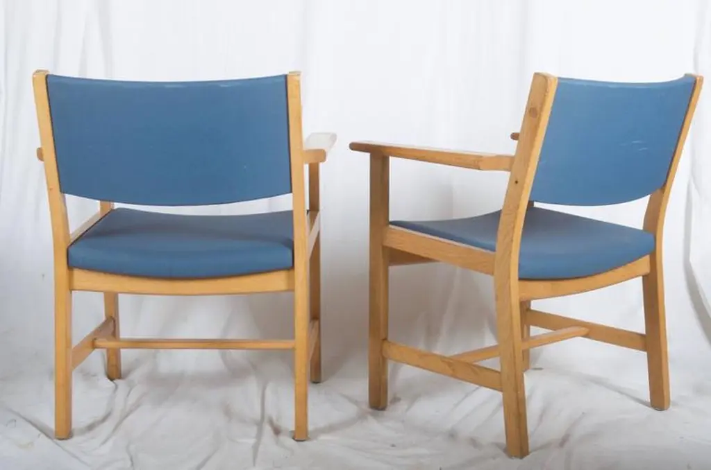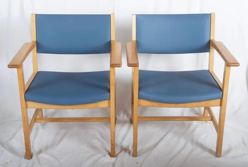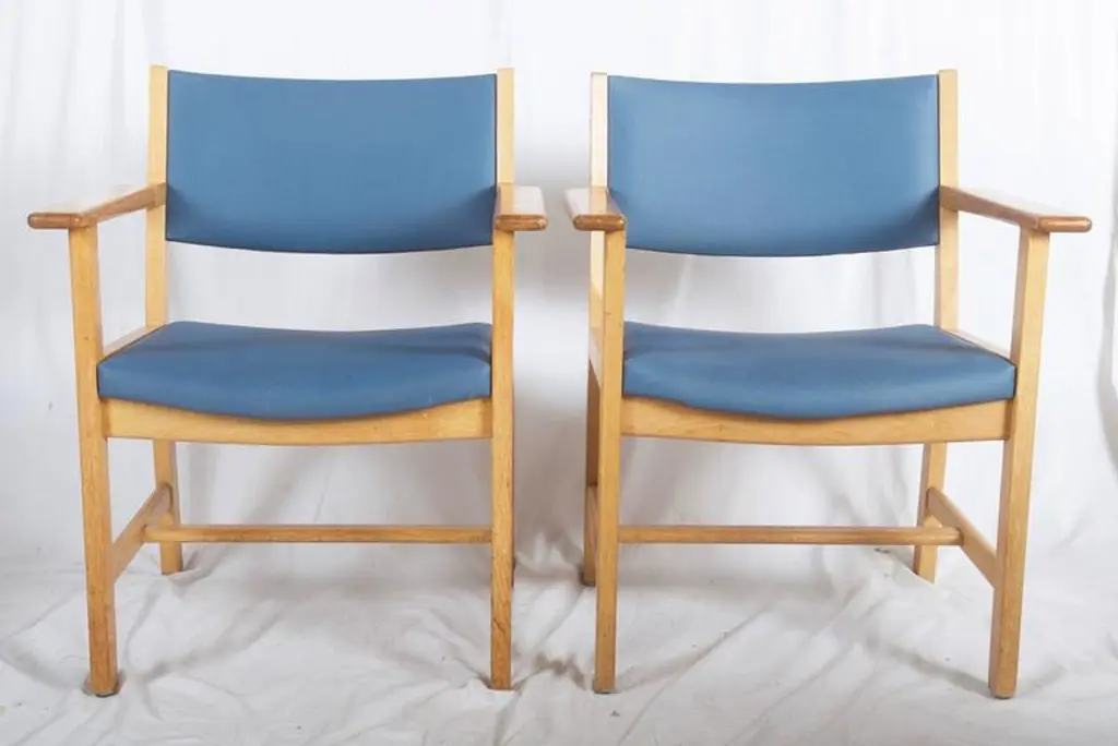 Oak frame lacquered upholster with blue fabric, designed by Hans Wegner for GETAMA in the 1960s.On request also a full restoration and new upholstery possible. (additional 250Euro/piece + fabric) Up to 12 pieces available.