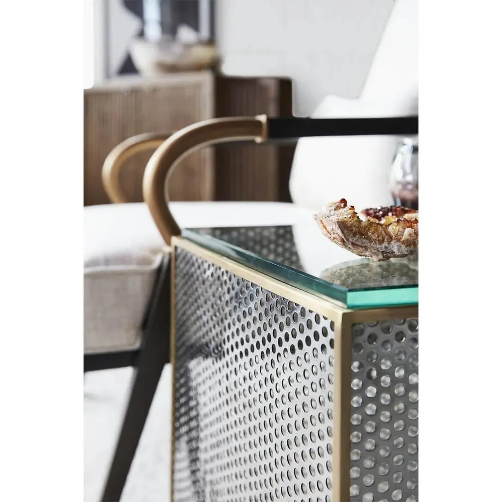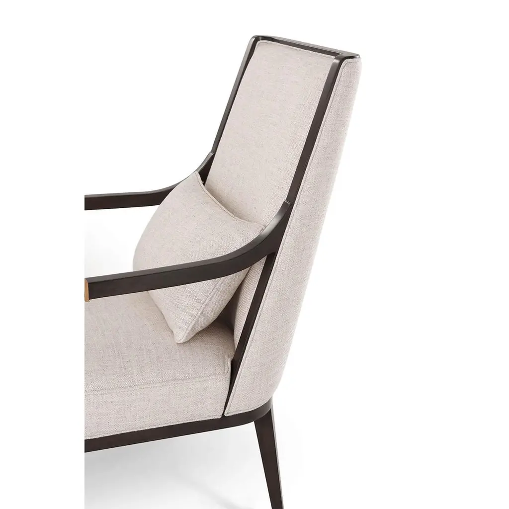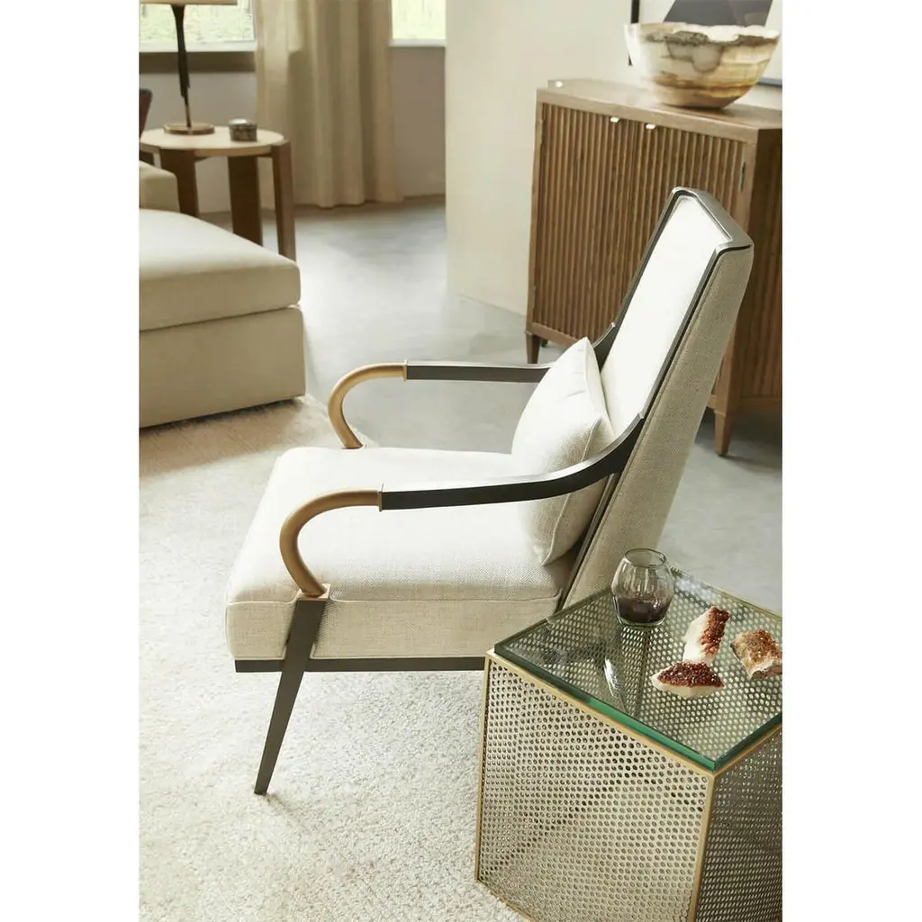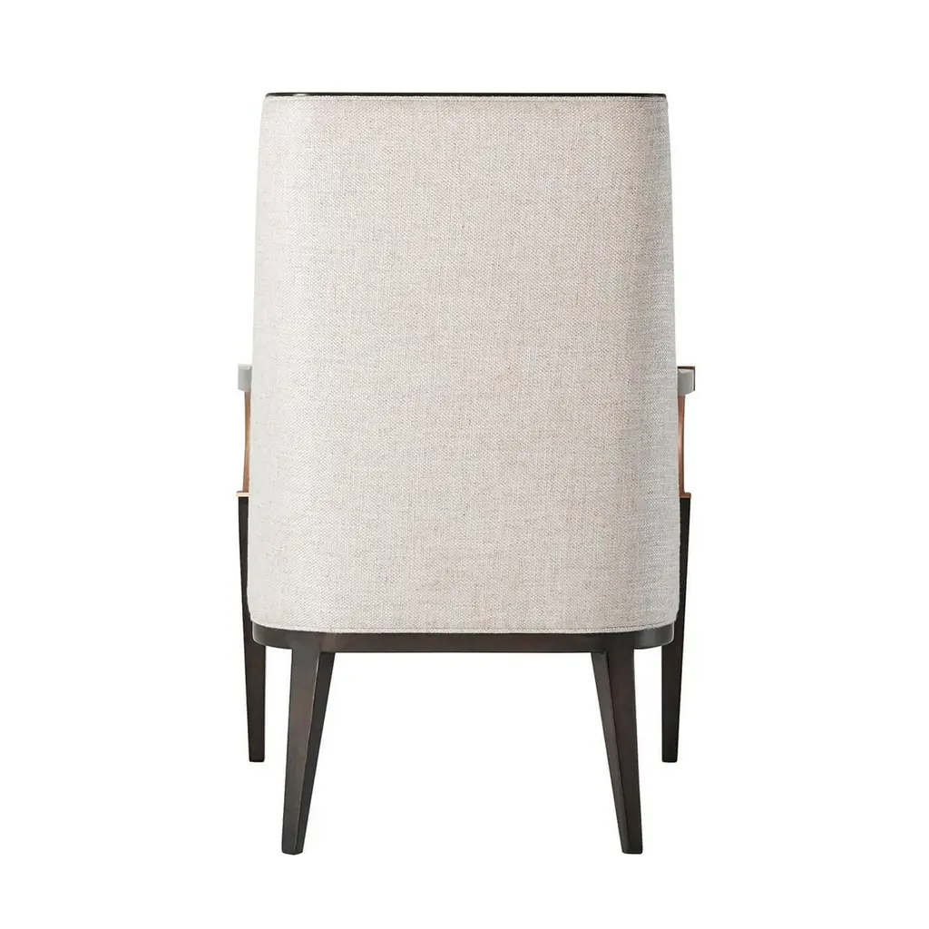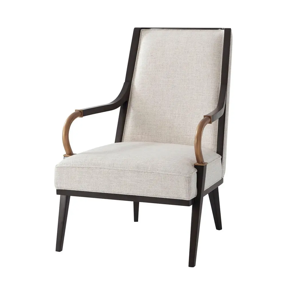 A fine French Art Deco-inspired open armchair with a curved and padded backrest, down swept arms with bronze finish terminals, a boxed seat, and kidney pillow above square tapered and angled legs.Dimensions: 26.75" W x 32.75" D x 39" HSeat height: 17.75"Arm height: 24.25" Upholstered with UP0606 fabric.
