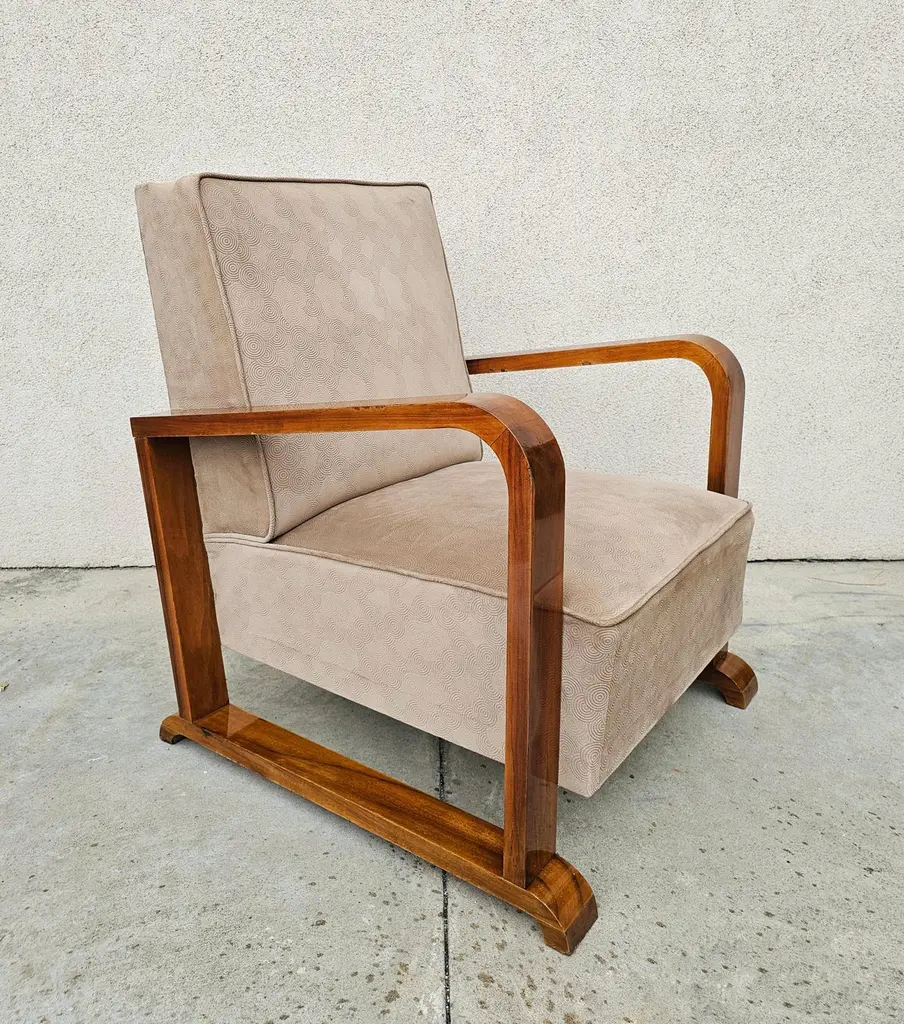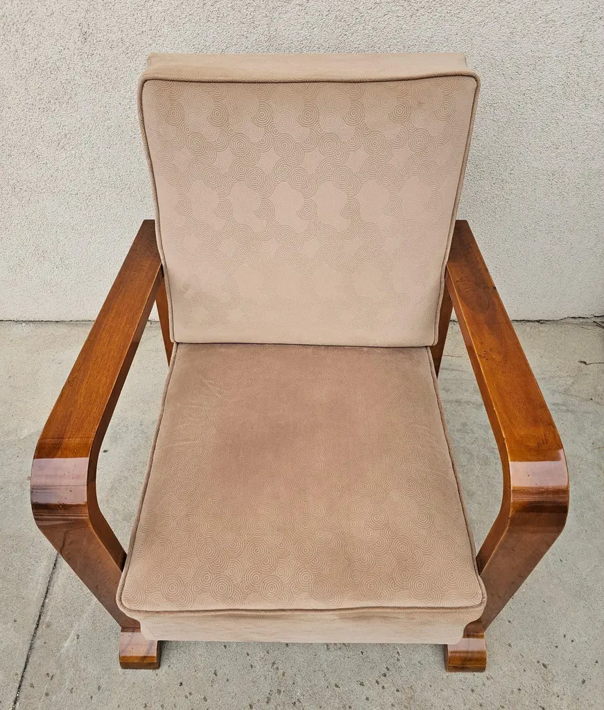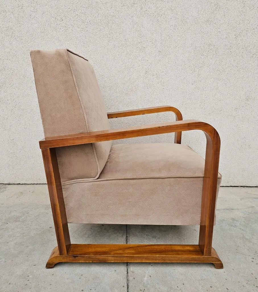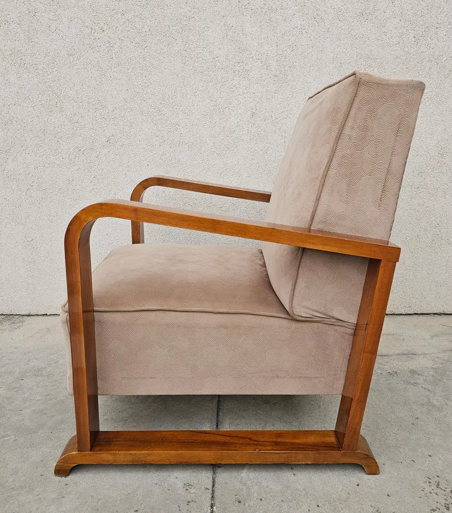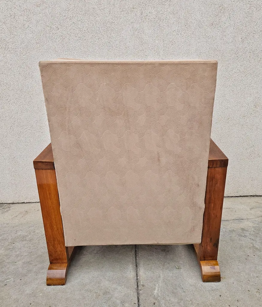 In this listing you will find striking Art Deco Armchairs done in solid walnut, with beautiful wood grain. The armrest feature extraordinary shape that is rarely seen among Art Deco armchairs. They have been refurbished a year ago (according to the previous owner), so they show very few signs of time and use. Wood is in very good condition and it has been finished in French polish. The fabric selected for the armchairs features Art Deco inspired circular patterns, as shown in pictures. Very rare find! Made in Austria in 1920s.When purchased the armchair will be carefully wrapped up and packed in a way to avoid any damages in transport. As soon as shipped you will receive the tracking number for your package. If you have any additional questions regarding this piece please feel free to contact me. Happy shopping!