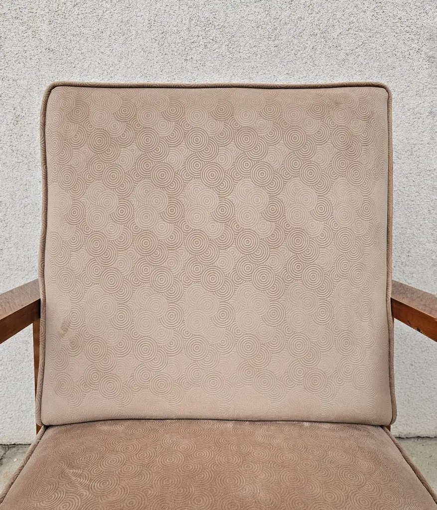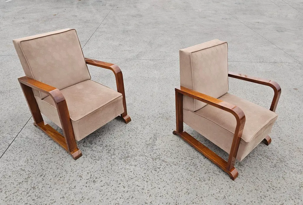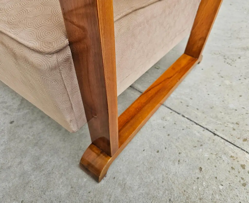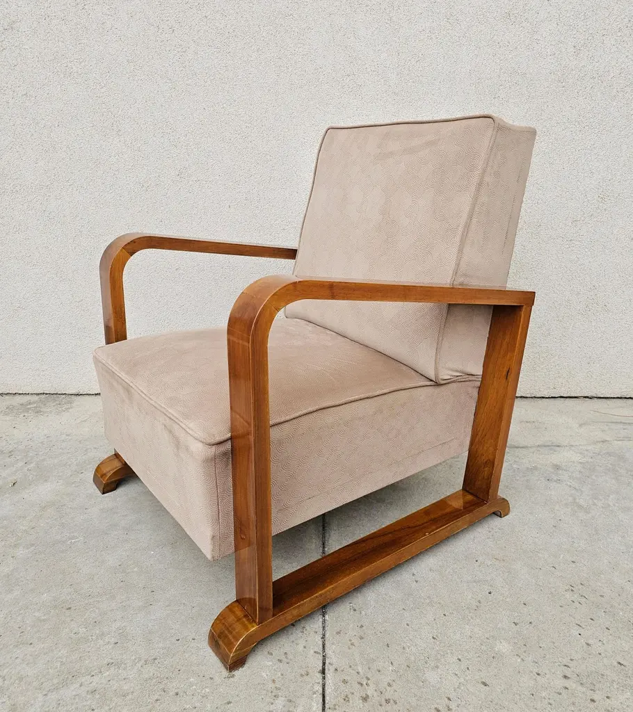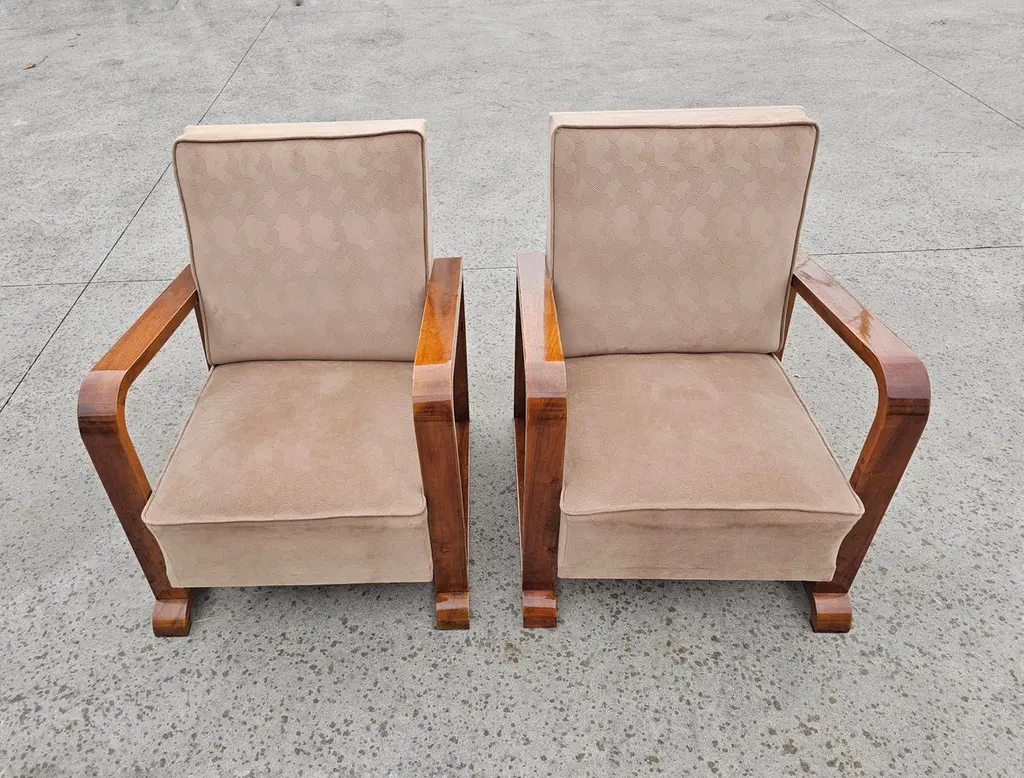 In this listing you will find striking Art Deco Armchairs done in solid walnut, with beautiful wood grain. The armrest feature extraordinary shape that is rarely seen among Art Deco armchairs. They have been refurbished a year ago (according to the previous owner), so they show very few signs of time and use. Wood is in very good condition and it has been finished in French polish. The fabric selected for the armchairs features Art Deco inspired circular patterns, as shown in pictures. Very rare find! Made in Austria in 1920s.When purchased the armchair will be carefully wrapped up and packed in a way to avoid any damages in transport. As soon as shipped you will receive the tracking number for your package. If you have any additional questions regarding this piece please feel free to contact me. Happy shopping!