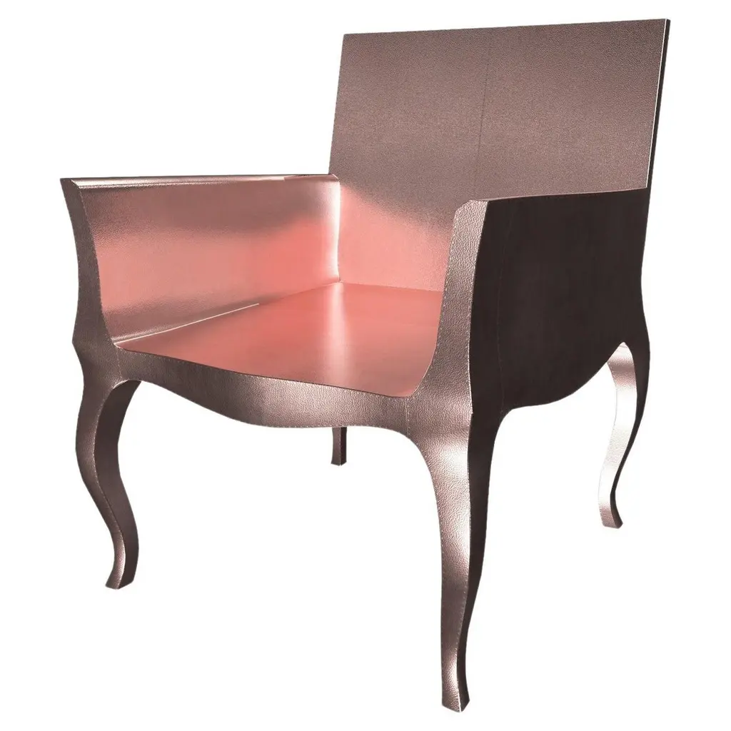 Introducing the Art Deco Chairs, a stunning Art Deco Chairs set designed by the renowned Paul Mathieu for Stephanie Odegard. This elegant Art Deco Chair duo boasts a unique curved profile that exudes a sophisticated and timeless charm, making it the perfect addition to any modern or classic interior.Crafted with utmost care and attention to detail, these Art Deco Chairs are made to order and are available in twelve metal clad finishes, ensuring that you can choose the perfect one to match your individual style and taste. The use of high-quality materials and expert craftsmanship ensure that each Art Deco Chair is not only beautiful but also a true piece of art.The curved legs and side arms of this Art Deco Chair are hand carved from solid pieces of teak. Pattern makers trace and cut complex forms that will cover the chair in a skin of copper, white bronze, brass or antiqued white bronze The metal finishes will tarnish over time. Regular non-abrasive household metal polishes can be used to restore the original luster.Overall, if you're looking for a piece of furniture that combines luxury, comfort, and style, then the Art Deco Chairs is an excellent choice. With its distinctive curved profile and multiple finish options, this Chair set is sure to elevate the look of any room it is placed in, and be a beloved addition to your home for years to come.The images shown in this listing are shot in different lighting conditions and/or are 3D illustrations. We encourage our customers to please request a sample or a full sample set of 12 finishes so that they can experience the finish first hand. Art Deco Armchairs Fine Hammered in Copper by Paul MathieuSize- 26"x 27"x 33"HMaterials - Copper, Metal sheet, Teak, Wood, MetalTechniques: Hand-Crafted, Hand-Carved, Metal Work, Wood Work, Metal Wrapping, PolishedPlease note that moisture in air, sudden change in temperature and natural movement of wood over time causes the metal to wrinkle or bubble up. We use well seasoned, reclaimed teak and high quality marine grade MDF (wherever technically possible) to avoid and delay the mentioned changes. However a perfect stability of metal cannot be guaranteed. Please note that our smooth finish metal clad pieces will have some unavoidable tool marks. This is proof that everything is done by hand. The smooth finish will not come out like a machine made perfect surface and the master artisan will do their best to make it look as good/clean/stable/perfect as he possibly can.The antique white bronze finish is hand done by using an acidic chemical over the white bronze finish to recreate a natural patination. Like with the natural patination of silver, copper, or brass, the final result and color uniformity of the patina cannot be guaranteed. The goal of this finish is to achieve rainbow-like shades with dull, shiny, cloudy, and streaky patches to give an illusion of antiquing. Please note:None of our metal clad pieces are treated with a protective “finish” thus enabling the items to age naturally over time. We will of course polish them well before we pack them. a) Copper oxidizes faster than the other metals. In six to twelve months it will most likely lose its shine and will gradually turn to different shades of brown and/or green/blue. This aging process and its effect is referred to as verdigris. After a year the piece should not change much more. Copper does not rust, but does require periodic cleaning in order to retain its original shine if that the preferred option. ('BRASSO' or any known copper polish can be used to polish copper).b) Brass retains its shine for far longer than others, but will tarnish if not cleaned on occasion. ('BRASSO' is made to polish brass).c) White bronze, has the least tendency to show age or tarnish. If kept in a controlled climate, this metal will hold its shine for years. It can be cleaned with a cleanser and polished with a cloth. d) The antiqued white bronze finish will react with the natural elements the fastest in the beginning but it too will stop reacting and will settle down in a stable state like copper after 6-12 months. Since it is already antiqued and looked like it is tarnished, as described in an earlier message, this fast reaction will not change the over all look. In that way this surface is most forgiving. The images shown in this listing are shot in different lighting conditions and/or are 3D illustrations. We encourage our customers to please request a sample or a full sample set of 12 finishes so that they can experience the finish first hand.