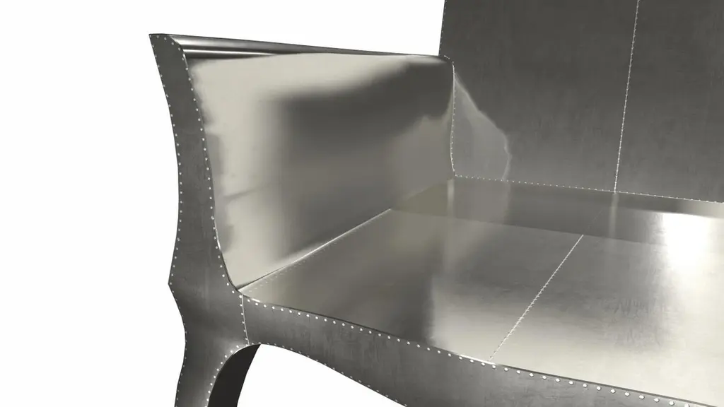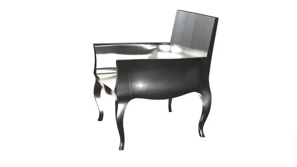 Introducing the Art Deco Chairs, a stunning Art Deco Chairs set designed by the renowned Paul Mathieu for Stephanie Odegard. This elegant Art Deco Chair duo boasts a unique curved profile that exudes a sophisticated and timeless charm, making it the perfect addition to any modern or classic interior.Crafted with utmost care and attention to detail, these Art Deco Chairs are made to order and are available in twelve metal clad finishes, ensuring that you can choose the perfect one to match your individual style and taste. The use of high-quality materials and expert craftsmanship ensure that each Art Deco Chair is not only beautiful but also a true piece of art.The curved legs and side arms of this Art Deco Chair are hand carved from solid pieces of teak. Pattern makers trace and cut complex forms that will cover the chair in a skin of copper, white bronze, brass or antiqued white bronze The metal finishes will tarnish over time. Regular non-abrasive household metal polishes can be used to restore the original luster.Overall, if you're looking for a piece of furniture that combines luxury, comfort, and style, then the Art Deco Chairs is an excellent choice. With its distinctive curved profile and multiple finish options, this Chair set is sure to elevate the look of any room it is placed in, and be a beloved addition to your home for years to come.The images shown in this listing are shot in different lighting conditions and/or are 3D illustrations. We encourage our customers to please request a sample or a full sample set of 12 finishes so that they can experience the finish first hand. Art Deco Armchairs Designed by Paul Mathieu for Stephanie OdegardSize- 26"x 27"x 33"HMaterials - White Bronze Metal sheet, Teak, Wood, MetalTechniques: Hand-Crafted, Hand-Carved, Metal Work, Wood Work, Metal Wrapping, PolishedPlease note that moisture in air, sudden change in temperature and natural movement of wood over time causes the metal to wrinkle or bubble up. We use well seasoned, reclaimed teak and high quality marine grade MDF (wherever technically possible) to avoid and delay the mentioned changes. However a perfect stability of metal cannot be guaranteed. Please note that our smooth finish metal clad pieces will have some unavoidable tool marks. This is proof that everything is done by hand. The smooth finish will not come out like a machine made perfect surface and the master artisan will do their best to make it look as good/clean/stable/perfect as he possibly can.The antique white bronze finish is hand done by using an acidic chemical over the white bronze finish to recreate a natural patination. Like with the natural patination of silver, copper, or brass, the final result and color uniformity of the patina cannot be guaranteed. The goal of this finish is to achieve rainbow-like shades with dull, shiny, cloudy, and streaky patches to give an illusion of antiquing. Please note:None of our metal clad pieces are treated with a protective “finish” thus enabling the items to age naturally over time. We will of course polish them well before we pack them. a) Copper oxidizes faster than the other metals. In six to twelve months it will most likely lose its shine and will gradually turn to different shades of brown and/or green/blue. This aging process and its effect is referred to as verdigris. After a year the piece should not change much more. Copper does not rust, but does require periodic cleaning in order to retain its original shine if that the preferred option. ('BRASSO' or any known copper polish can be used to polish copper).b) Brass retains its shine for far longer than others, but will tarnish if not cleaned on occasion. ('BRASSO' is made to polish brass).c) White bronze, has the least tendency to show age or tarnish. If kept in a controlled climate, this metal will hold its shine for years. It can be cleaned with a cleanser and polished with a cloth. d) The antiqued white bronze finish will react with the natural elements the fastest in the beginning but it too will stop reacting and will settle down in a stable state like copper after 6-12 months. Since it is already antiqued and looked like it is tarnished, as described in an earlier message, this fast reaction will not change the over all look. In that way this surface is most forgiving. The images shown in this listing are shot in different lighting conditions and/or are 3D illustrations. We encourage our customers to please request a sample or a full sample set of 12 finishes so that they can experience the finish first hand.