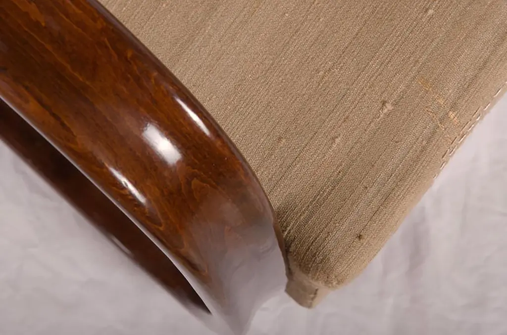 Beech bentwood walnut stained armchair made by Thonet in the 1930s.Excellent restored with seat springs upholstered with Dedar silk fabric.Another fabric and wood finish on request possibleOn request several availableDelivery time about 5-6 weeks.Price per chair.