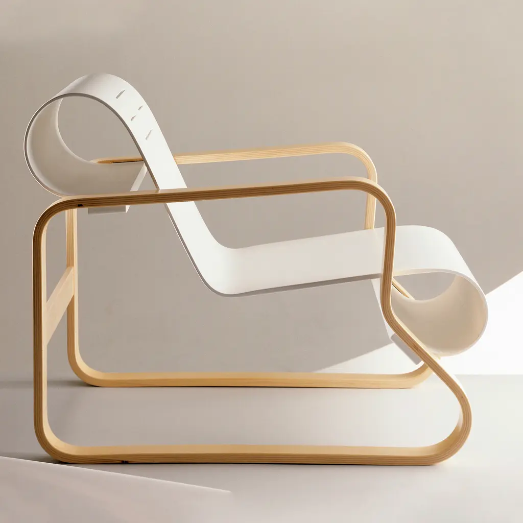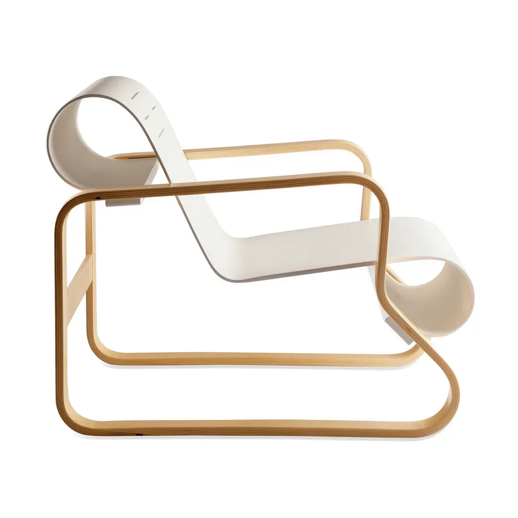 When Alvar Aalto’s statement-making Armchair 41 “Paimio” premiered in 1932, it was hailed as a revolutionary interpretation of the club chair and set new standards in modern furniture design. The chair, which is an object in MoMA’s collection, combines a traditional outline with a light, organic form. Armchair 41’s seat is fixed to the design's frame at only four points, creating the delightful illusion that the seat is floating. This construction also provides an amazing degree of elasticity. The armrests are made from a single piece of solid birch wood that is form-bent and then split in half. This ensures that over time, the Armchair 41 “Paimio” remains perfectly balanced. The elegant, sculptural seat and backrest are made from form-pressed birch plywood. Made in Finland, the Armchair 41 “Paimio” measures 25.25h x 23.5w x 31.5”d. The chair’s manufacturer, Artek, is represented in MoMA’s collection