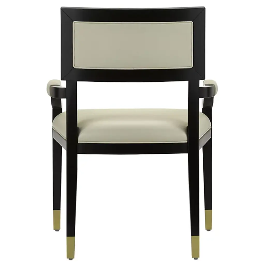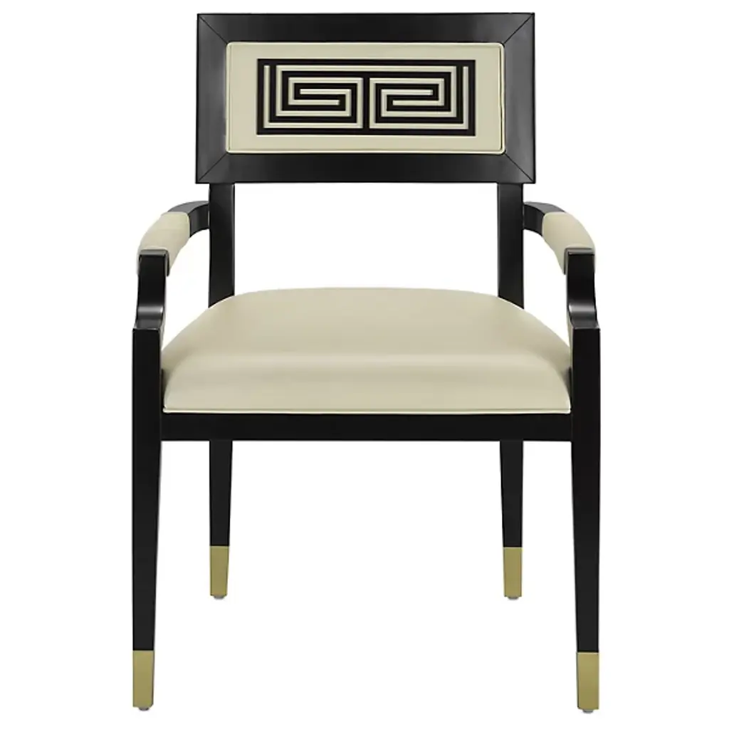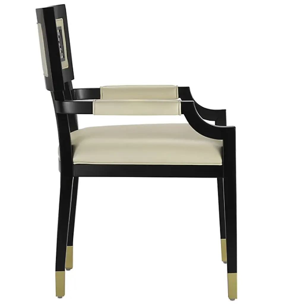 The Artemis Armchair from Currey & Company is a captivating blend of elegance and comfort. The intricately designed seatback boasts linear patterning, adding an artistic touch to your space. The rectangular shape of the seatback ensures excellent postural support while seated. Crafted with beech, brass, and leather, this armchair exudes both sophistication and durability. The curved arms add a graceful element to the overall design. With plastic glides, you can move with ease.