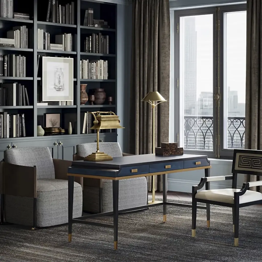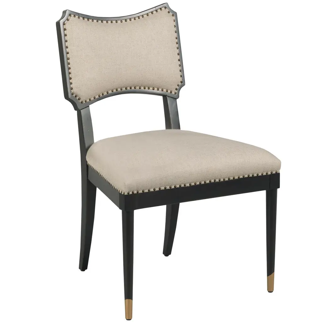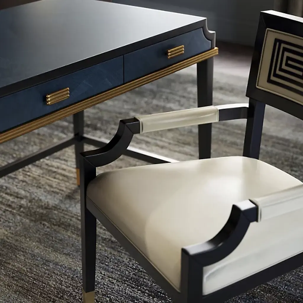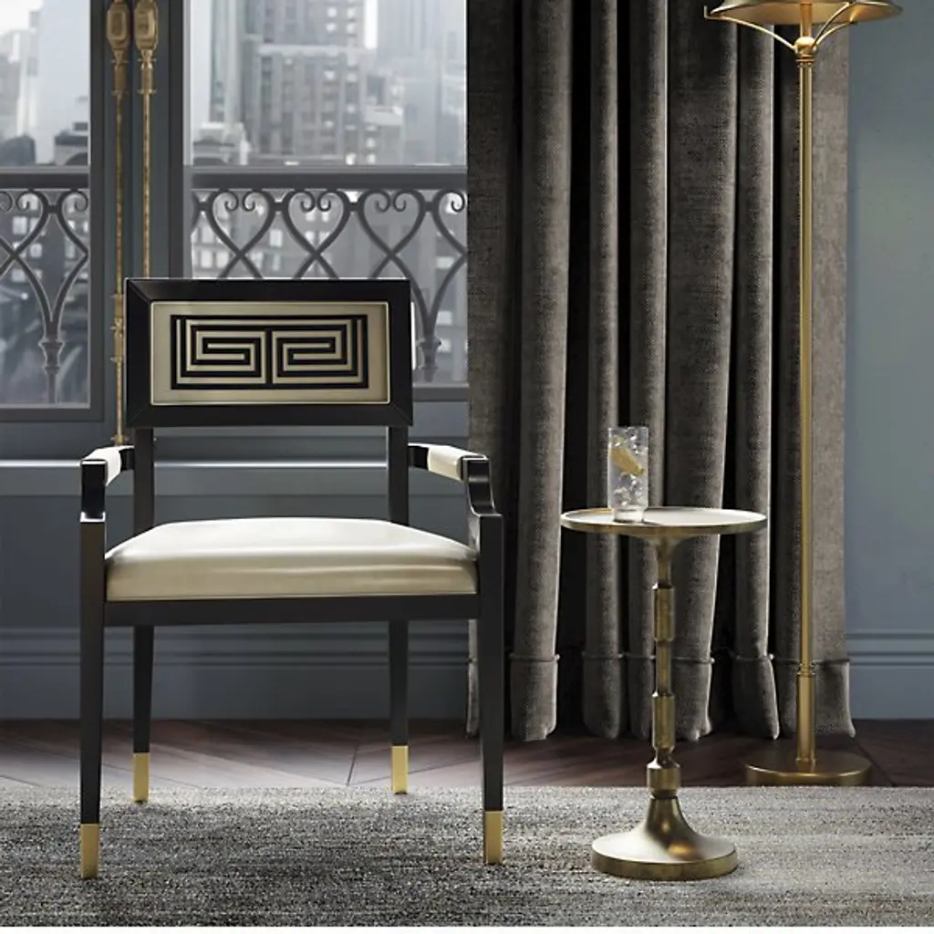 The Artemis Armchair from Currey & Company is a captivating blend of elegance and comfort. The intricately designed seatback boasts linear patterning, adding an artistic touch to your space. The rectangular shape of the seatback ensures excellent postural support while seated. Crafted with beech, brass, and leather, this armchair exudes both sophistication and durability. The curved arms add a graceful element to the overall design. With plastic glides, you can move with ease.