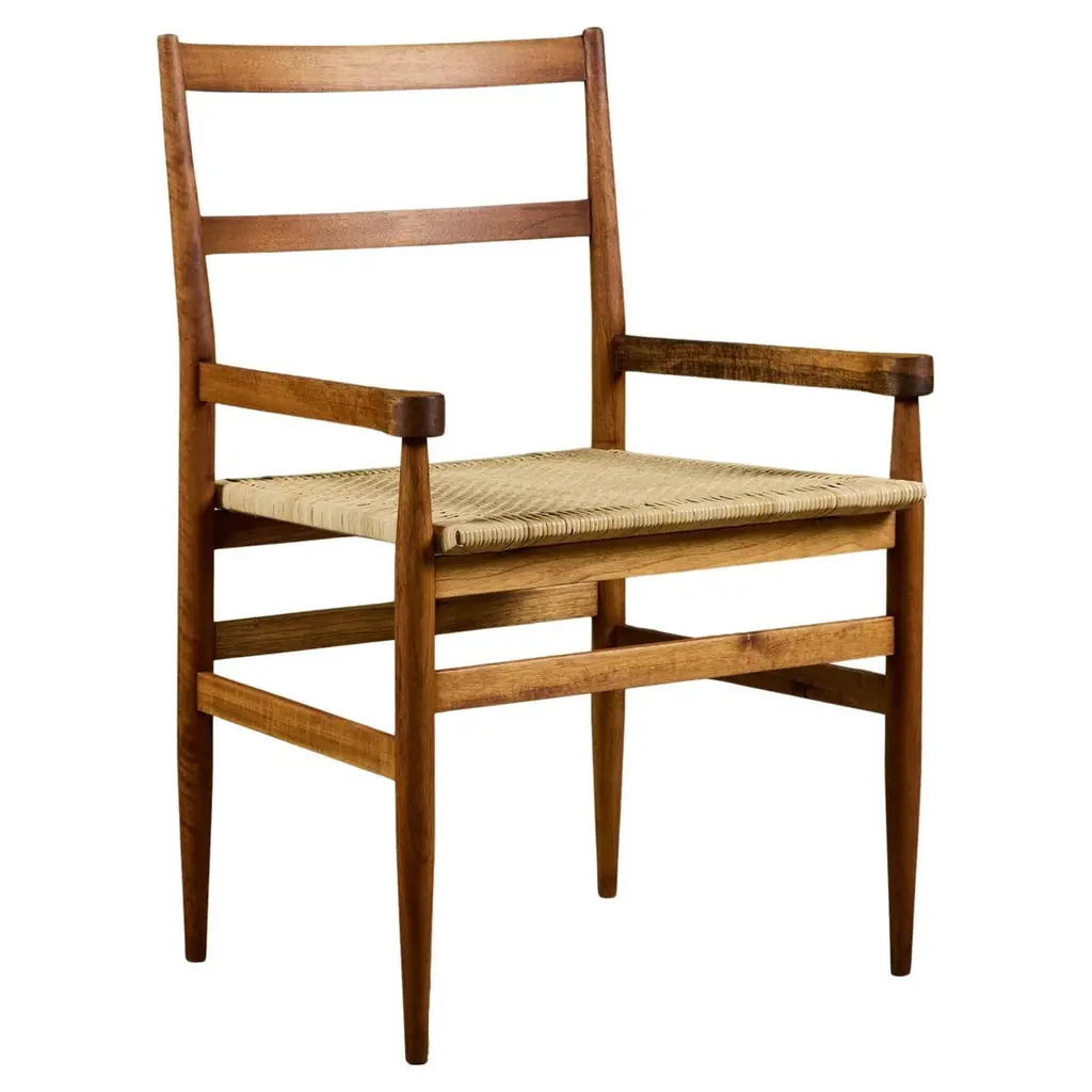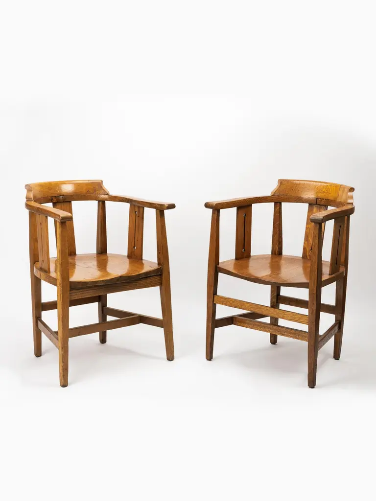 Arts & Crafts mastery abounds in these classic English oak armchairs by Shapland & Petter, out of England. The peg joinery and hand carved oak is a masterclass in traditional woodworking.The finish on these chairs are a beautiful medium oak color, and their rich patina injects old world warmth in any space they are placed.Please note, we have 2 chairs available, each with slight variations in construction, namely the placement of the front stretcher. If ordering just one, please let us know which chair you prefer. Each chair is remarkably solid, and have previously completed repairs.