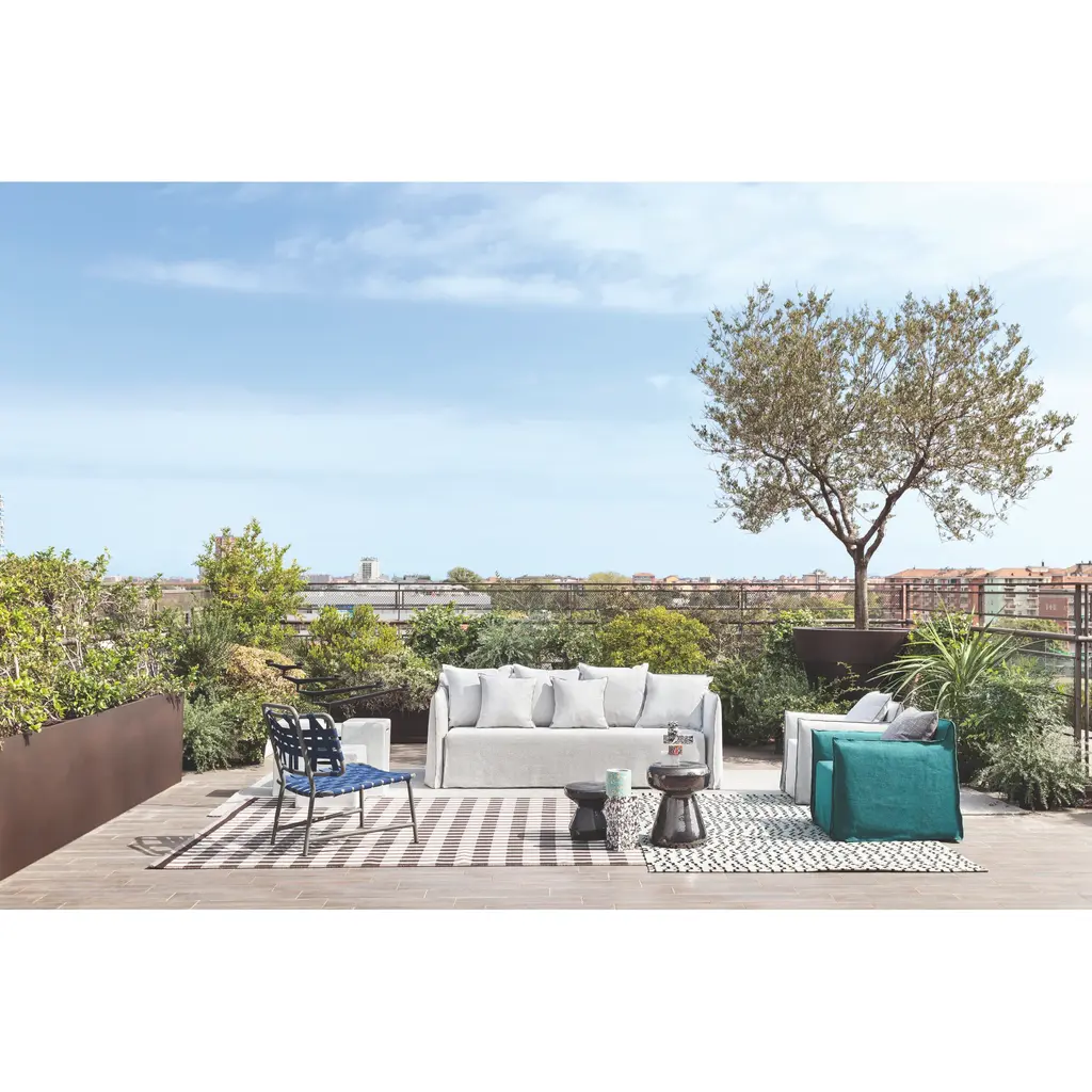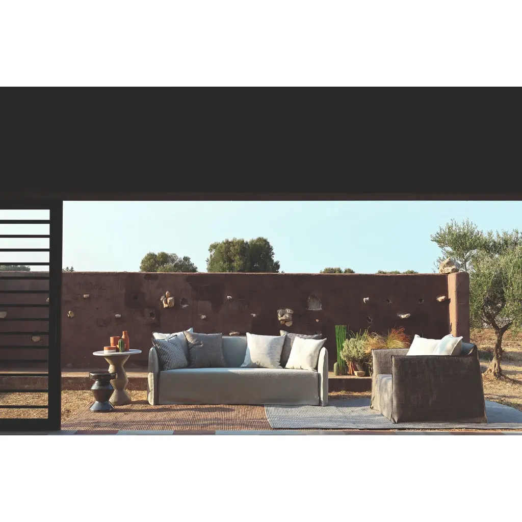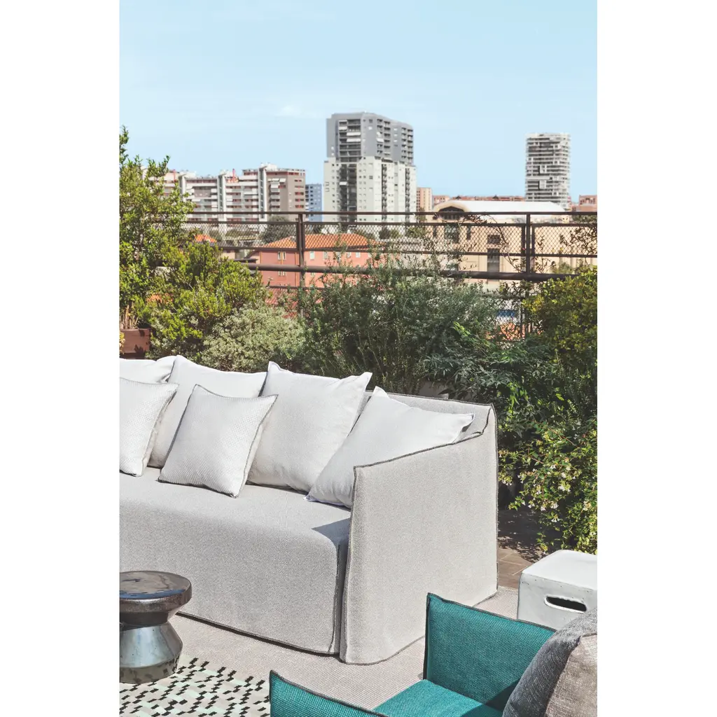 Introducing the Gervasoni's Ghost Aspen Outdoor Armchair, a perfect blend of comfort, style, and durability. This padded armchair is thoughtfully designed with water and sunlight-resistant materials, ensuring it stands up to the elements while maintaining its sophisticated look. Its geometric structure, combined with plush, loose cushions, creates a cozy seating experience. The oversized, removable upholstery adds a touch of luxury and allows you to easily refresh its appearance. Visible stitching enhances its refined design, adding a hint of modernity.