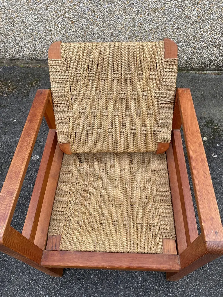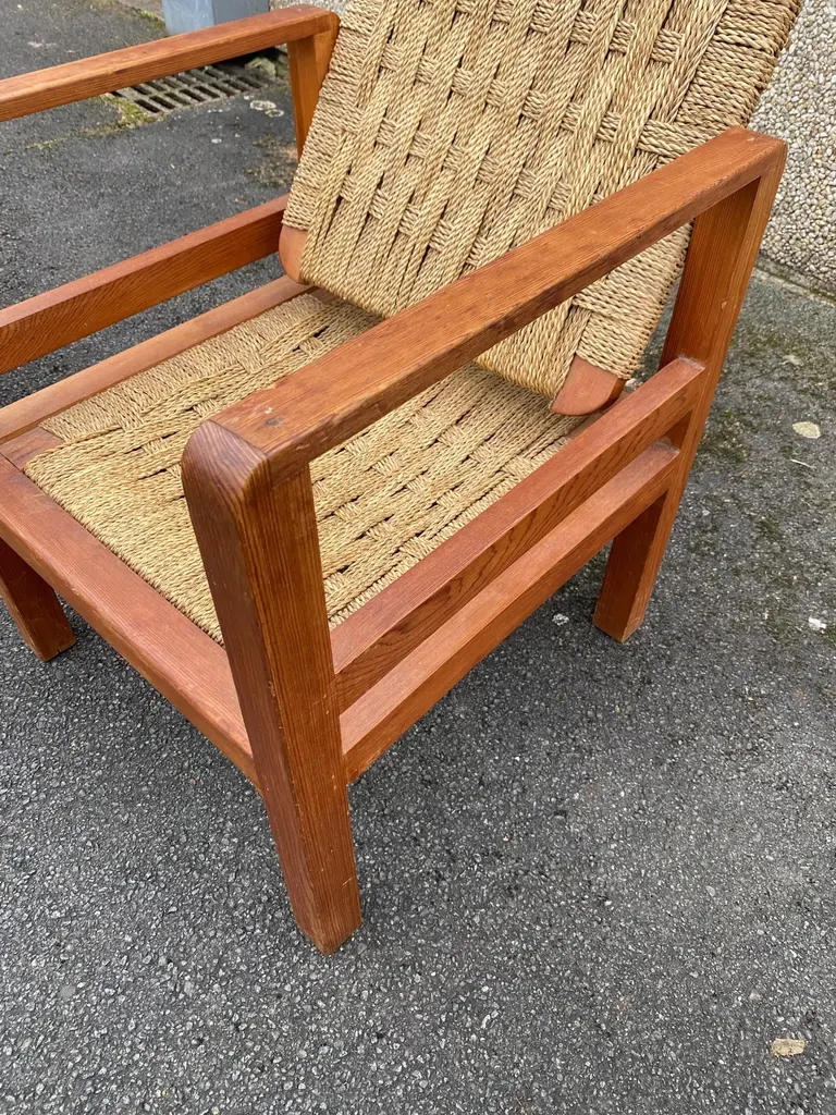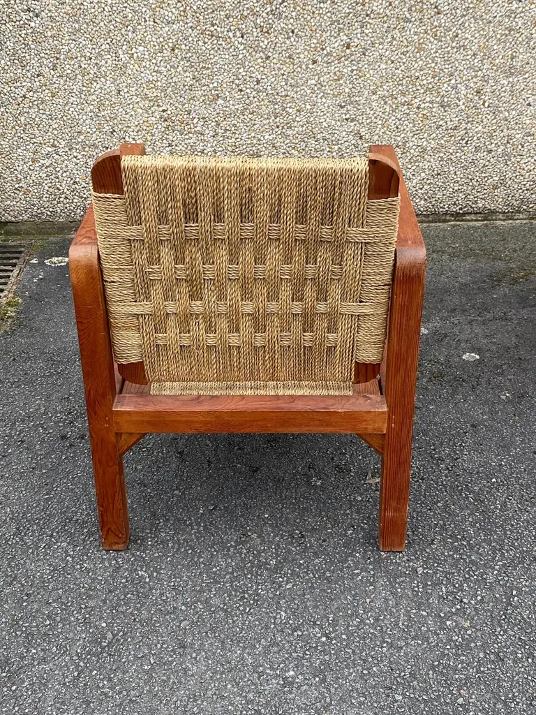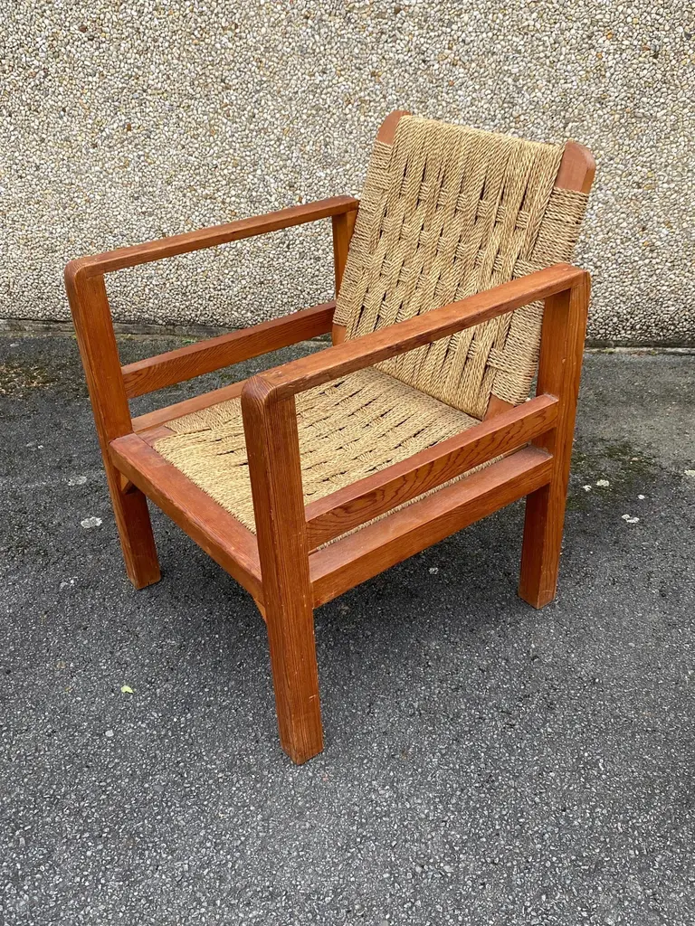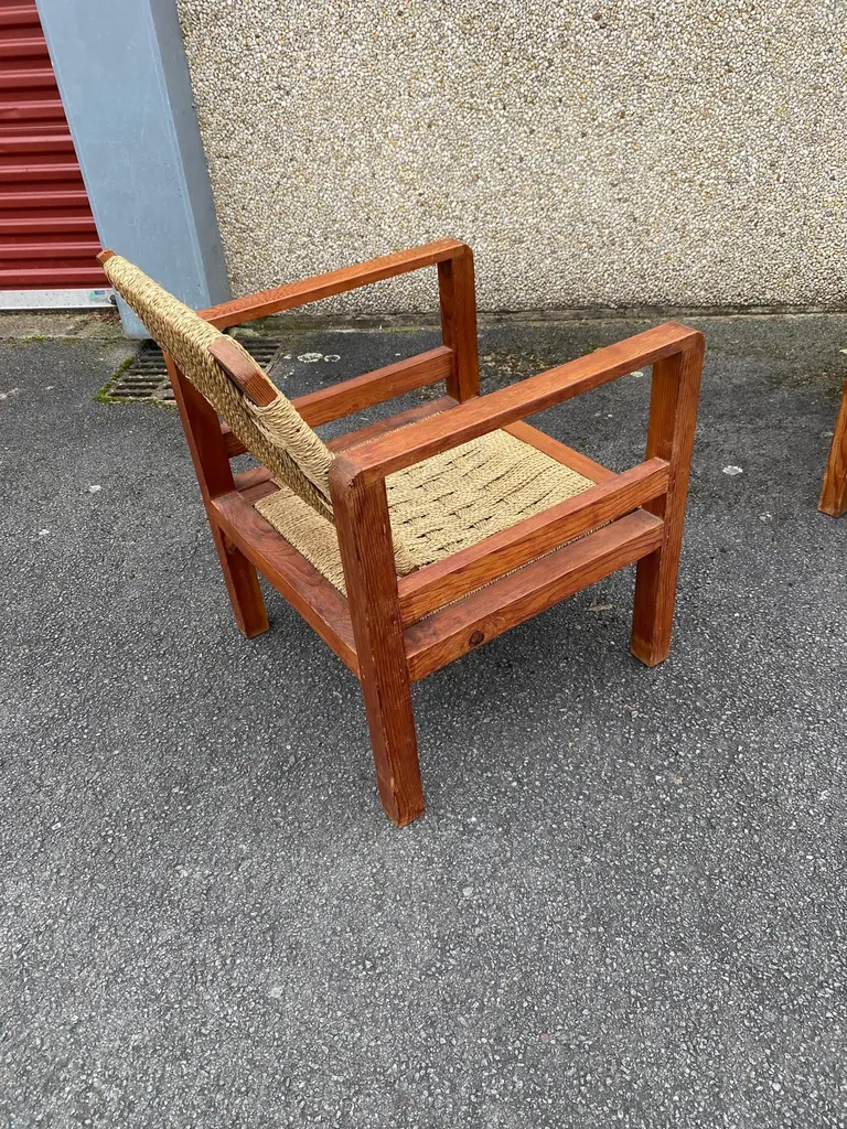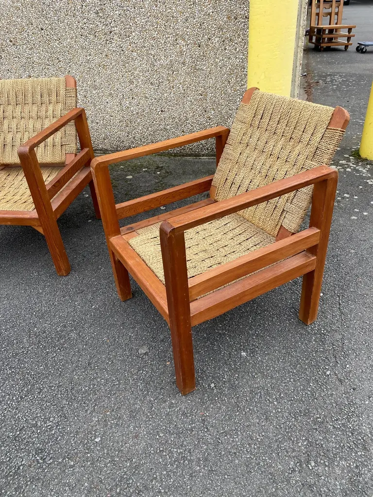 Audoux-Minet (attributed to ) 3 armchairs circa 1950in pine and rope, the tilting backrest.Beautiful patina, wood and rope in very good condition.No restoration to be expected