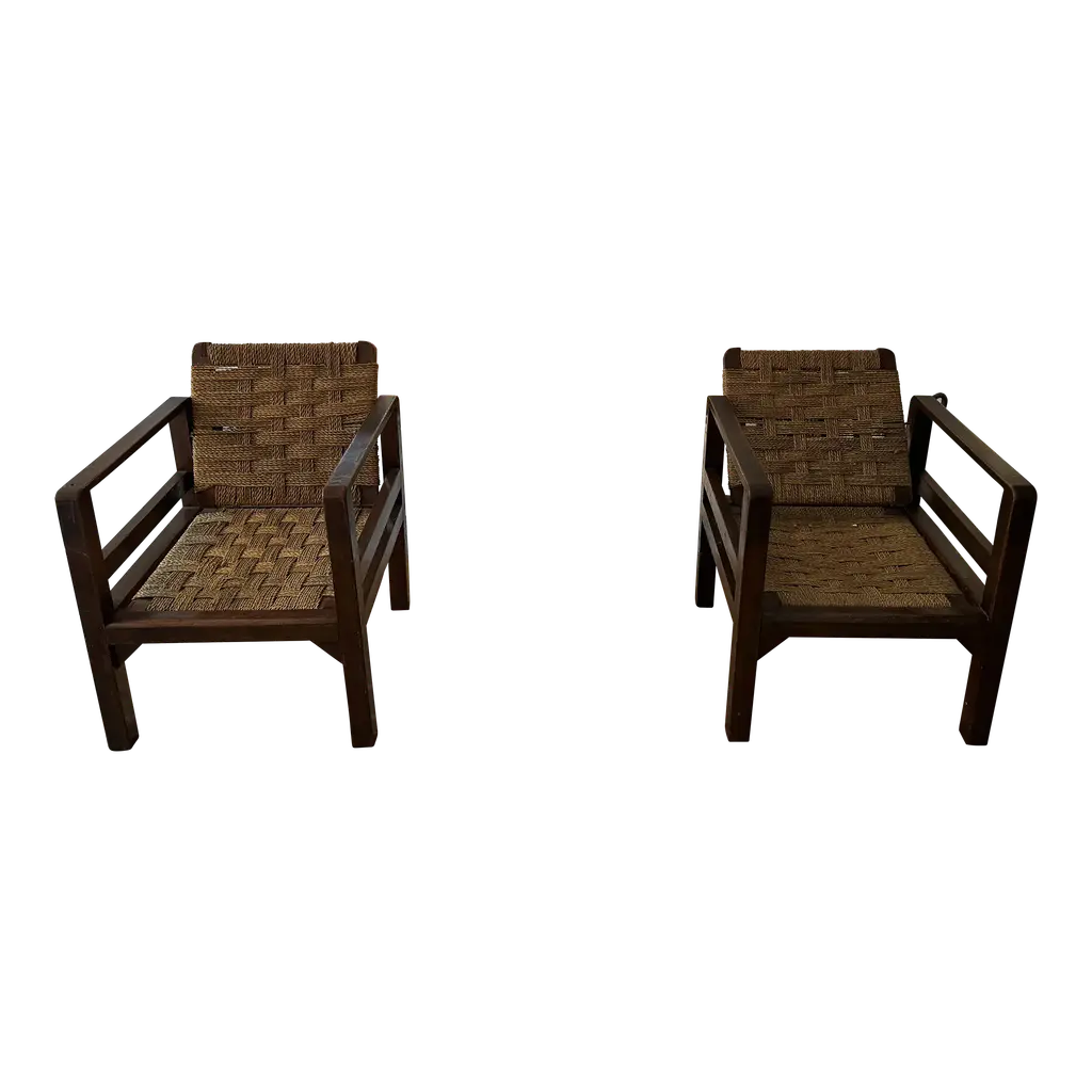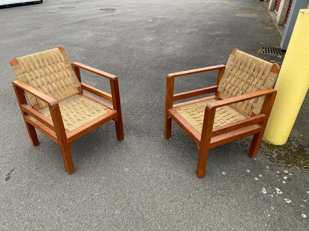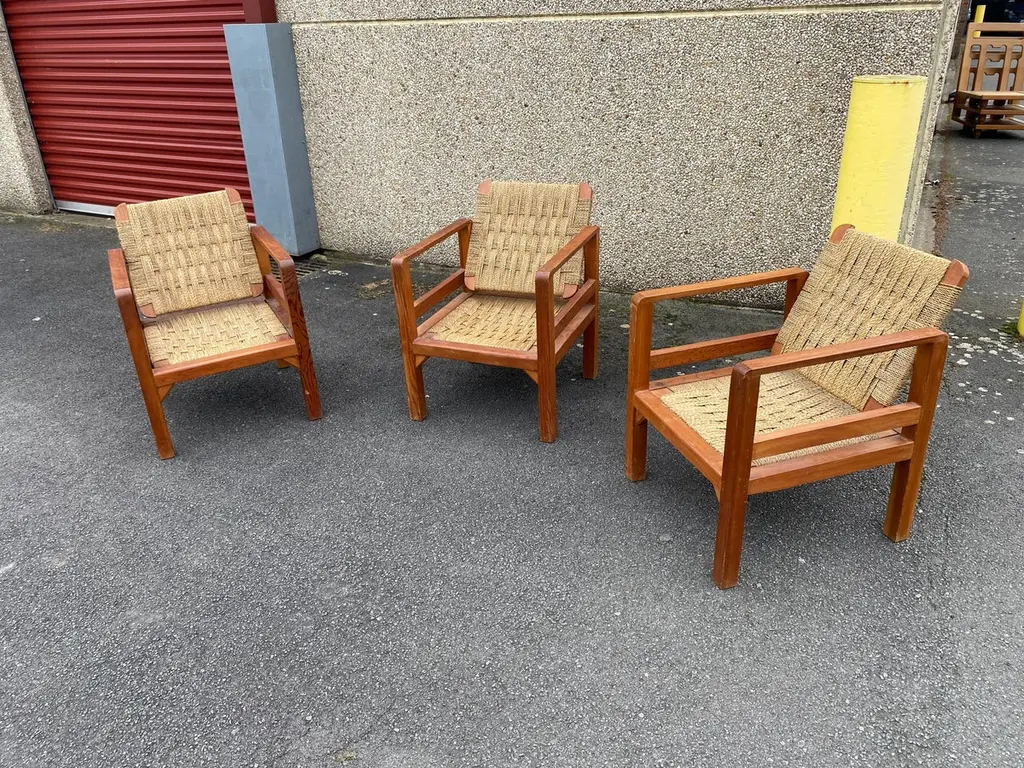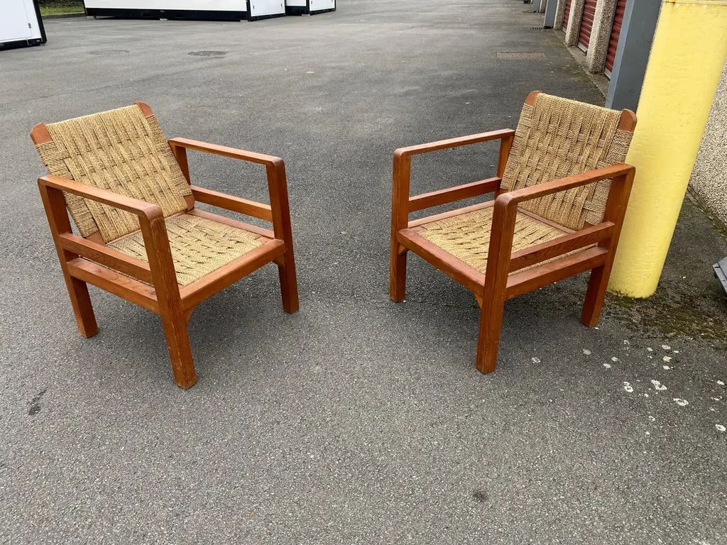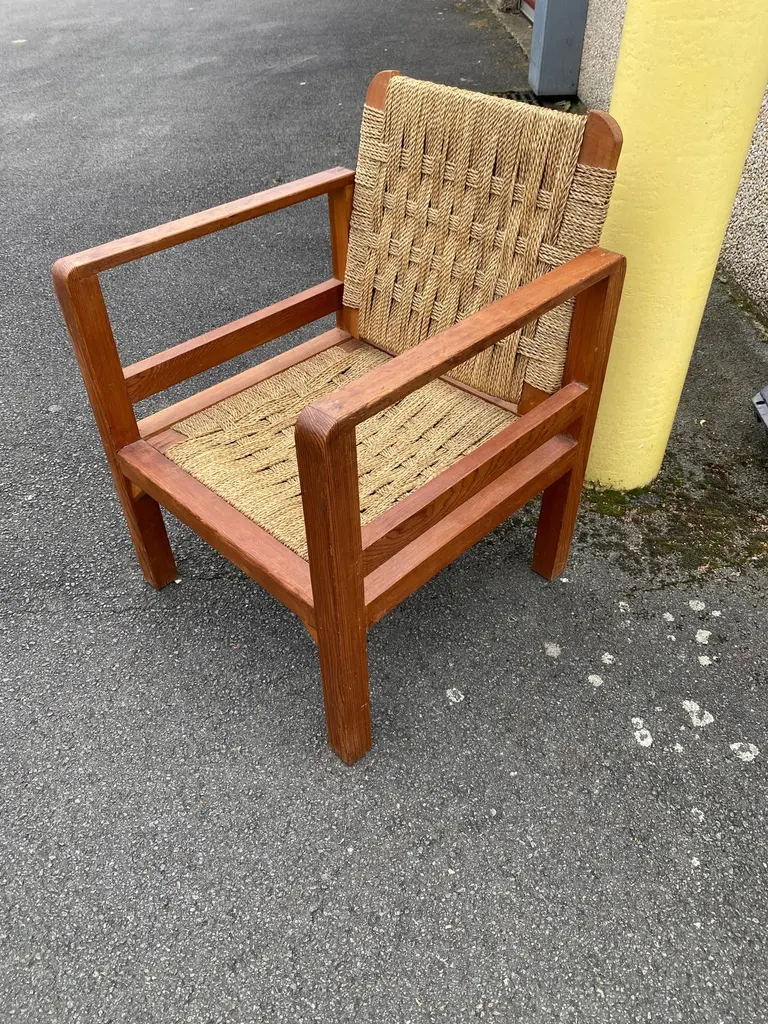 Audoux-Minet (attributed to ) 3 armchairs circa 1950in pine and rope, the tilting backrest.Beautiful patina, wood and rope in very good condition.No restoration to be expected
