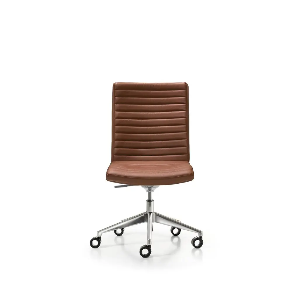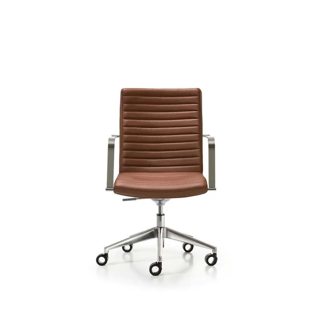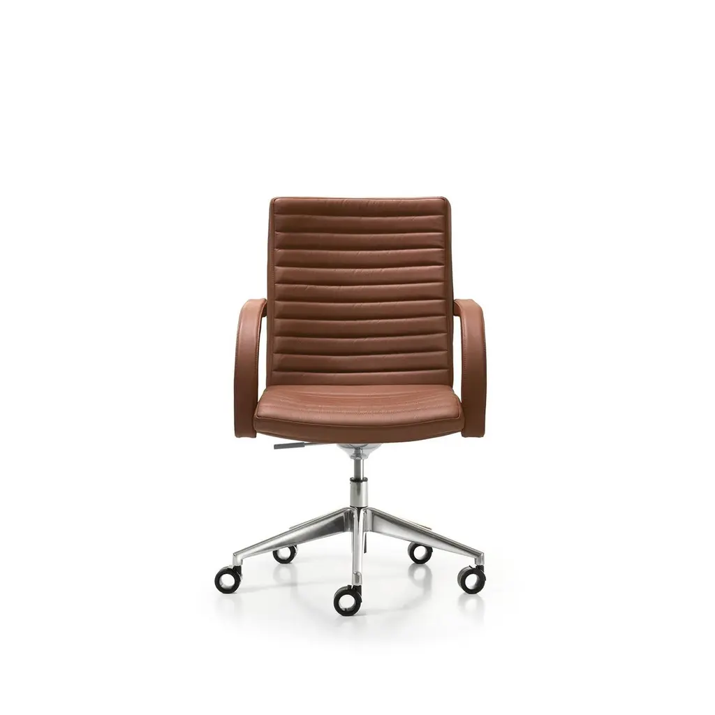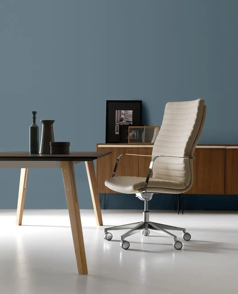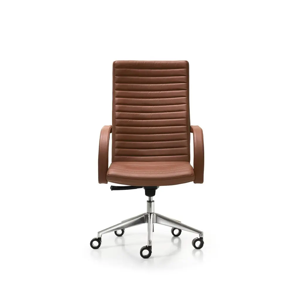 Aurora High Backrest Executive Upholstered Armchair by Quinti SeduteDimensions: D 68 x W 68 x H 120 cm.Materials: Aluminum and upholstery.Available in different finishes, sizes, and material options. Dimensions and prices may vary. Please contact us.The soft padding, highlighted by the horizontal stitching, creates a new level of comfort and practicality. The roundish, welcoming shape joins well with the mono-shell in a creative yet customisable way.The chair can be ordered with a low or high backrest. It provides an M8 swivel plate mechanism and a 5 aluminium spoke base. In the version Aurora Full, the armrests are upholstered.Quinti was founded in 1975 and develops its activity in the mechanical sector as a producer of metal components for chairs and sofas.1993 is a turning point in the company's history: the arrival of Mirko Quinti begins an unstoppable development process that still lasts nowadays.Now Quinti produces office and home furniture such as executive and operative chairs, tables, upholstered armchairs, and sofas.Over the years, all the processes have been internalized, and the collaboration with famous designers has made the products internationally recognized. Above all, the Company organized itself with a young and competent staff, able to face every challenge with enthusiasm.Creating a new product means following every single moment with care and attention. We combine the search for original shapes with the desire to create practical and functional products. To the value of tradition and of well-done things, that represents our starting point, we add a marked sensitivity for the search for materials, for the combinations able to surprise, and for the care of details that make each product unique and personal.We apply all our experience to actively promote the protection of the environment, taking into account, already at the initial stage of product creation and development, all the variables so that they weigh as little as possible on environmental resources. The 75 kW photovoltaic system allows the complete autonomy of the two plants, guaranteeing maximum energy efficiency.