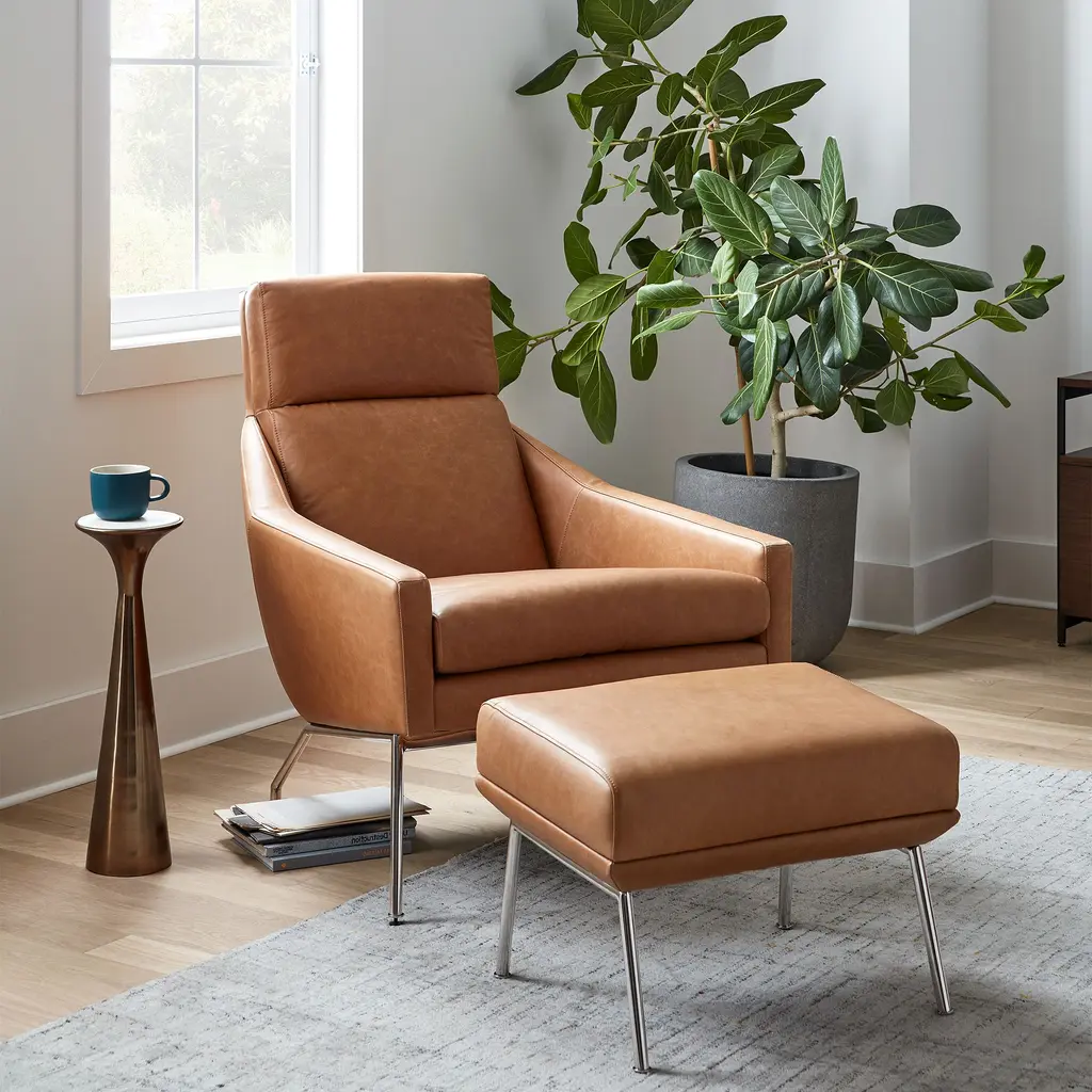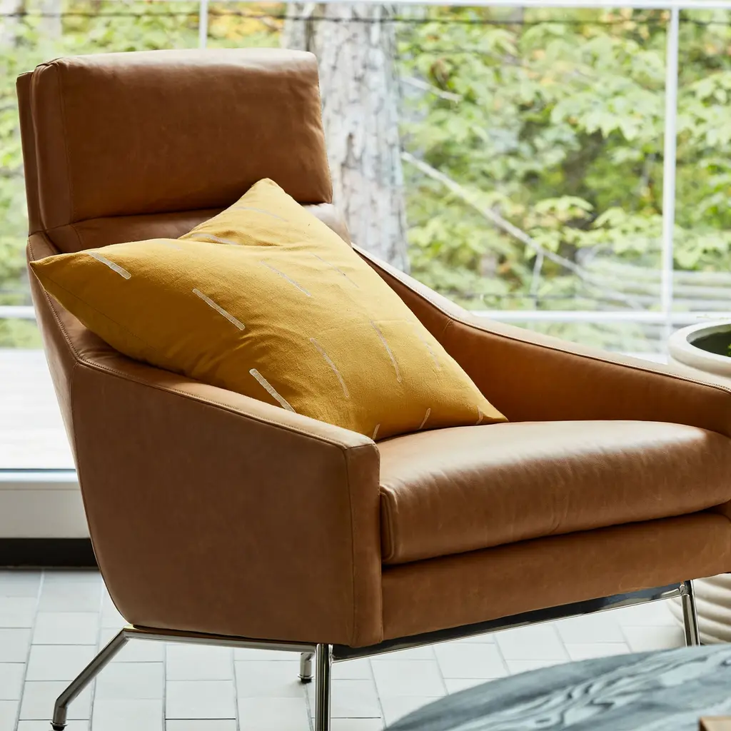 Featuring a roomy, sink-right-in seat, our Austin Leather Armchair is where comfort meets style. Its cushioned back, gently sloped arms and matching ottoman (sold separately) make this the ultimate lounging look. Available in your choice of leather.