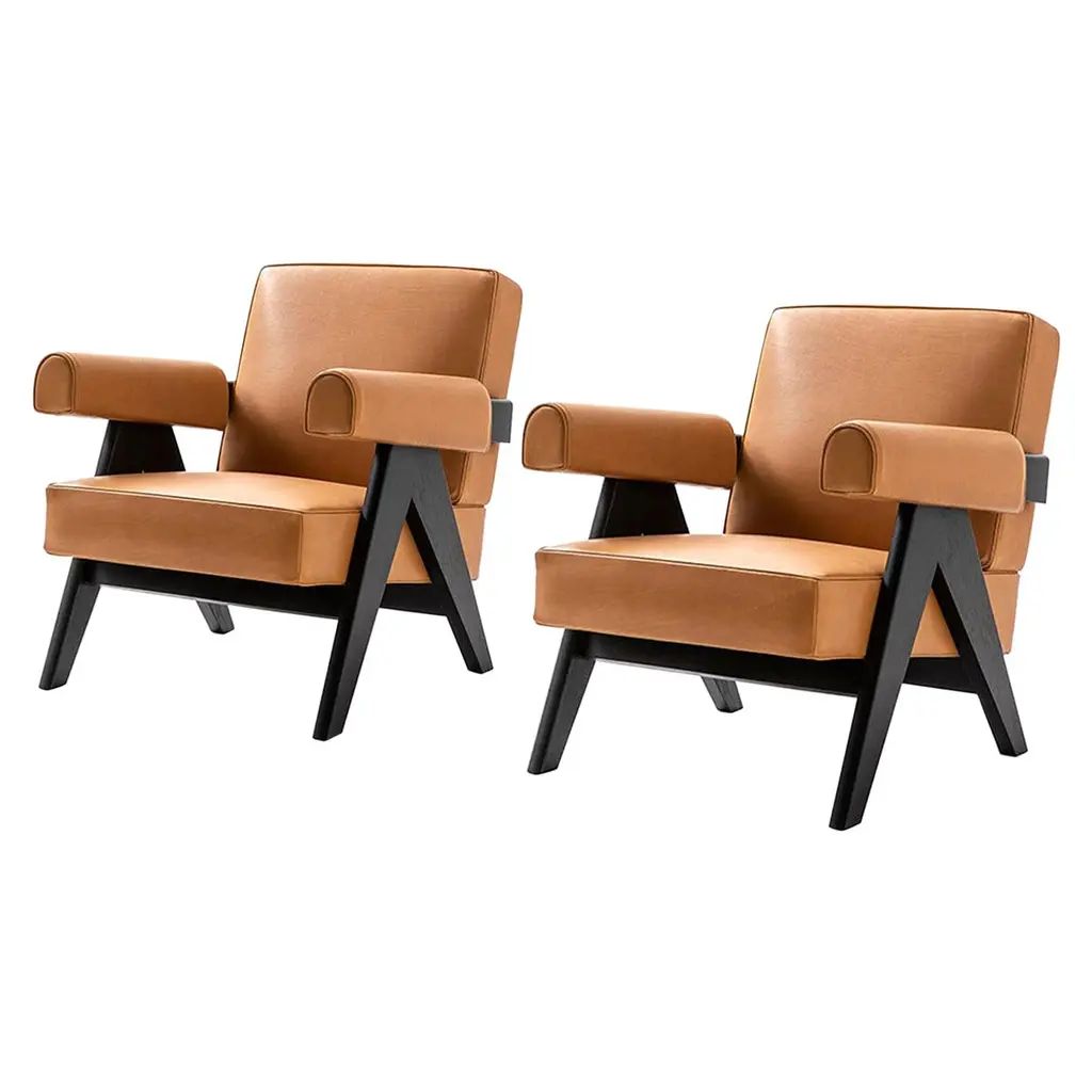 Available Now Midcentury Modern Style Set Of Two Armchairs In Walnut & Leather
