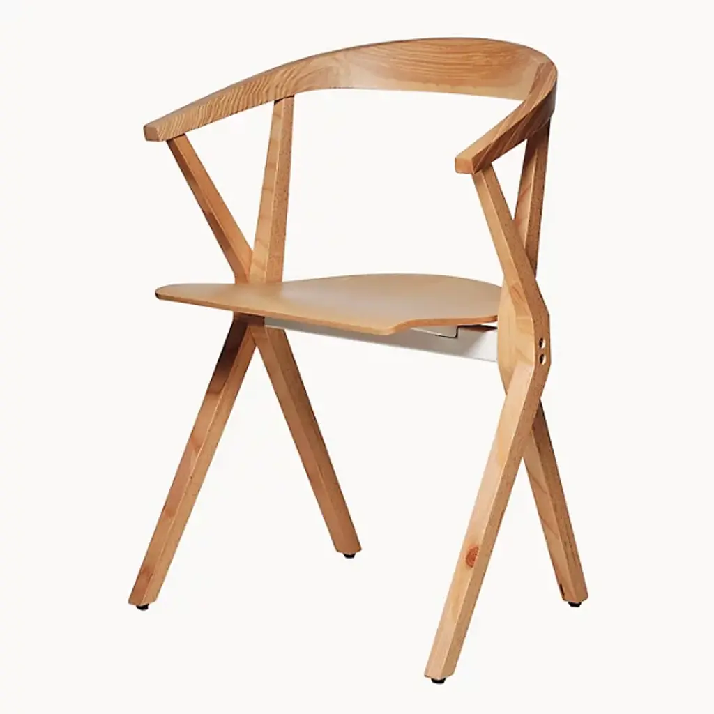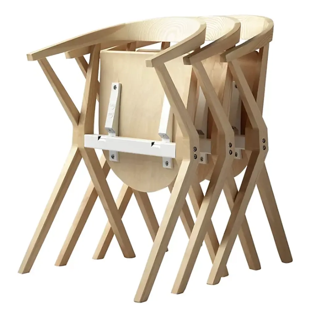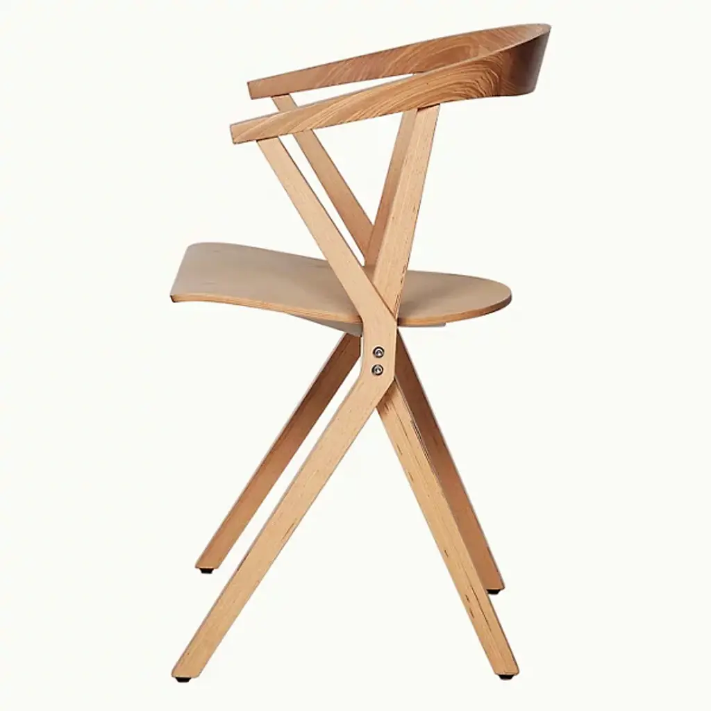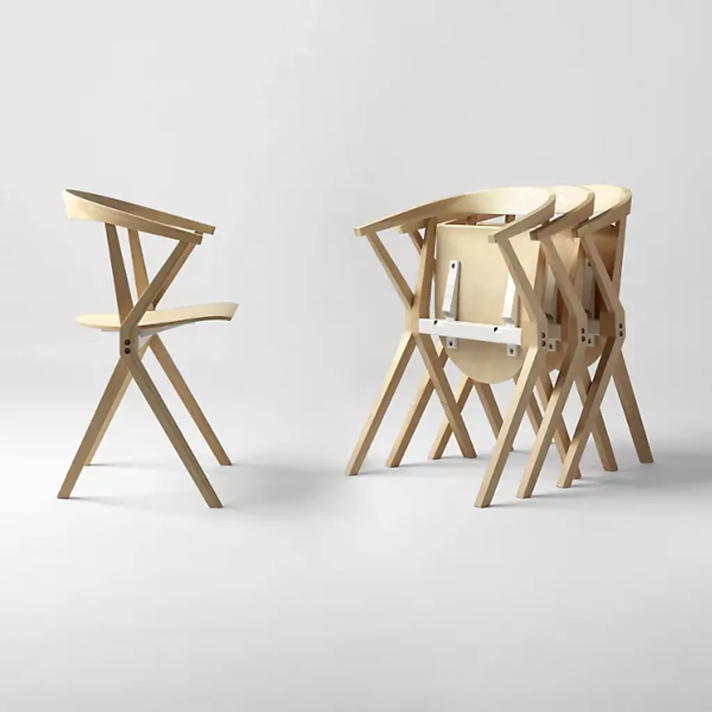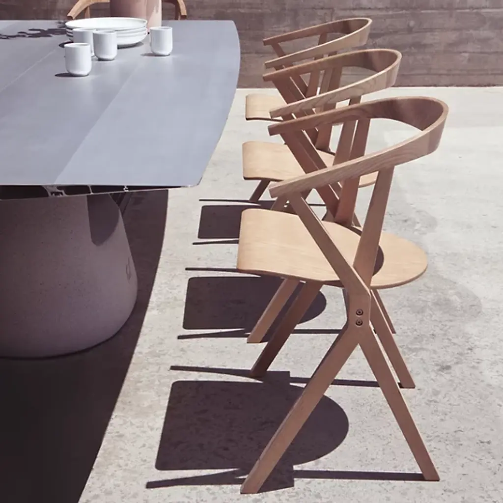 Provide a refined accompaniment to inside spaces with the B Folding Armchair, Set of 2 from BD Barcelona. A calculated and award-winning design from the mind of Konstantin Grcic and the first in the Extrusion collection, its complex capabilities are hidden playfully in its externally simple design, making it a standout for established gathering spaces or impromptu meetings. Fashioned from slender beams of robust wood set atop felt glides, four angular legs ascend to a foldable seat with cast aluminum reinforcement, while an arcing back offers simple but standout support. The seats can also be stacked depending on the space available, adding comfort and style whenever they are taken out and deployed.