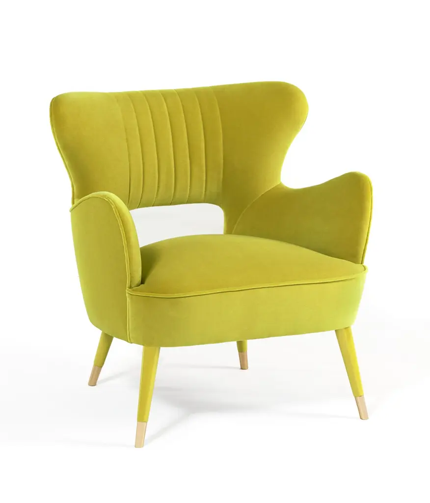 Babe Armchair by MunnaDimensions: D 69 x W 69 x H 74 cm. SH: 44 cm.Materials: Solid wood, foam, brass, and upholstery.Finish: Cotton Velvet Lime, lacquer legs, and polished brass feet cover.Available in all Munna fabrics except Wild Silk. Available in client’s ownmaterial. Available upholstered, Rosewood or Ebony veneer, solid Walnut, Wengé stain, or lacquer in all RAL colors, in matt or gloss. Fire retardant interlining is available on request. Handmade in Porto. Please contact us.Established in Porto in 2008, Munna is a furniture design brand renowned for creating handmade upholstery with unmatched craftsmanship, seamlessly blending noble materials and timeless design, for both commercial and residential projects.Made by hand in Porto, Munna’s pieces honor the profound heritage of craftsmanship, while drawing inspiration from history’s most influential artistic periods. Munna’s pieces are made of the finest fabrics such as cotton velvet, twill, leather, and silk; the finest wood veneers, such as ebony, walnut, and rosewood; sumptuous gold, silver, and copper leaves, metal details in brass, nickel, and copper, and superior lacquers.