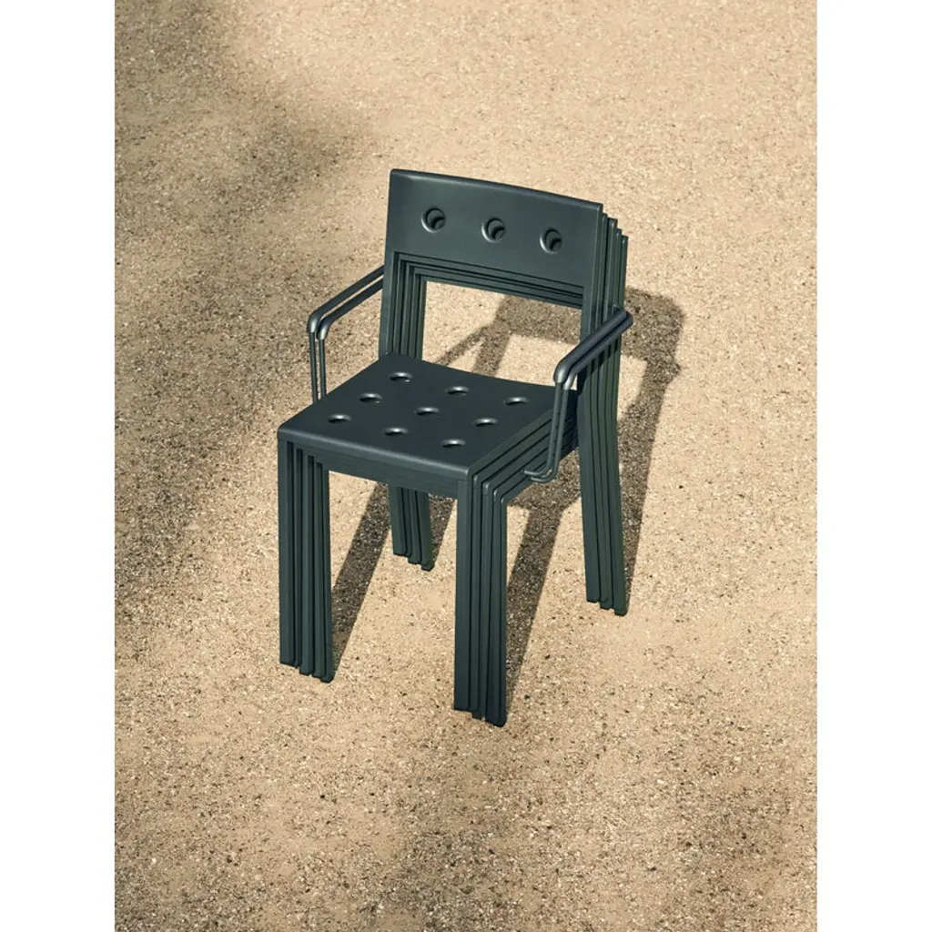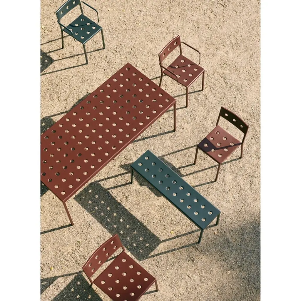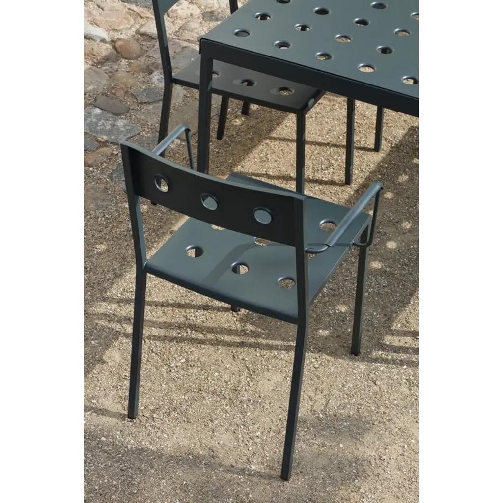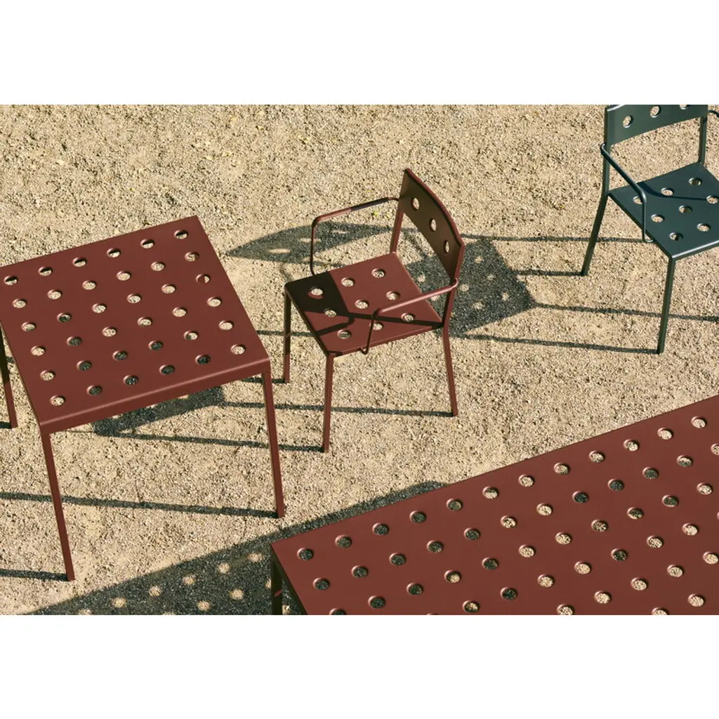 HAY’s Balcony armchair is part of a clever collection of outdoor furniture designed by the Bouroullec brothers. Made of thin steel sheet, the elegant armchairs are incomparably light and easy to move, and they can also be stacked on top of each other to save space, making them a perfect addition to the balcony, the garden or a patio. The round holes pressed through the steel plate provide multiple functions: they add character and softness to the geometrical design and allow rainwater to drain off the chair's surface, while also strengthening the structure of the furniture. Featuring a weather-resistant coating the Balcony collection is as carefree as it looks. Add some extra comfort and complete the look with Balcony cushions, sold separately.