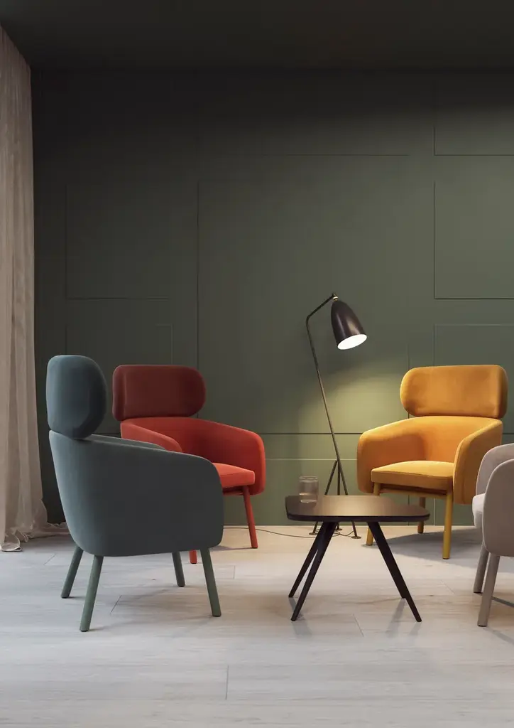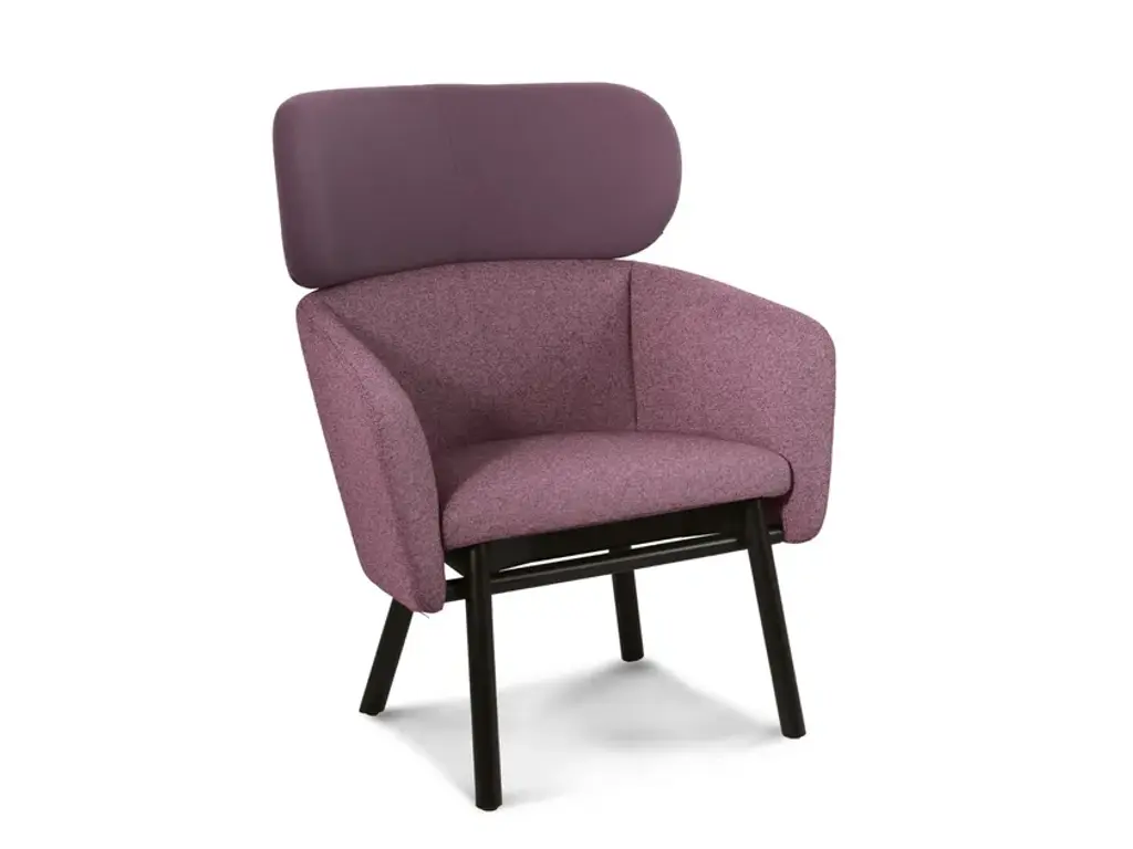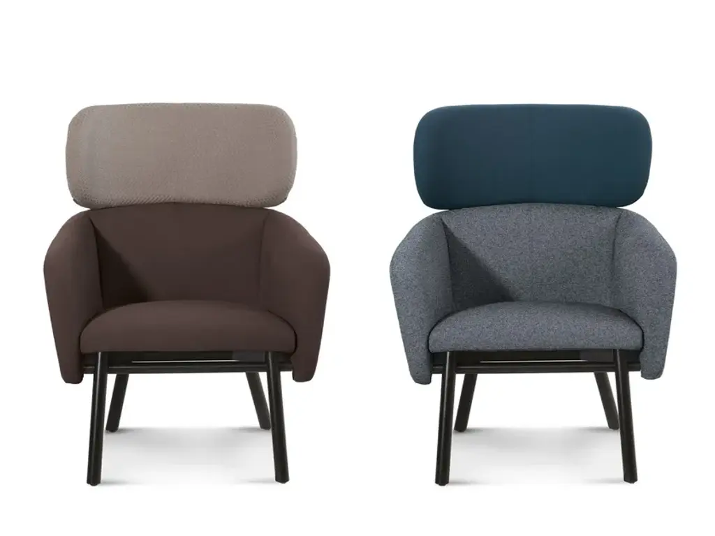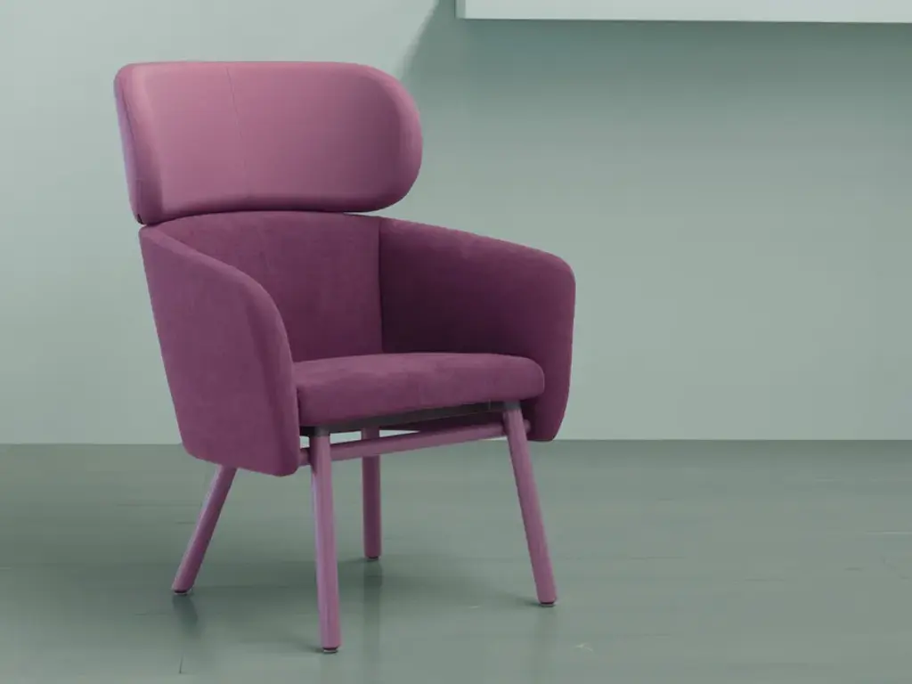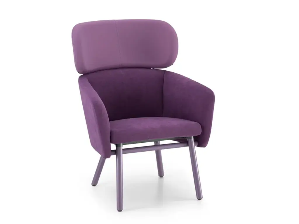 Upholstered armchair with high back, armrest and wooden or painted metal legs from the BALÙ collection, designed by Emilio.