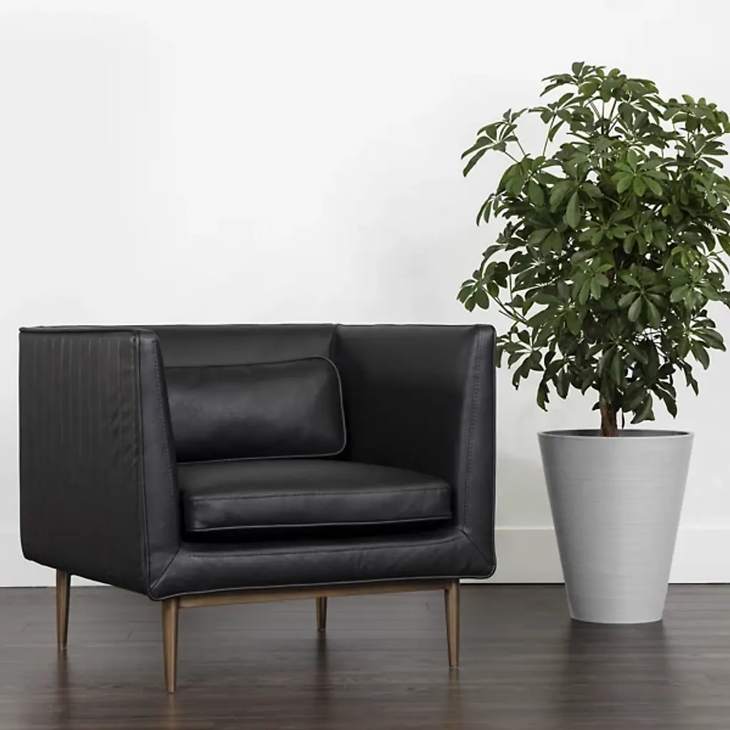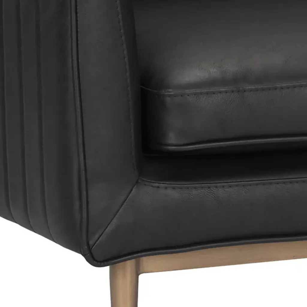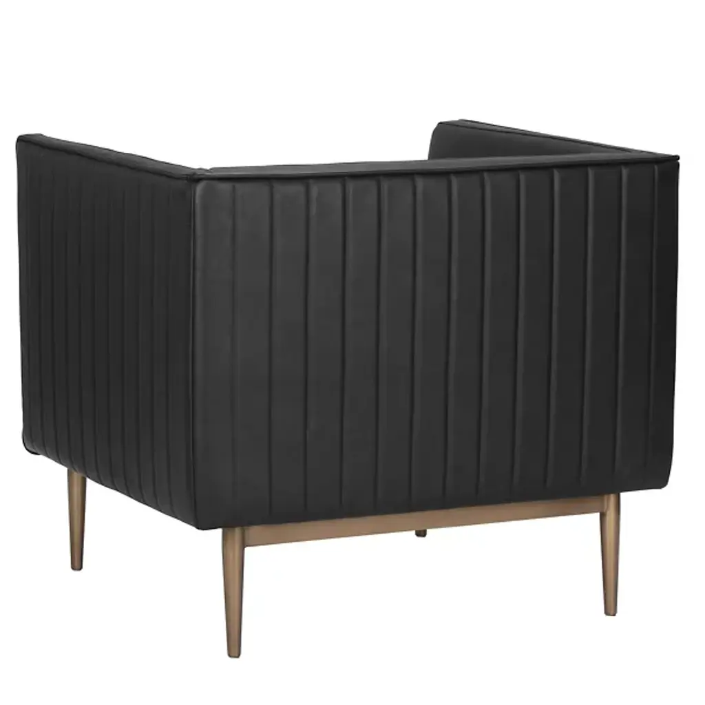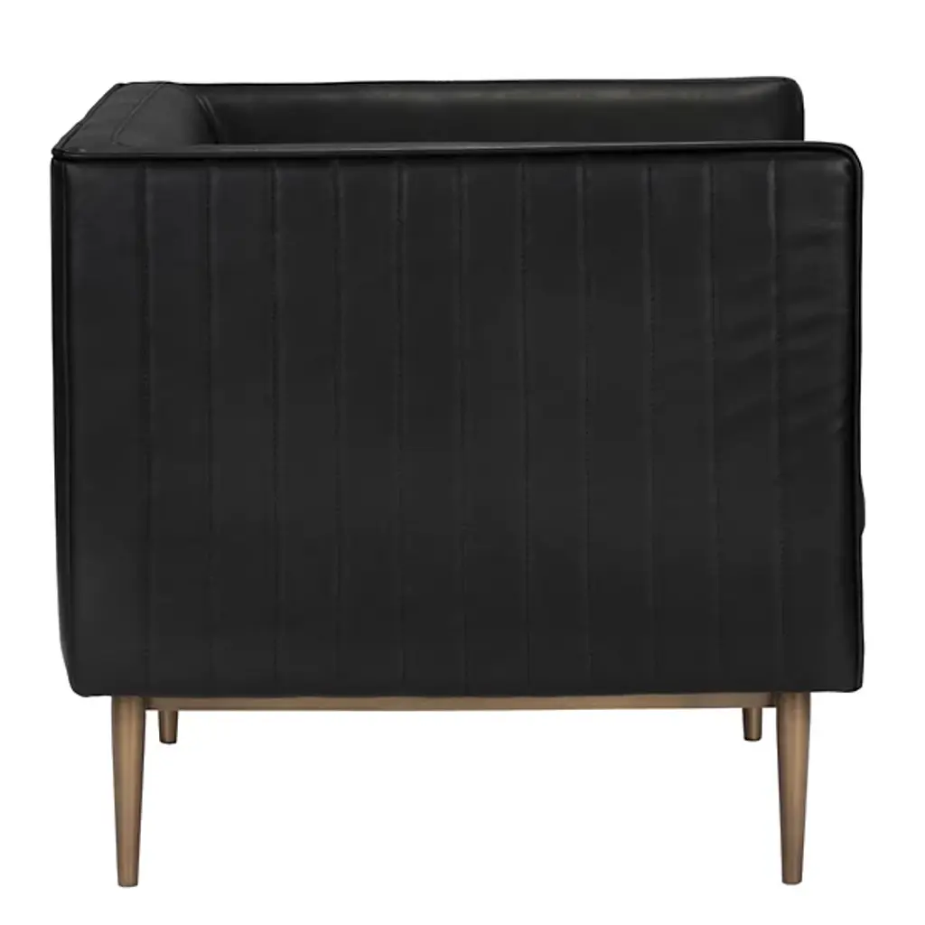The Batavia Armchair from Sunpan features vertical lines through faux leather tufting, creating rhythmic surface patterns across its exterior. A bronze steel framework elevates the upholstered form, adding metallic warmth to the overall composition. The boxy silhouette maintains clean geometric edges while channel tufting introduces textural variety. Piping details define seam lines and structural transitions throughout the design. The cube-like proportions work well for conversation areas where architectural seating creates visual anchors within larger furniture arrangements.