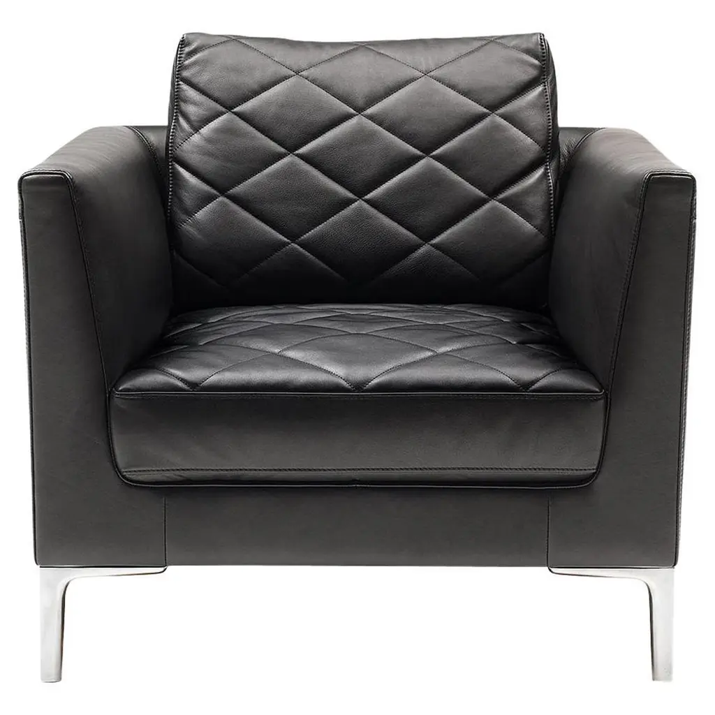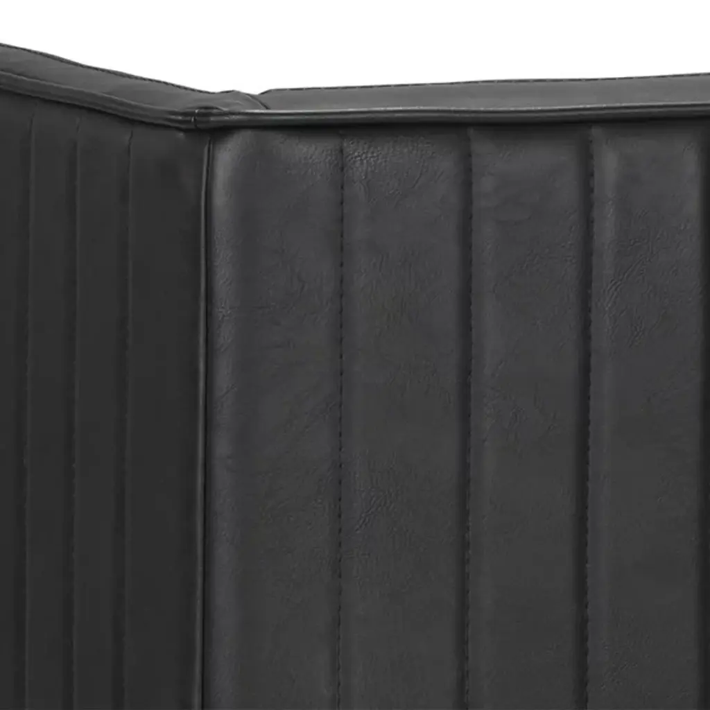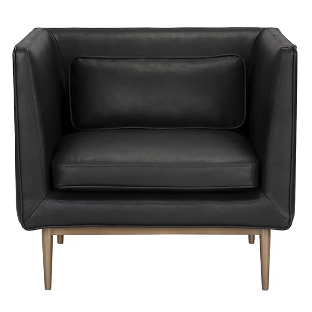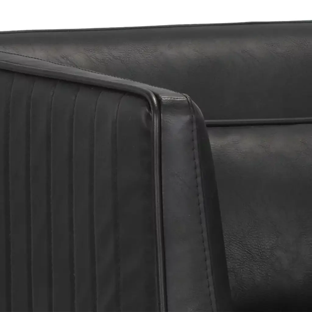 The Batavia Armchair from Sunpan features vertical lines through faux leather tufting, creating rhythmic surface patterns across its exterior. A bronze steel framework elevates the upholstered form, adding metallic warmth to the overall composition. The boxy silhouette maintains clean geometric edges while channel tufting introduces textural variety. Piping details define seam lines and structural transitions throughout the design. The cube-like proportions work well for conversation areas where architectural seating creates visual anchors within larger furniture arrangements.